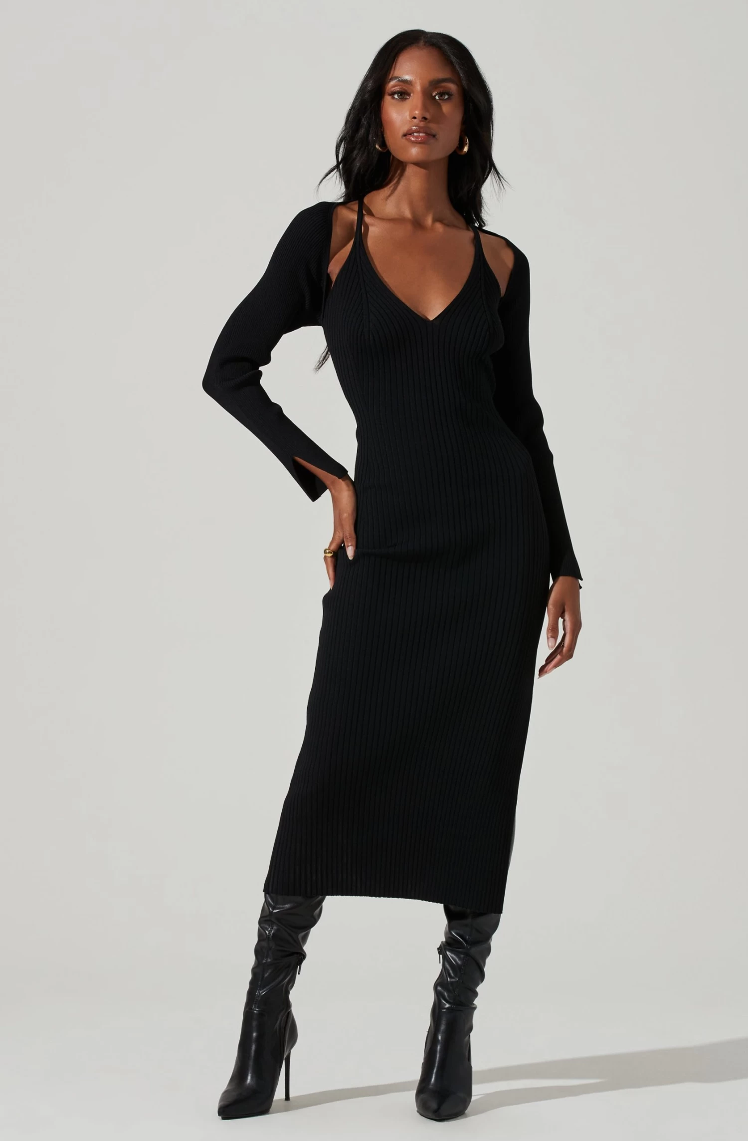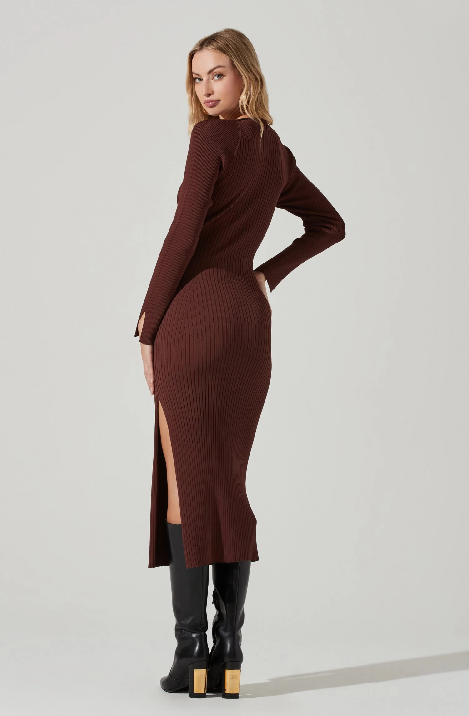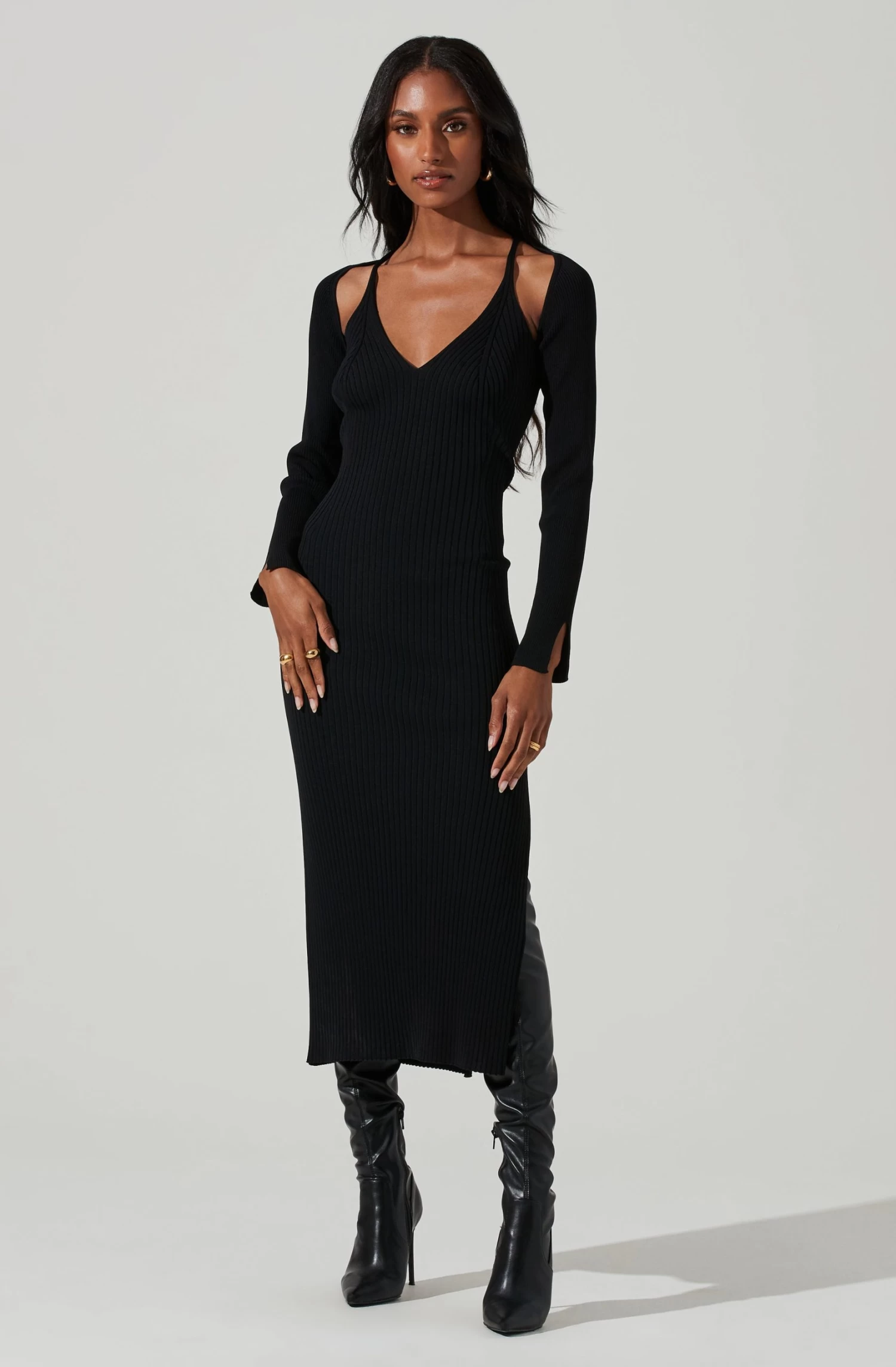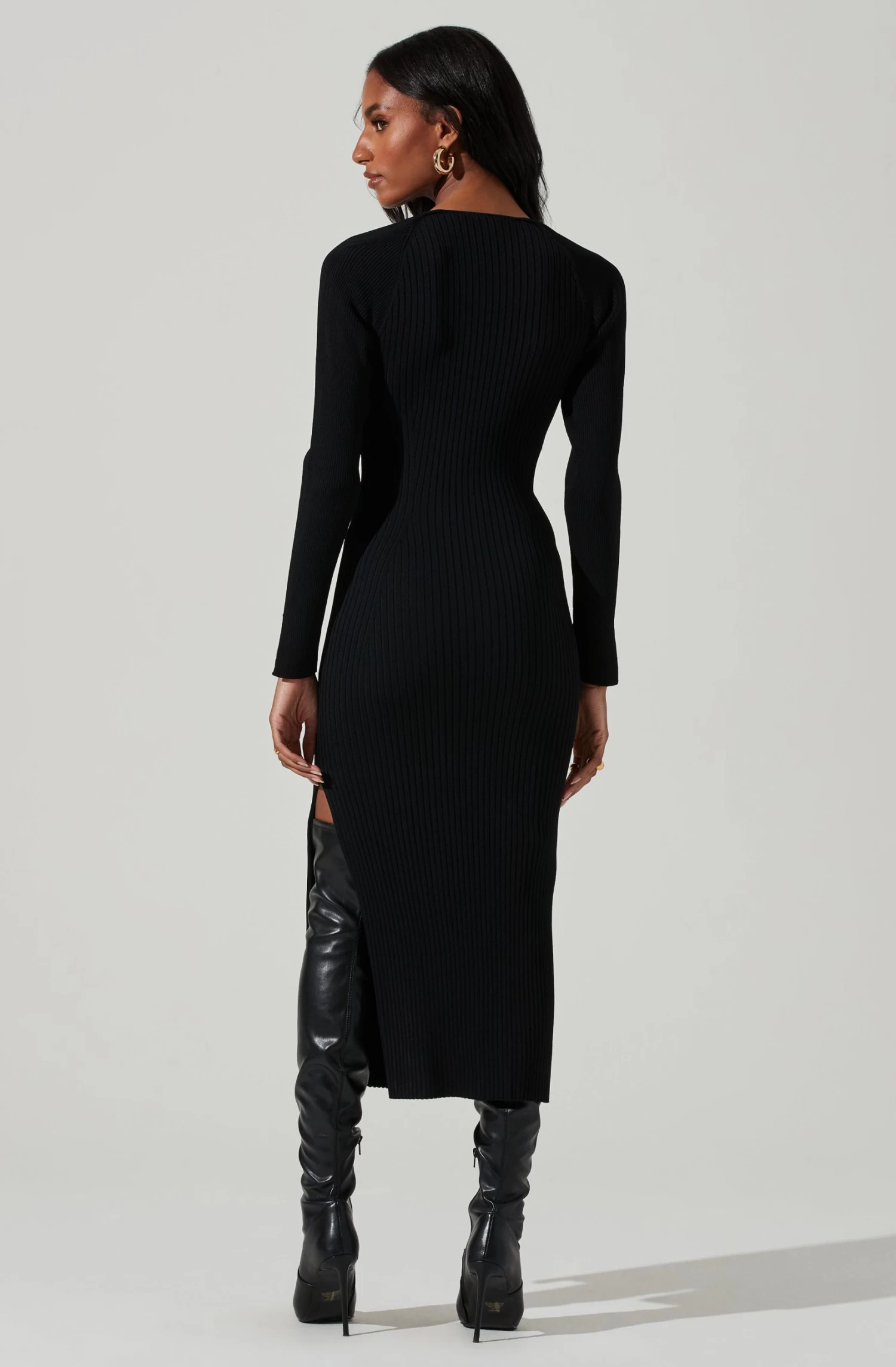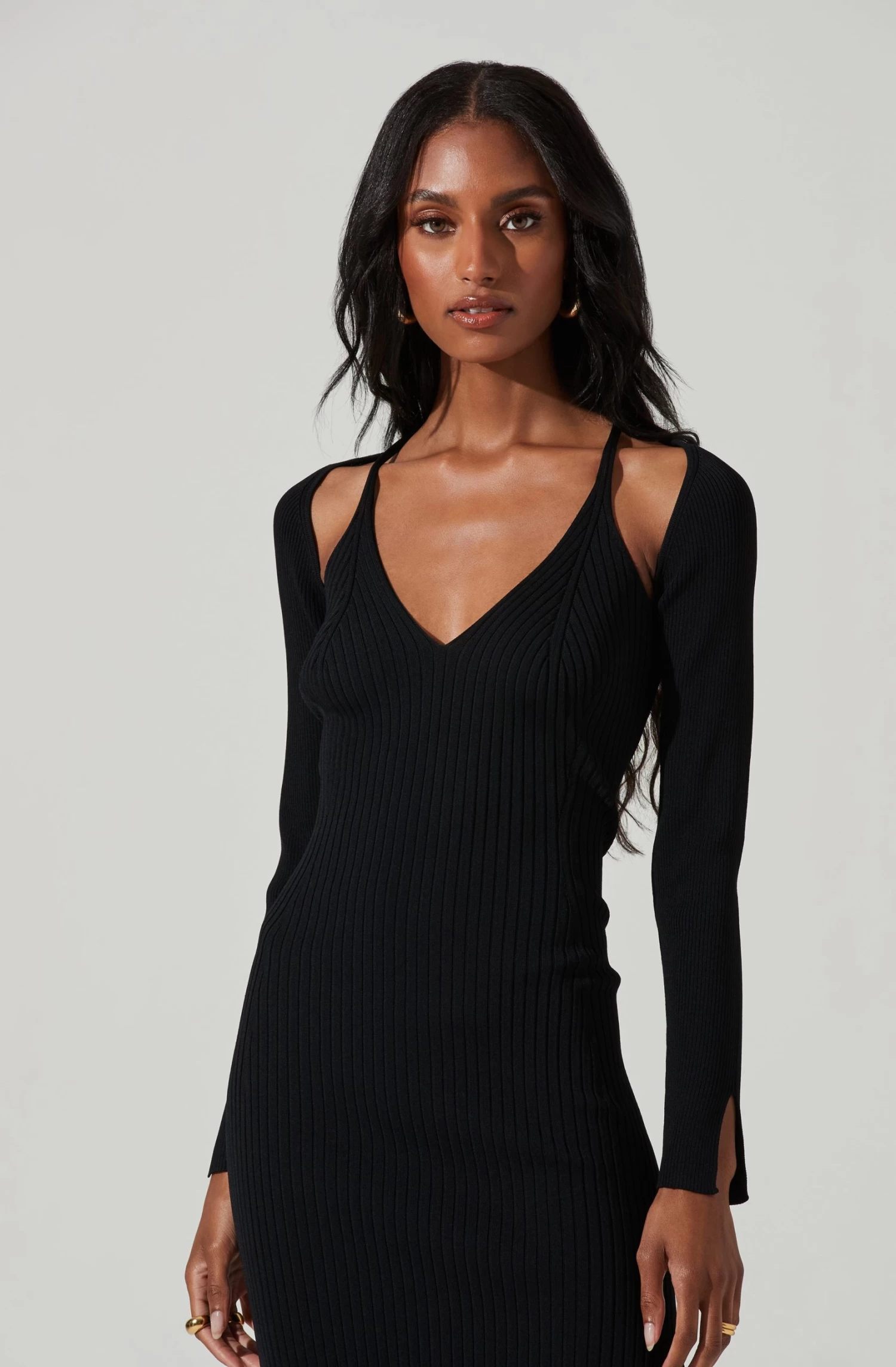 The Abella Dress features a ribbed knit construction and bodycon silhouette. V neckline leads to a midi-length skirt and exaggerated side slit accent. Long sleeves with cutout details at the shoulders. Slight stretch.