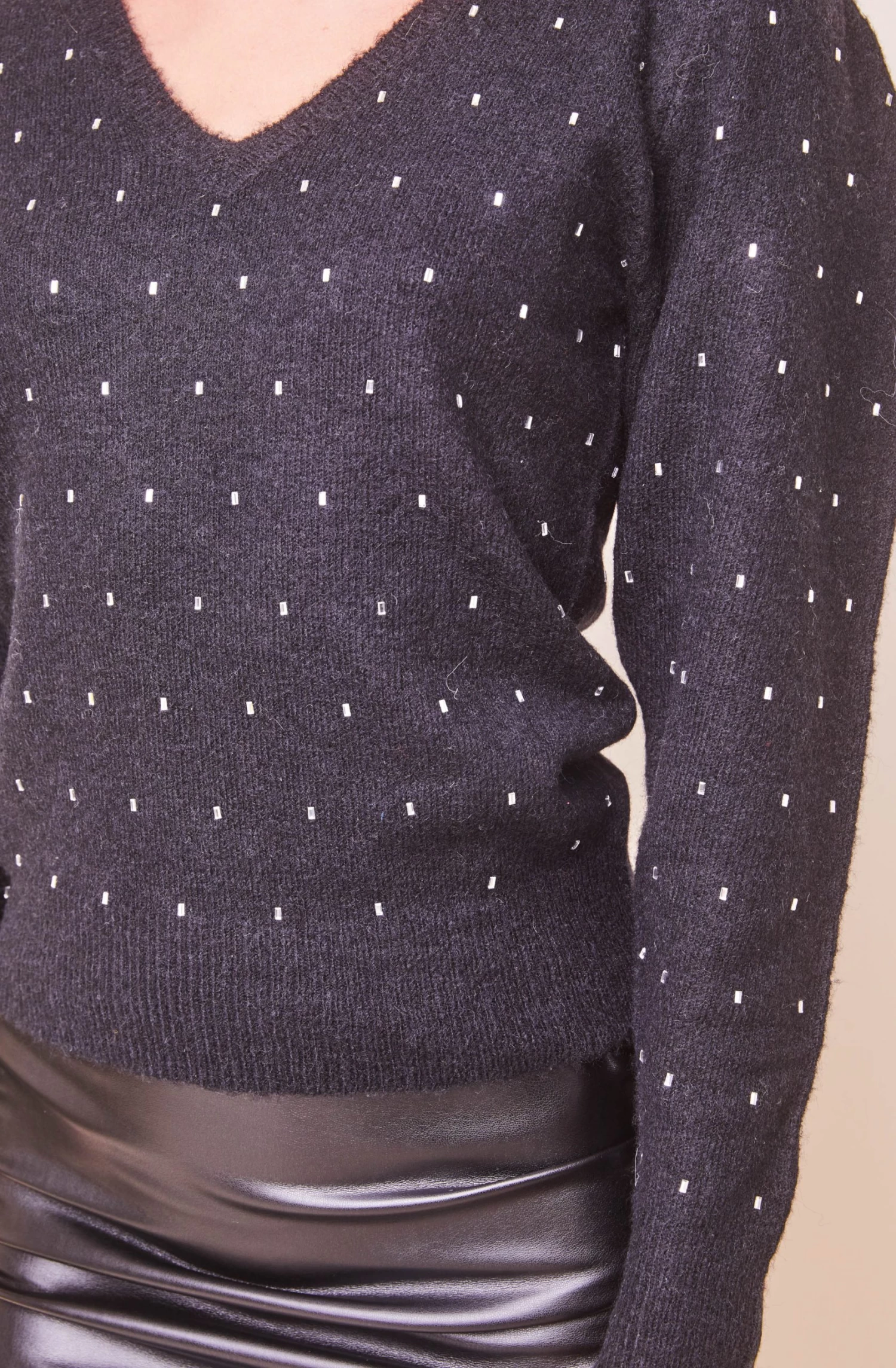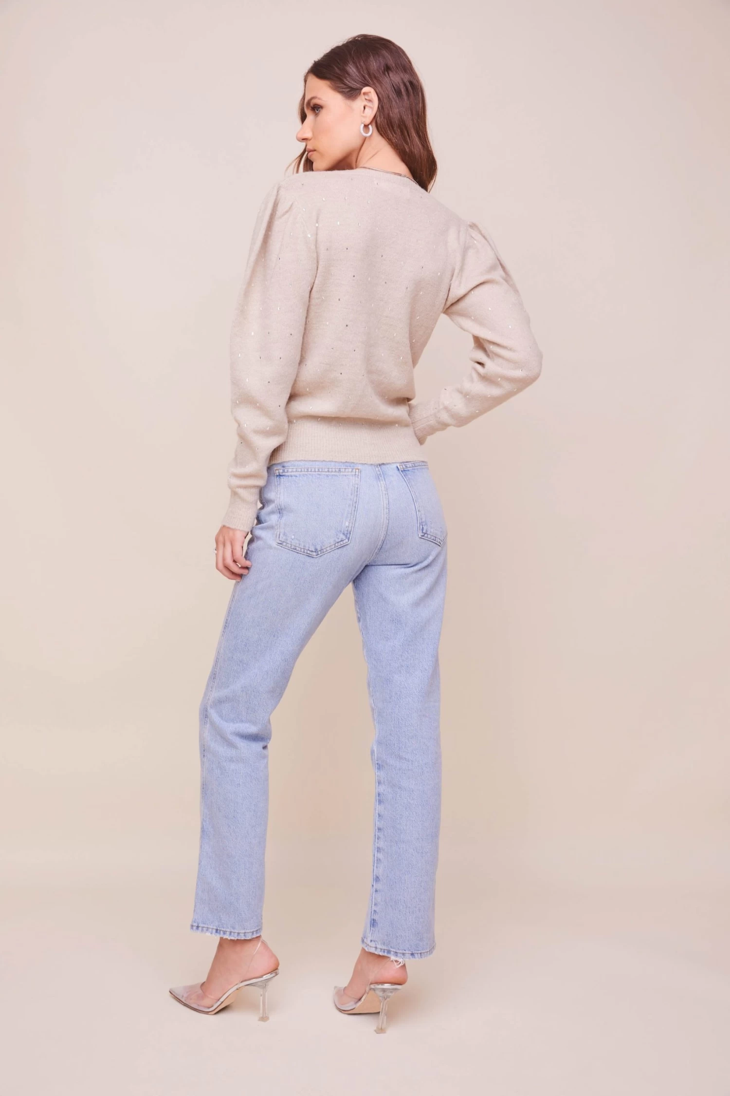 Dazzle up your look! The Abigail Sweater features a V neckline that leads to a relaxed knit bodice embellished with jewels. Long puff sleeves elevate this look.