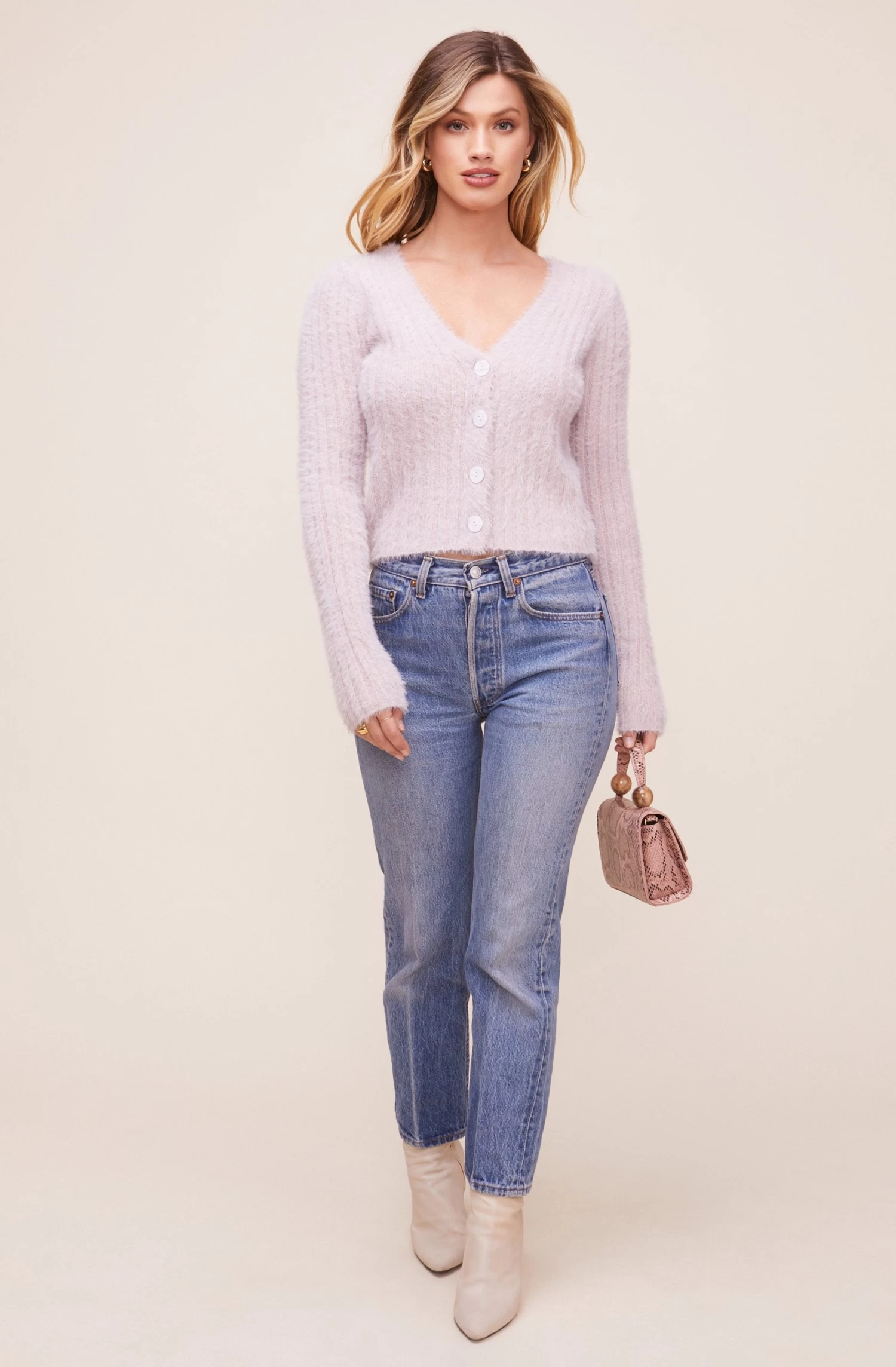 Soften up to the idea of the Amanda Cardigan. This fuzzy style features a V neckline that leads to a front button closure. Long sleeves and ribbed fabric.