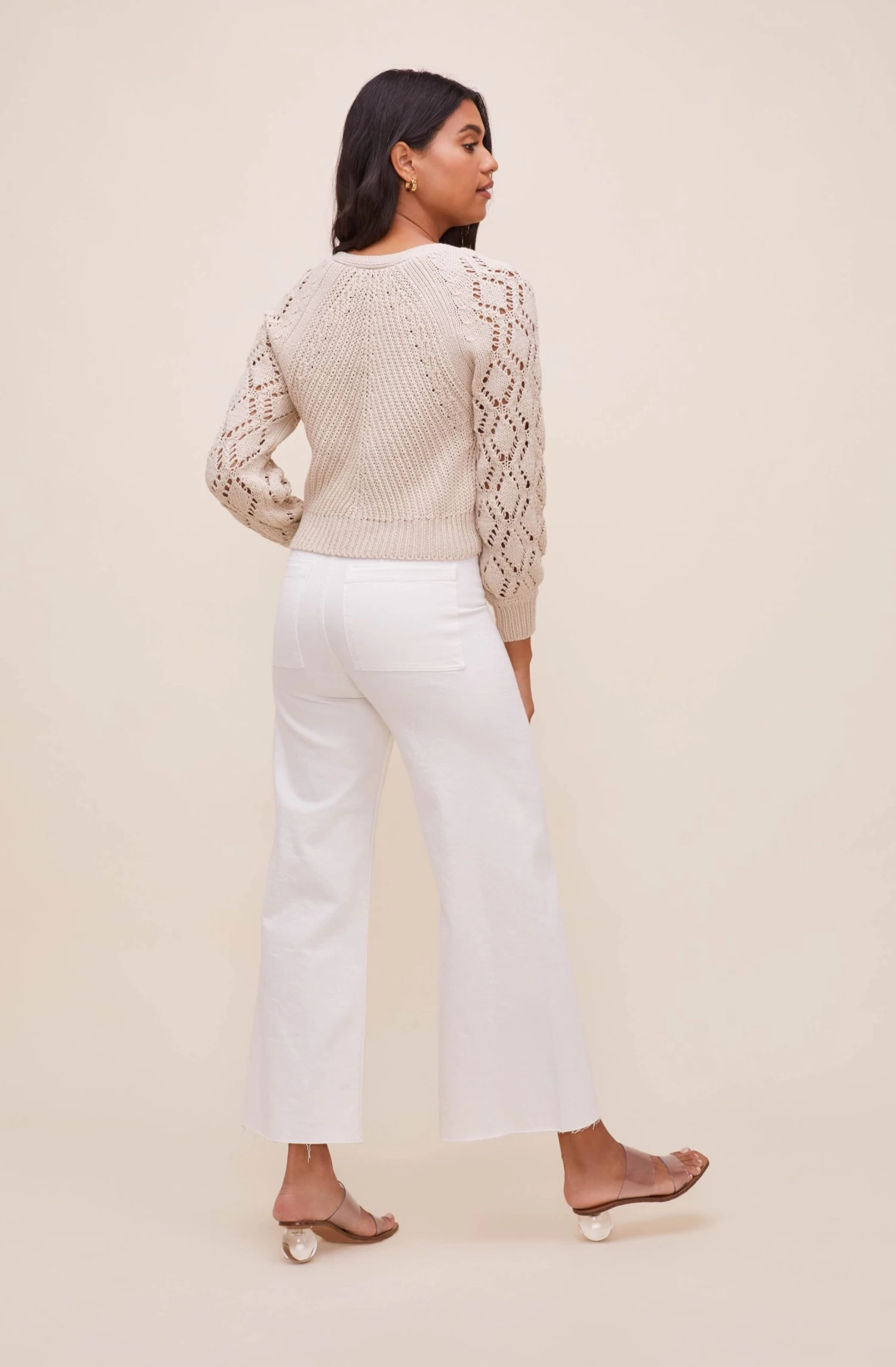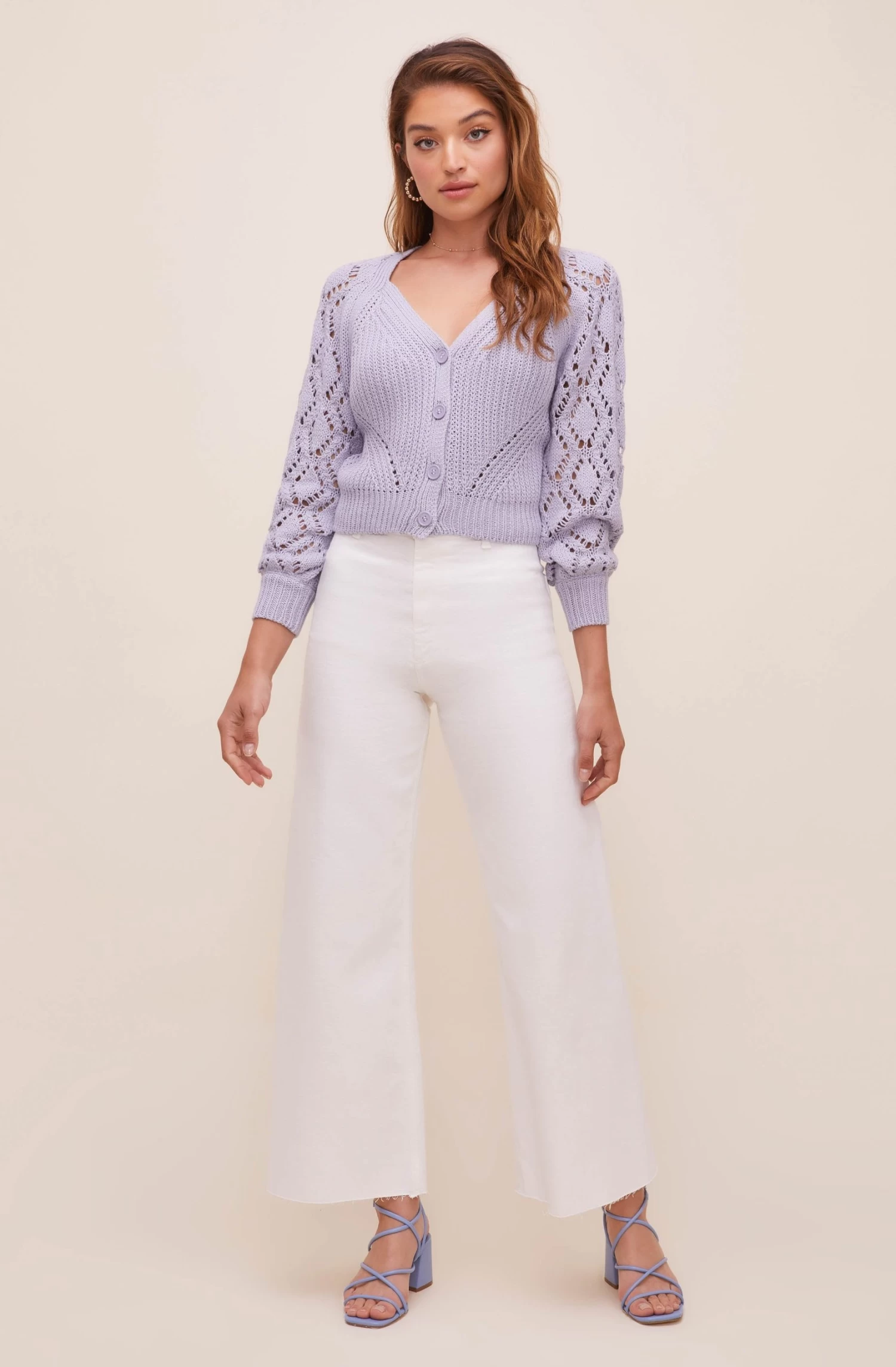 The Angelica cardigan is a statement knit that was made to be seen. It features a V neckline that leads to a buttoned front. Long pointelle knit sleeves.