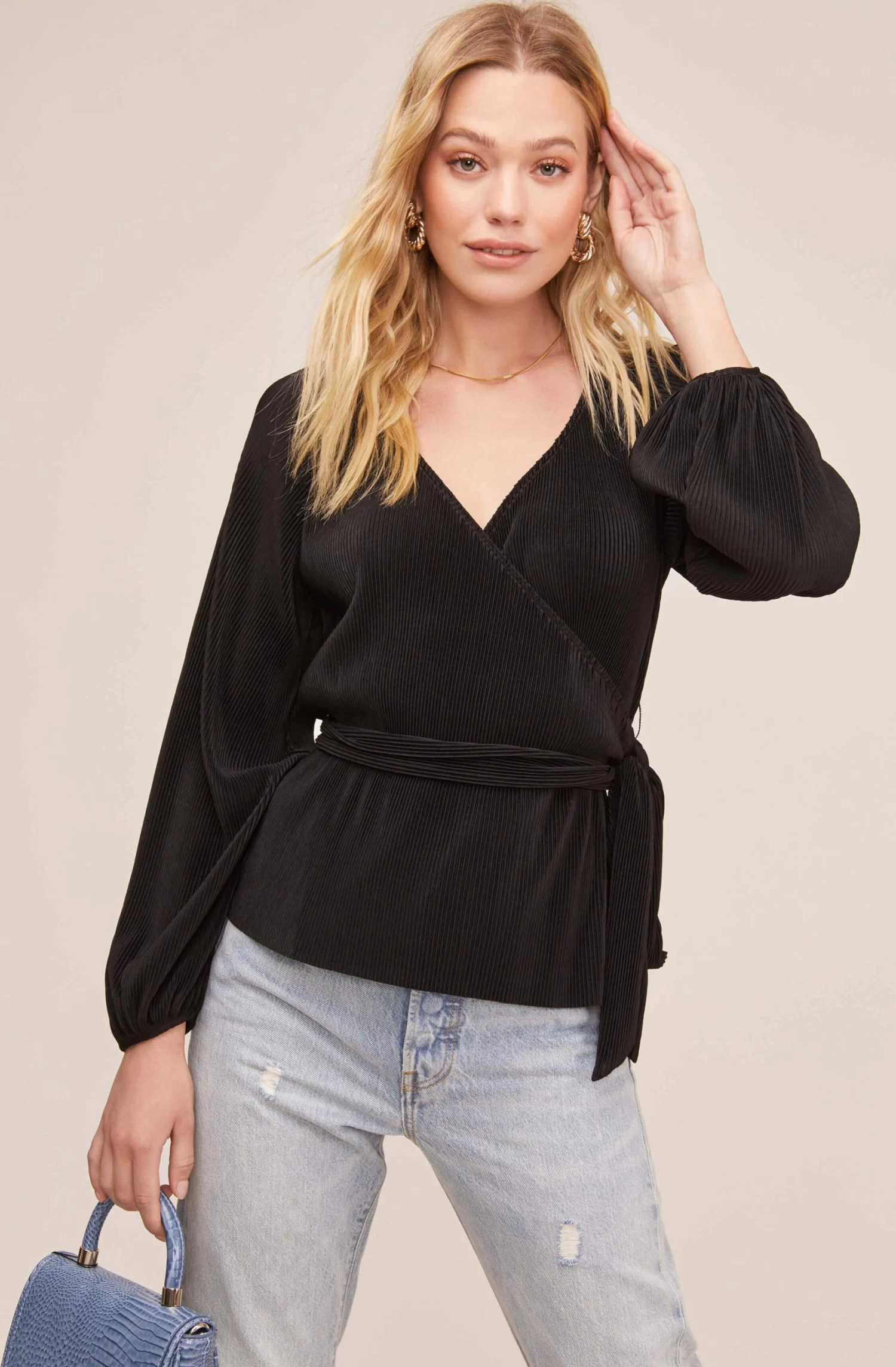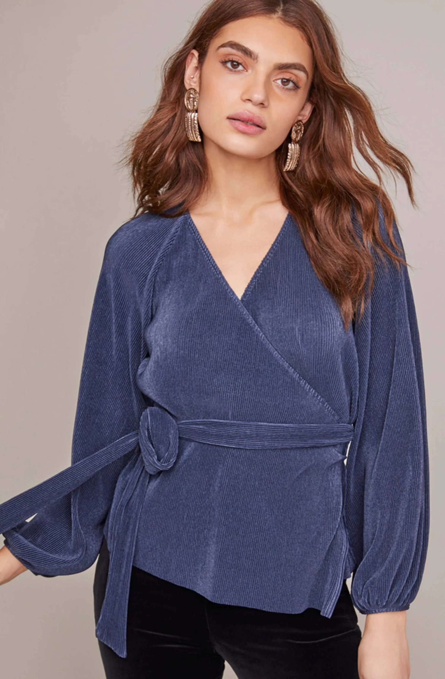 Freshen up your look with new silhouettes! This chic blouse features a V-neckline that descends to a wrap front and meets at a side tie accent. Long bishop sleeves.