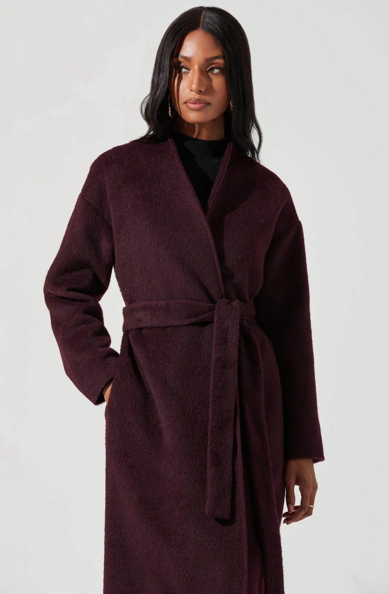 The Berkley Coat features a wool blend finish. Open front features a tying sash at the waist. Long sleeves. Side pockets.