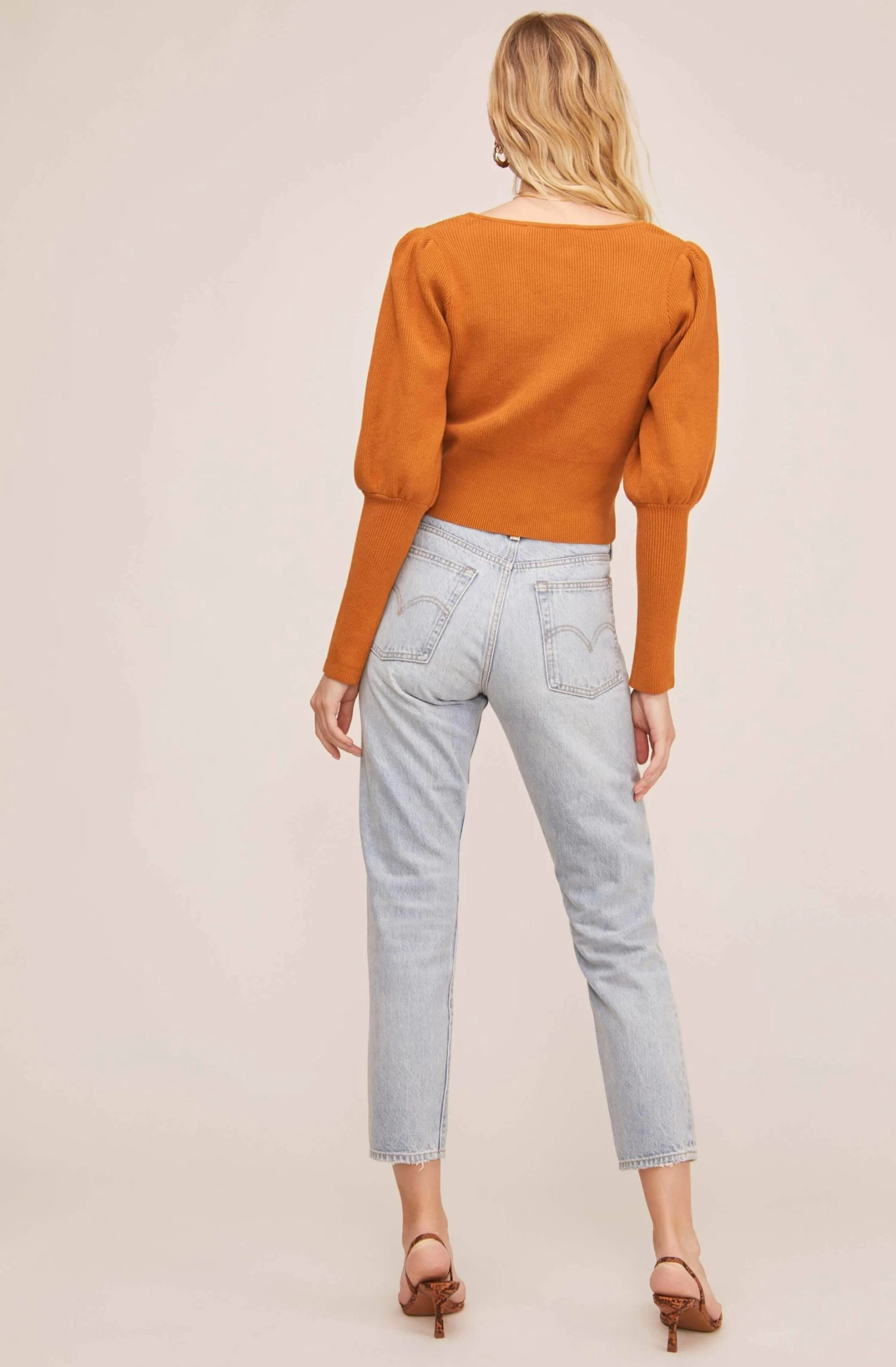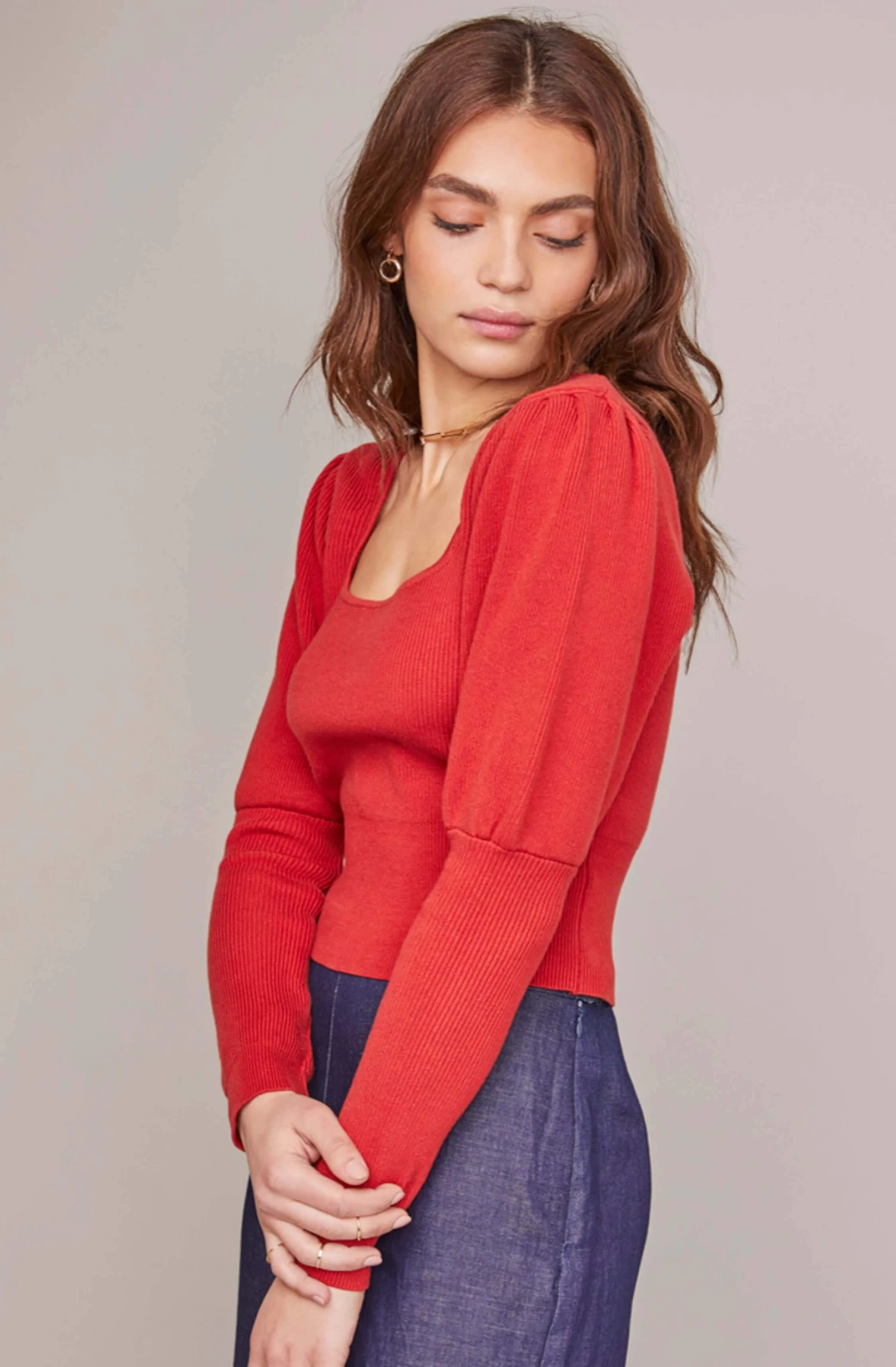 A cropped sweater with a perfect fit. Chic square neckline descends to a fitted bust and defined waist. Long dolman sleeves with puff shoulders.