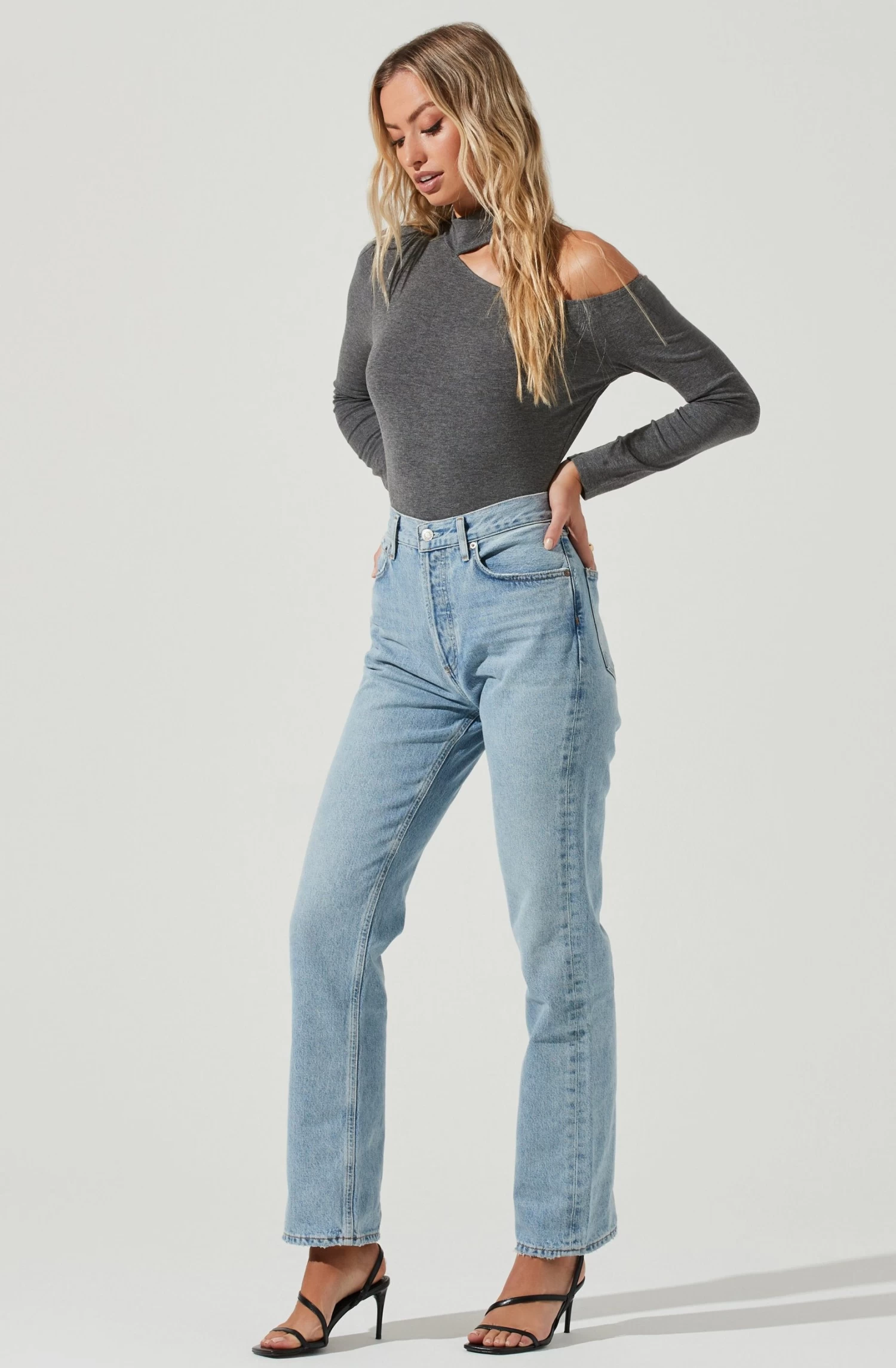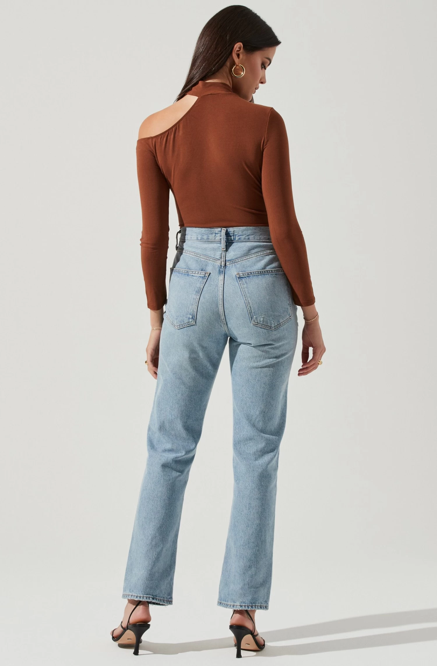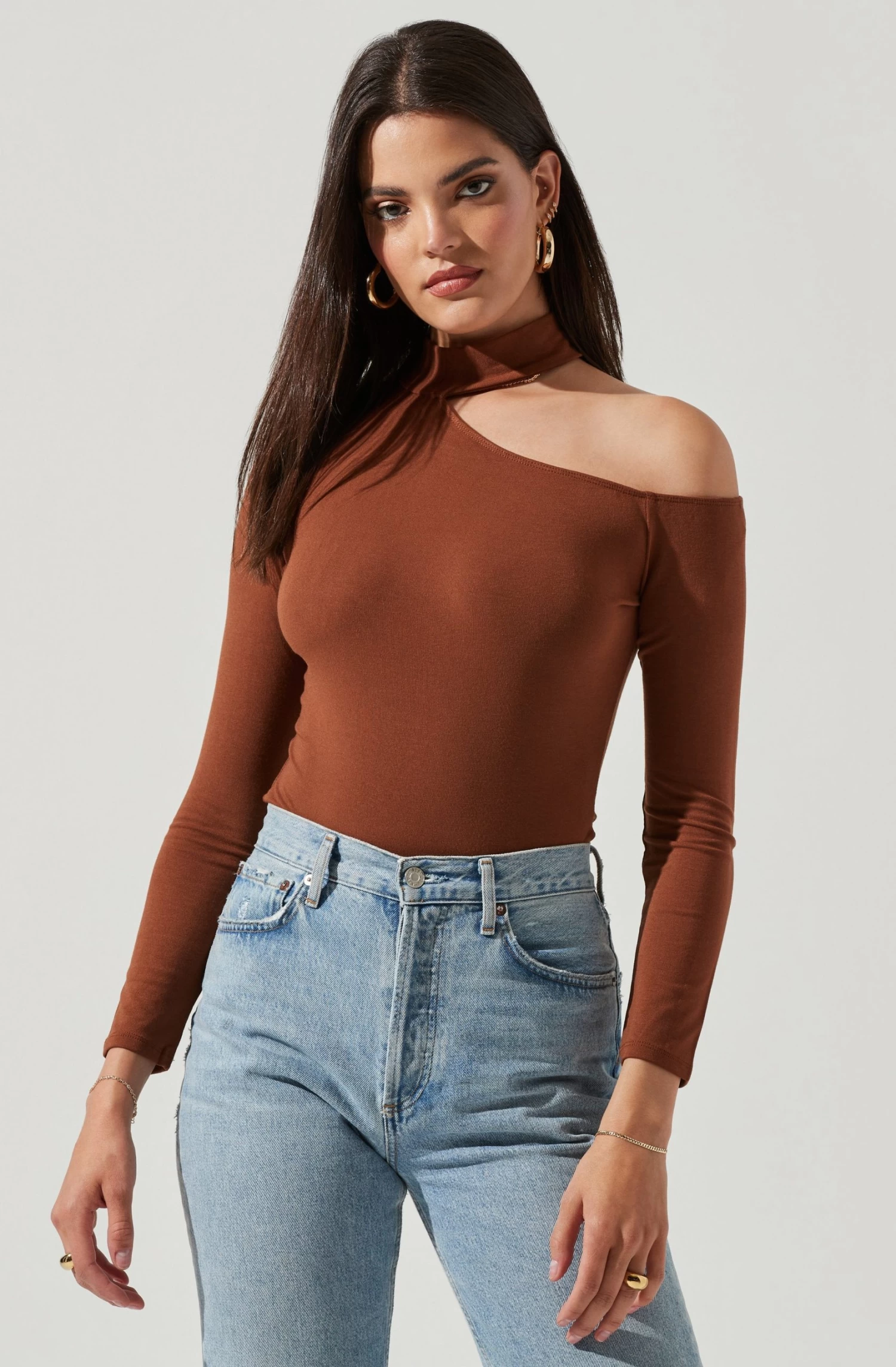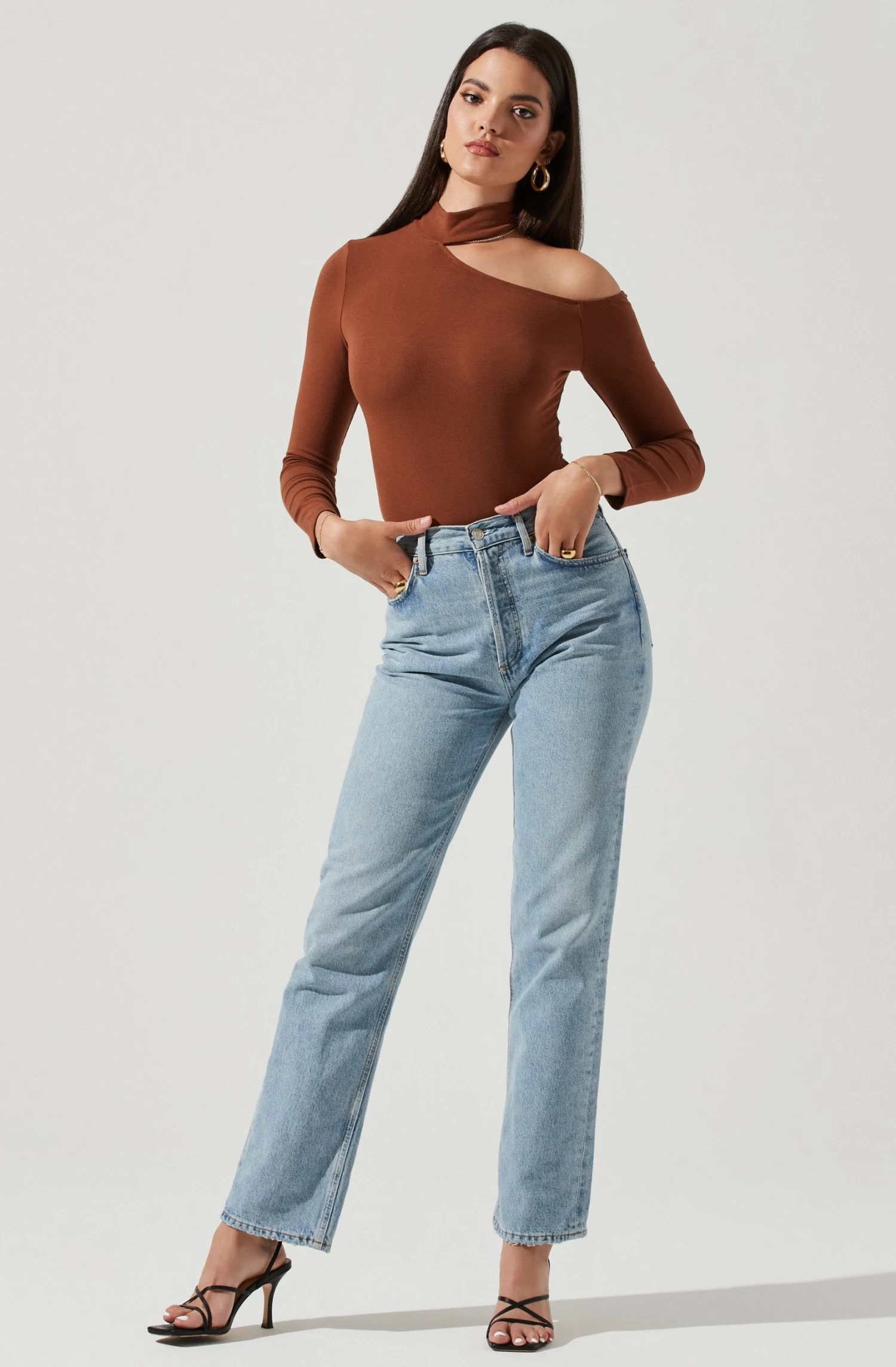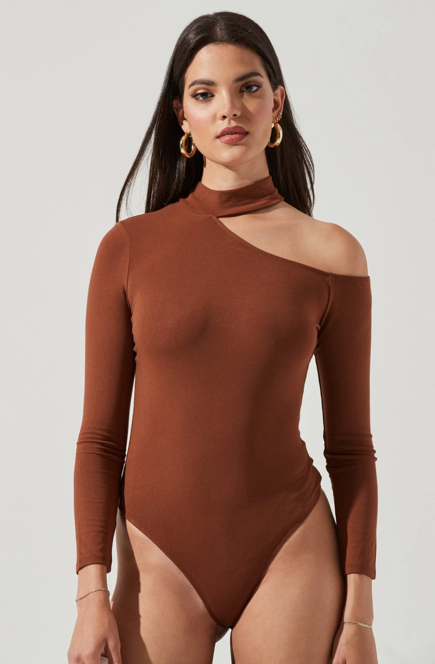 Bare some skin in the Brenda bodysuit. The statement cutout shoulder frames the mock neck collar and fitted long sleeves. Snap button closure.