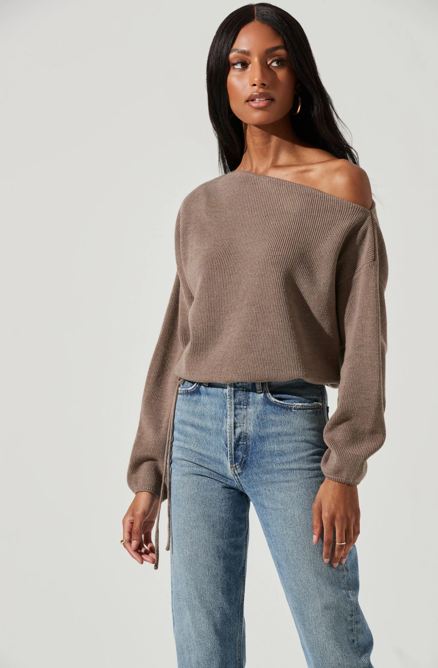 The Brooklyn Sweater is a luxurious knit that features an off-shoulder neckline and long sleeves. Cinched waist features an adjustable drawstring accent. Relaxed fit.