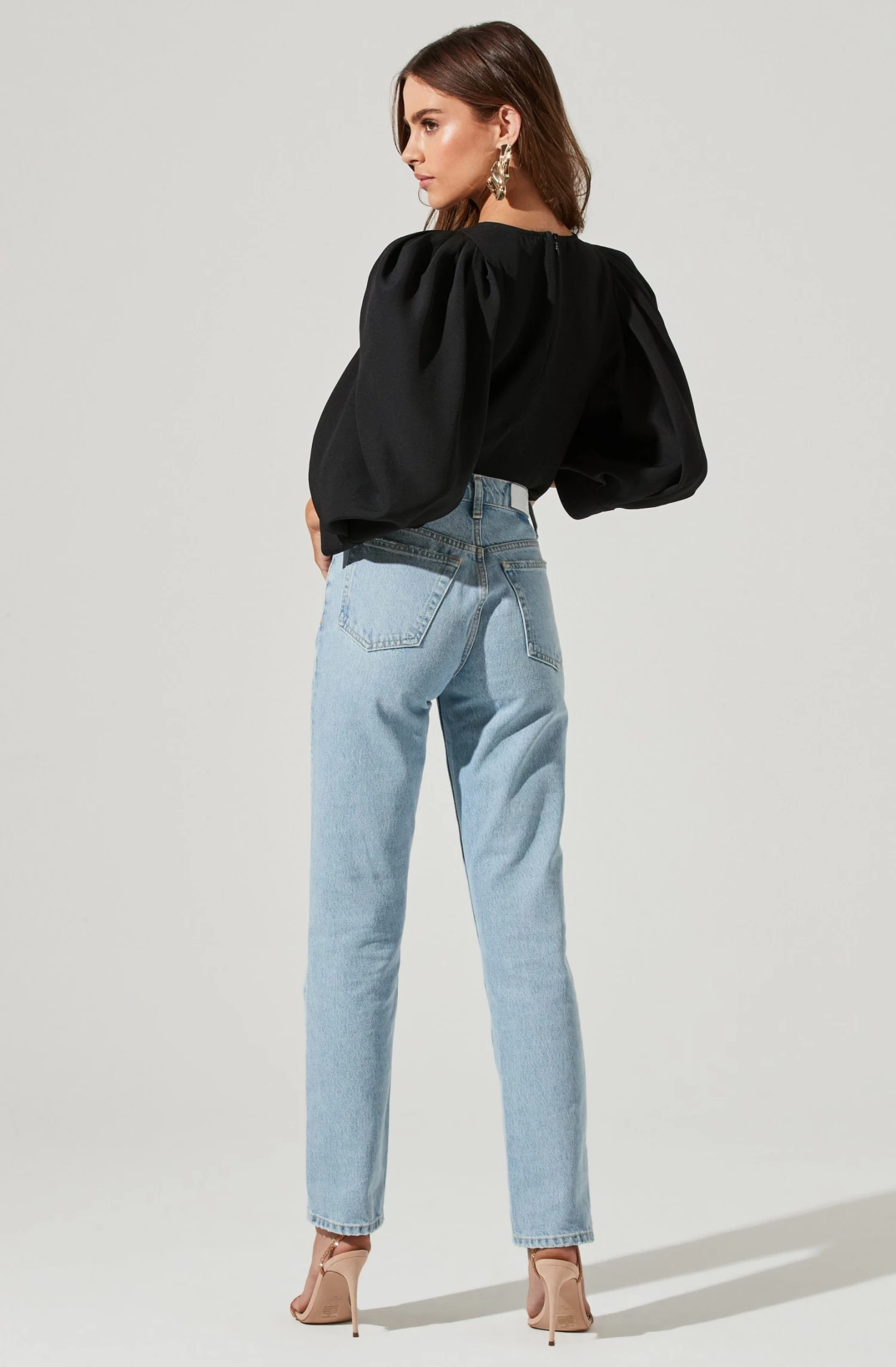 This top features a crew neckline with statement bubble half sleeves. Concealed back zip closure.