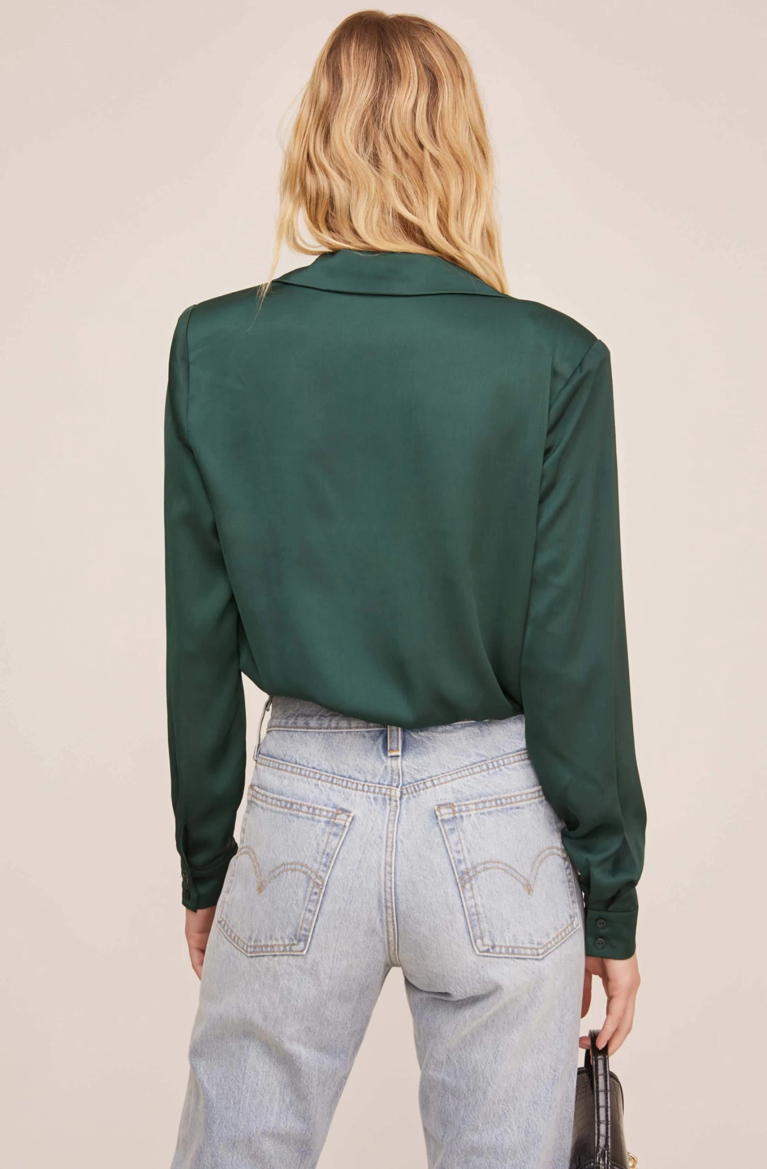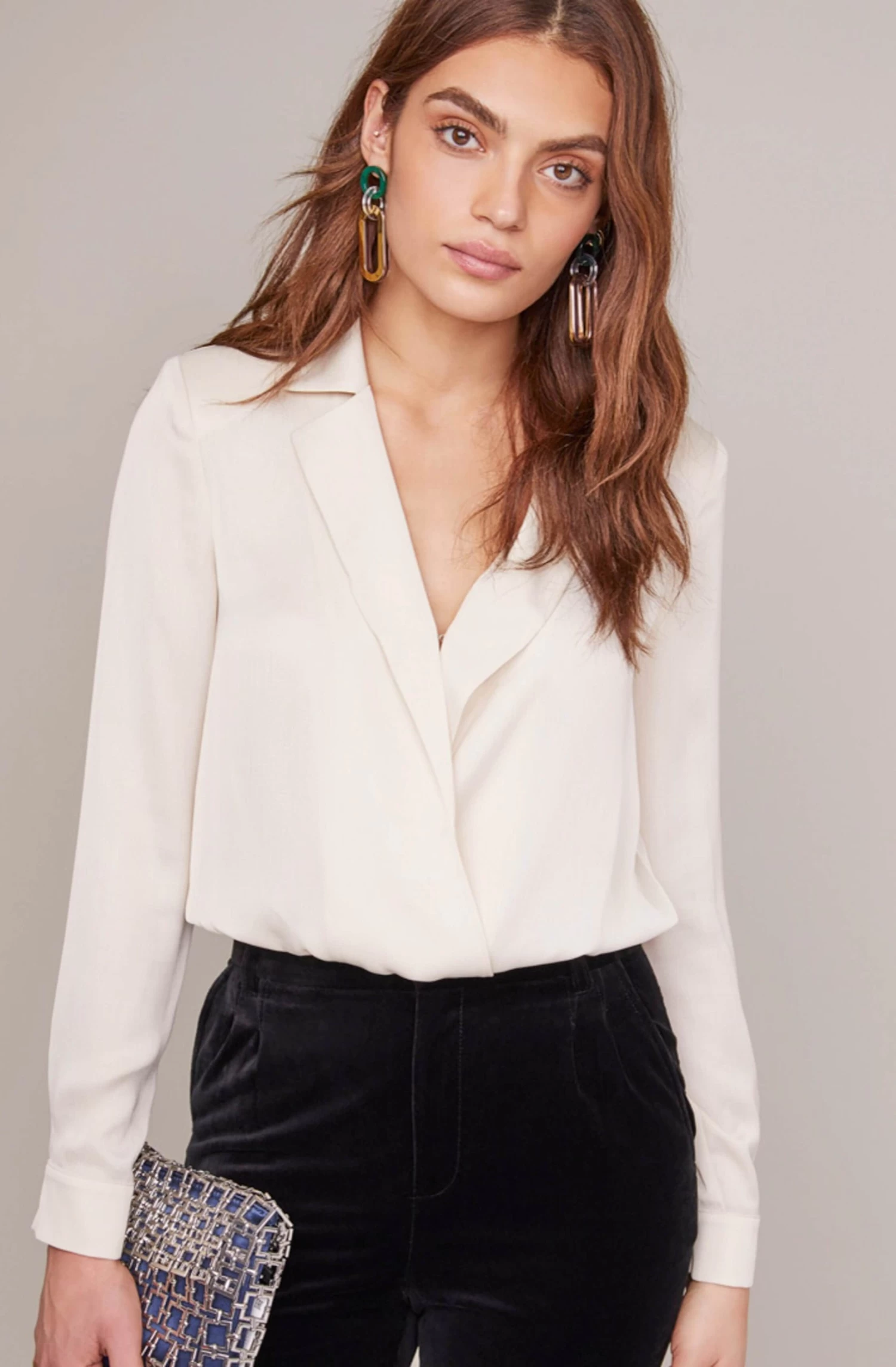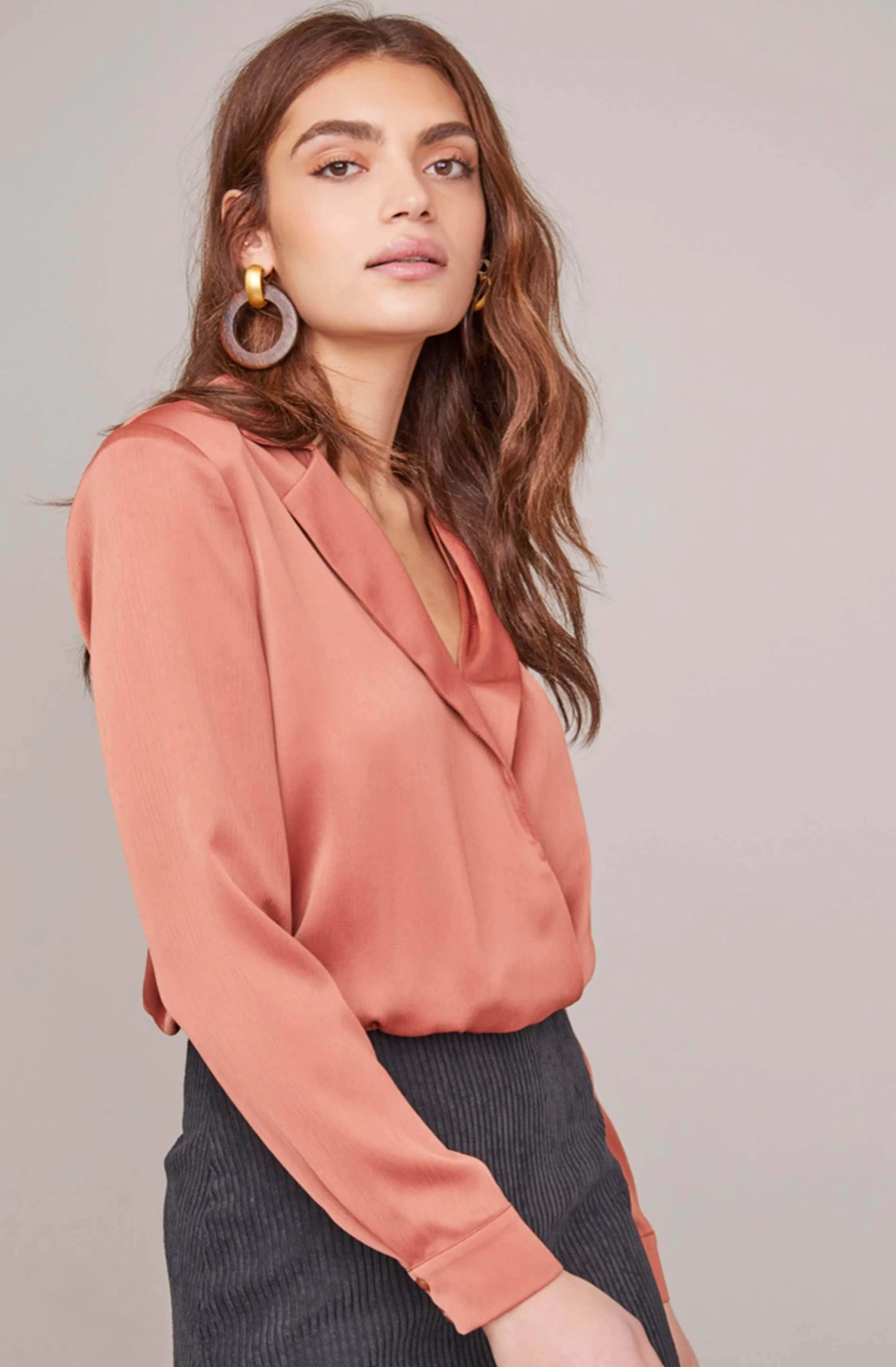 Trust in sleek satin styles to keep your blouse rotation on-trend this fall. Featuring a notched lapel, this chic top descends to a plunging V neckline and wrapped front. Long cuff sleeves with dual button accents.