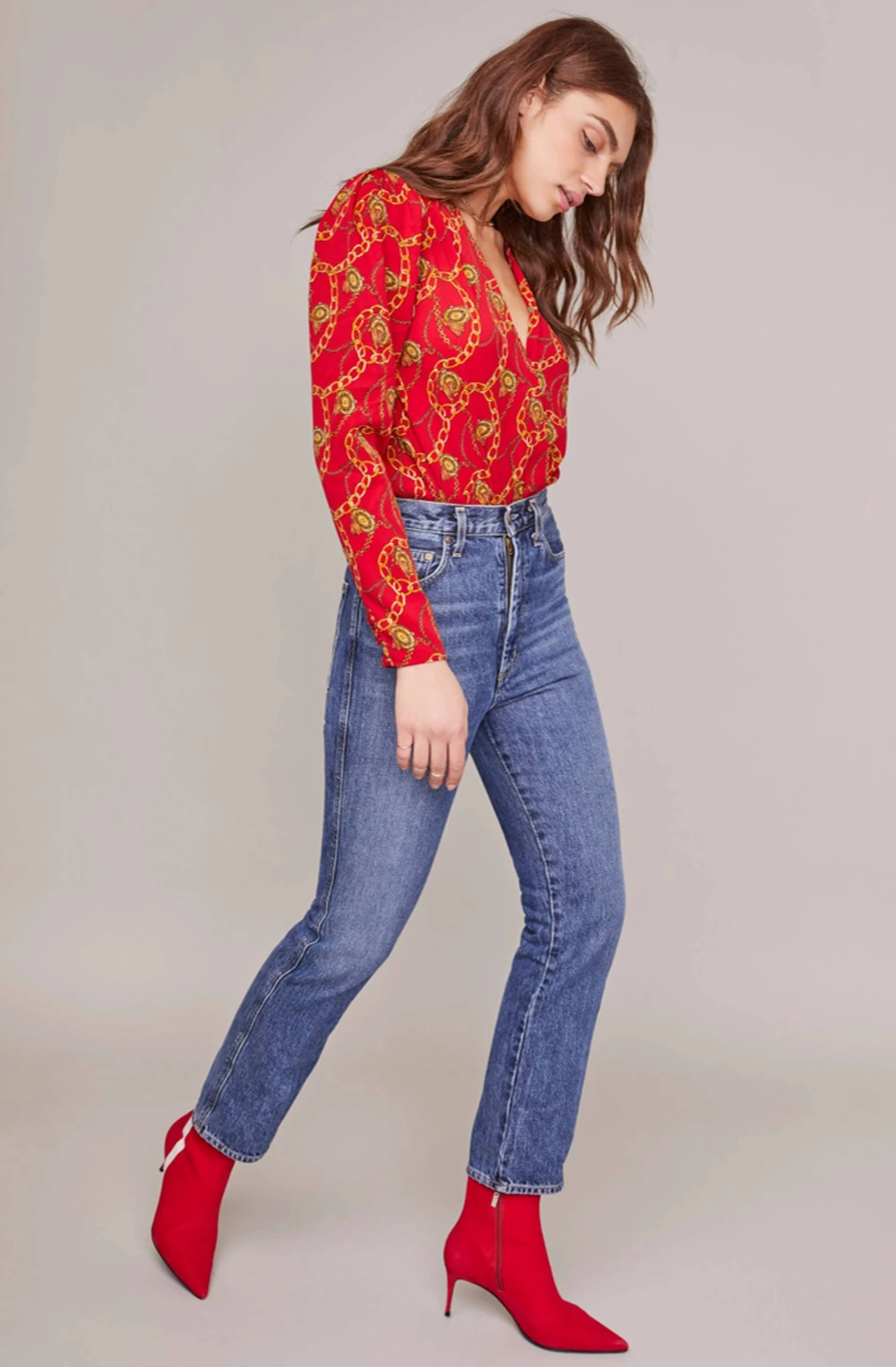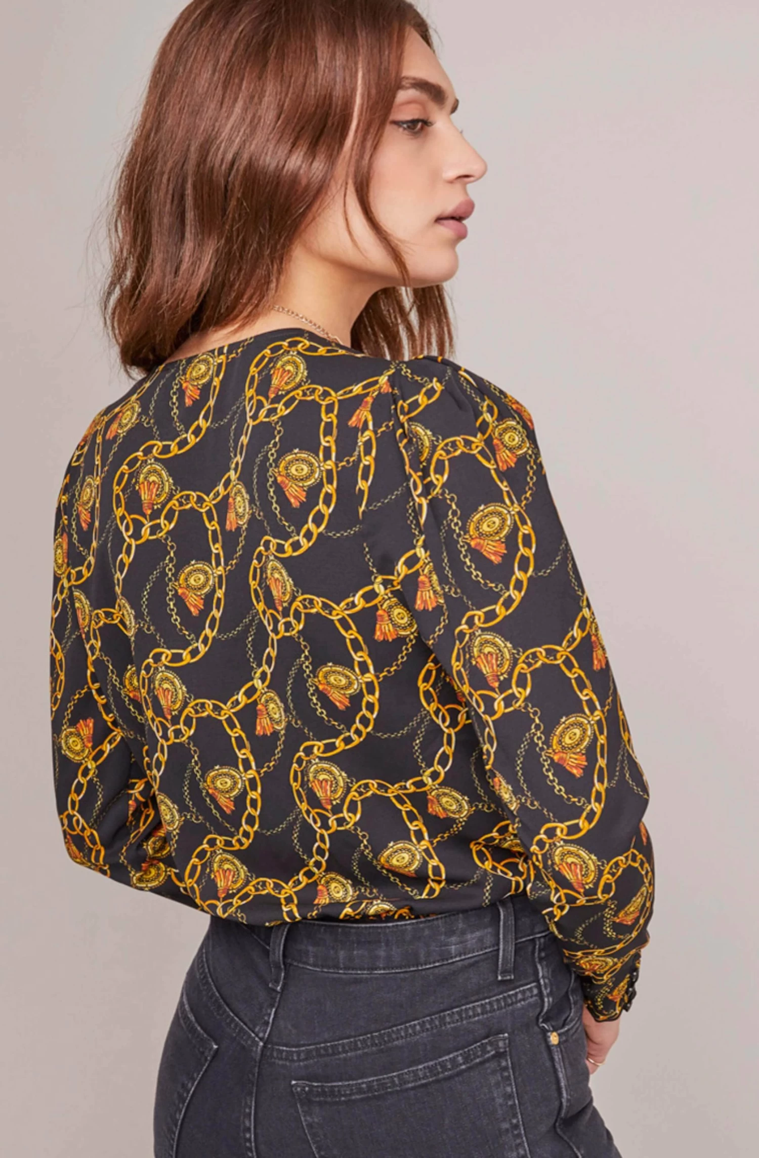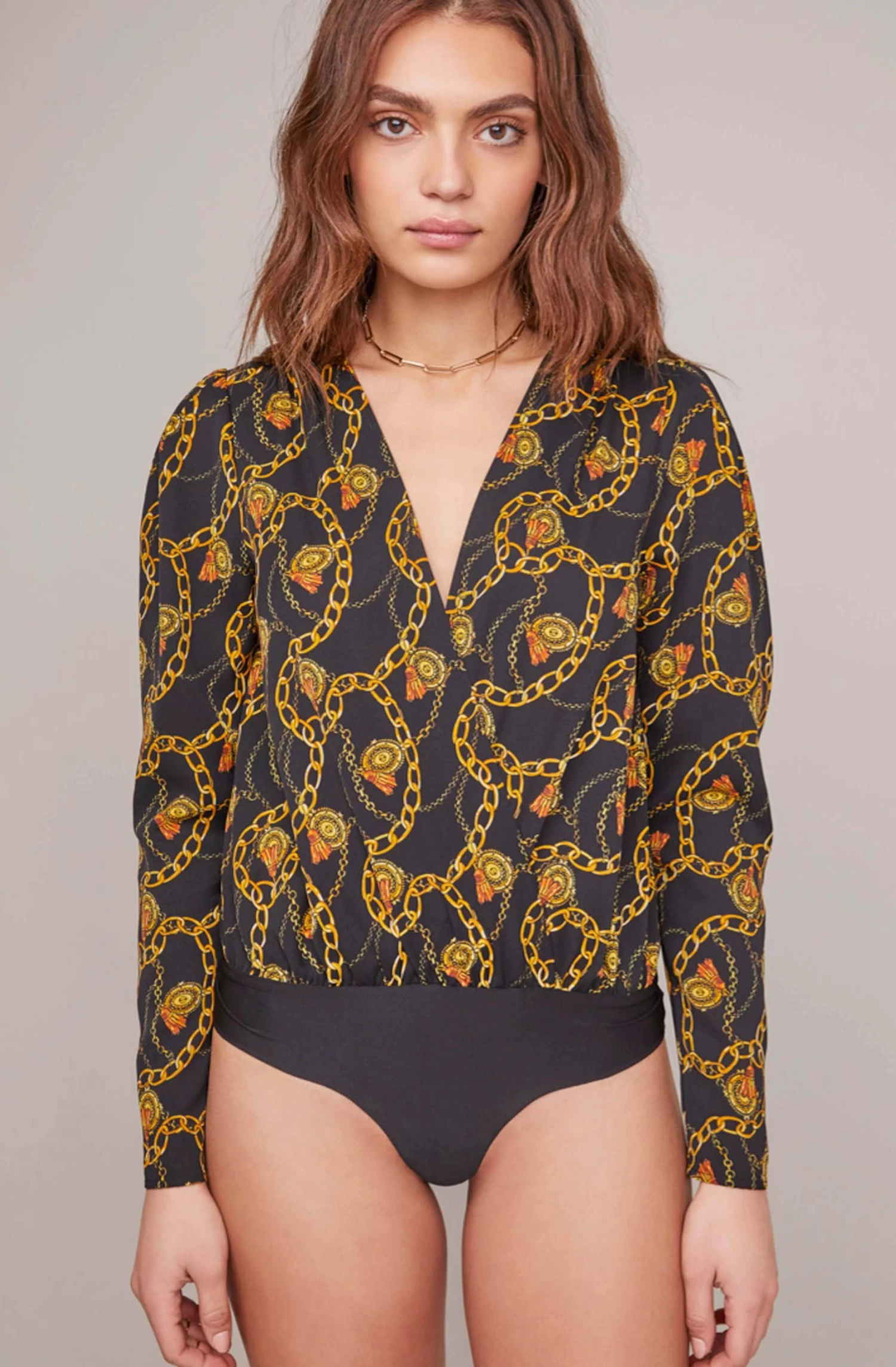 A statement bodysuit keeps your outfits interesting! A plunging V neckline descends to a wrap front and is decorated with an eye-catching chain print. Long sleeves.
