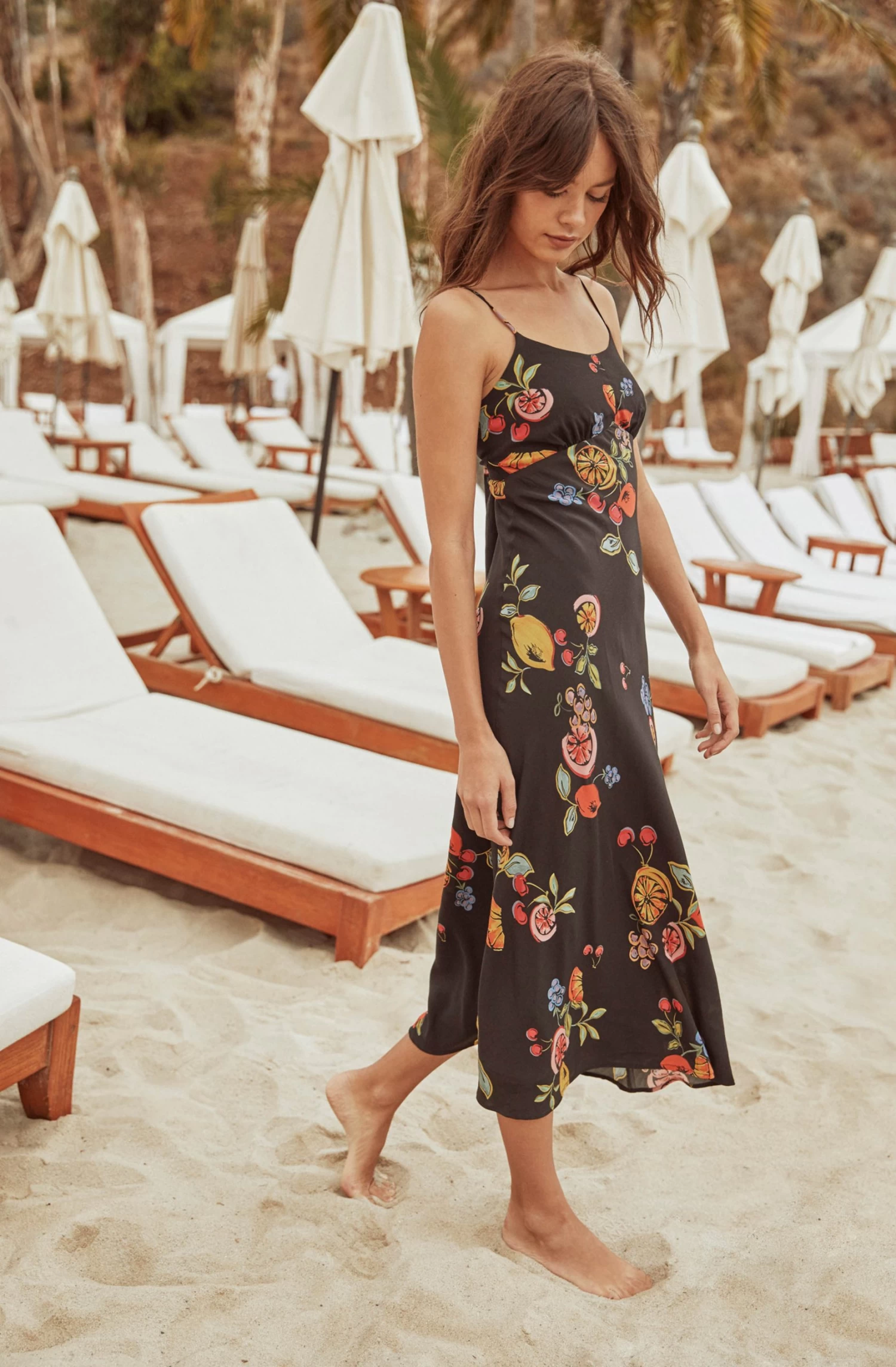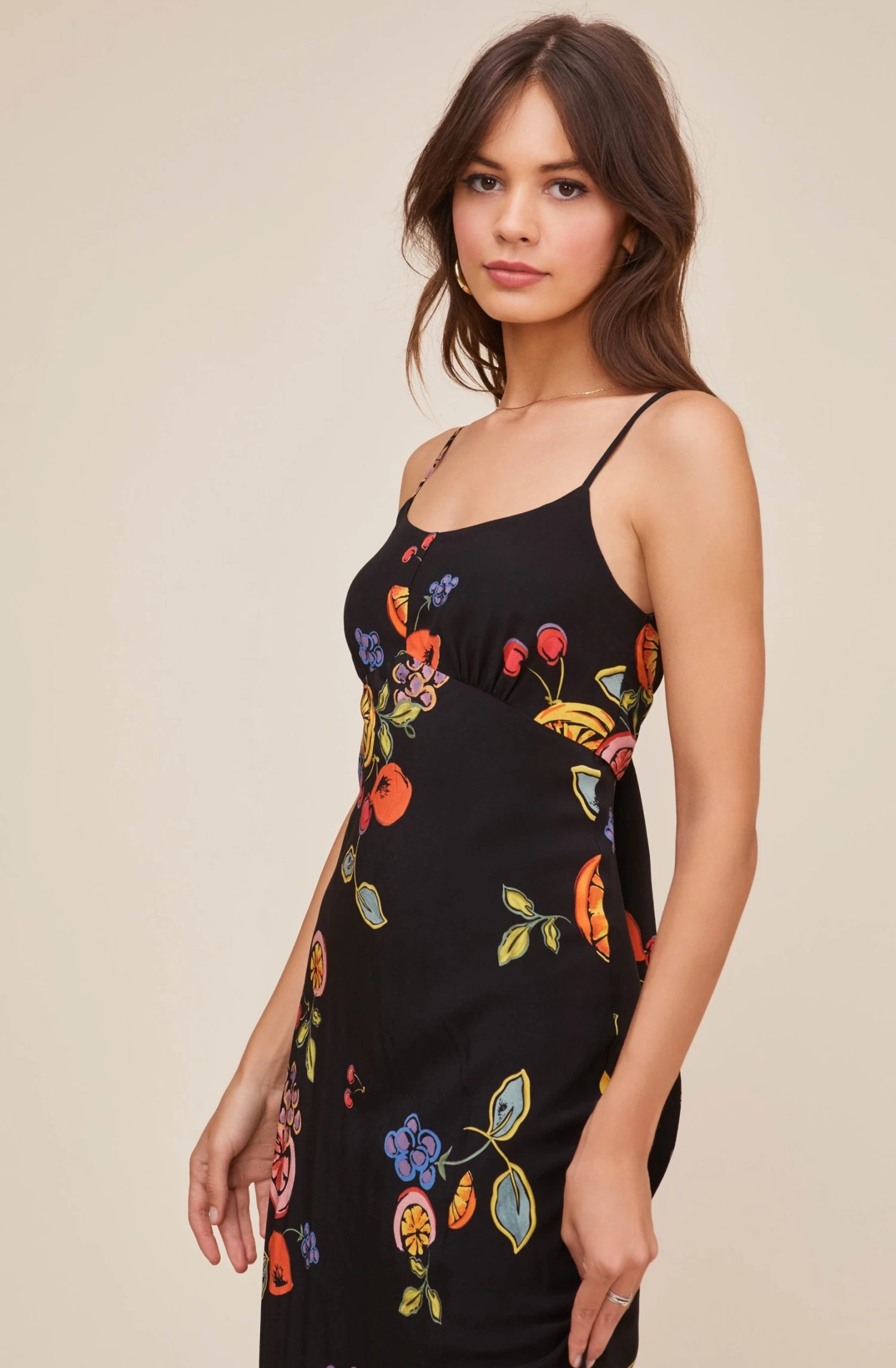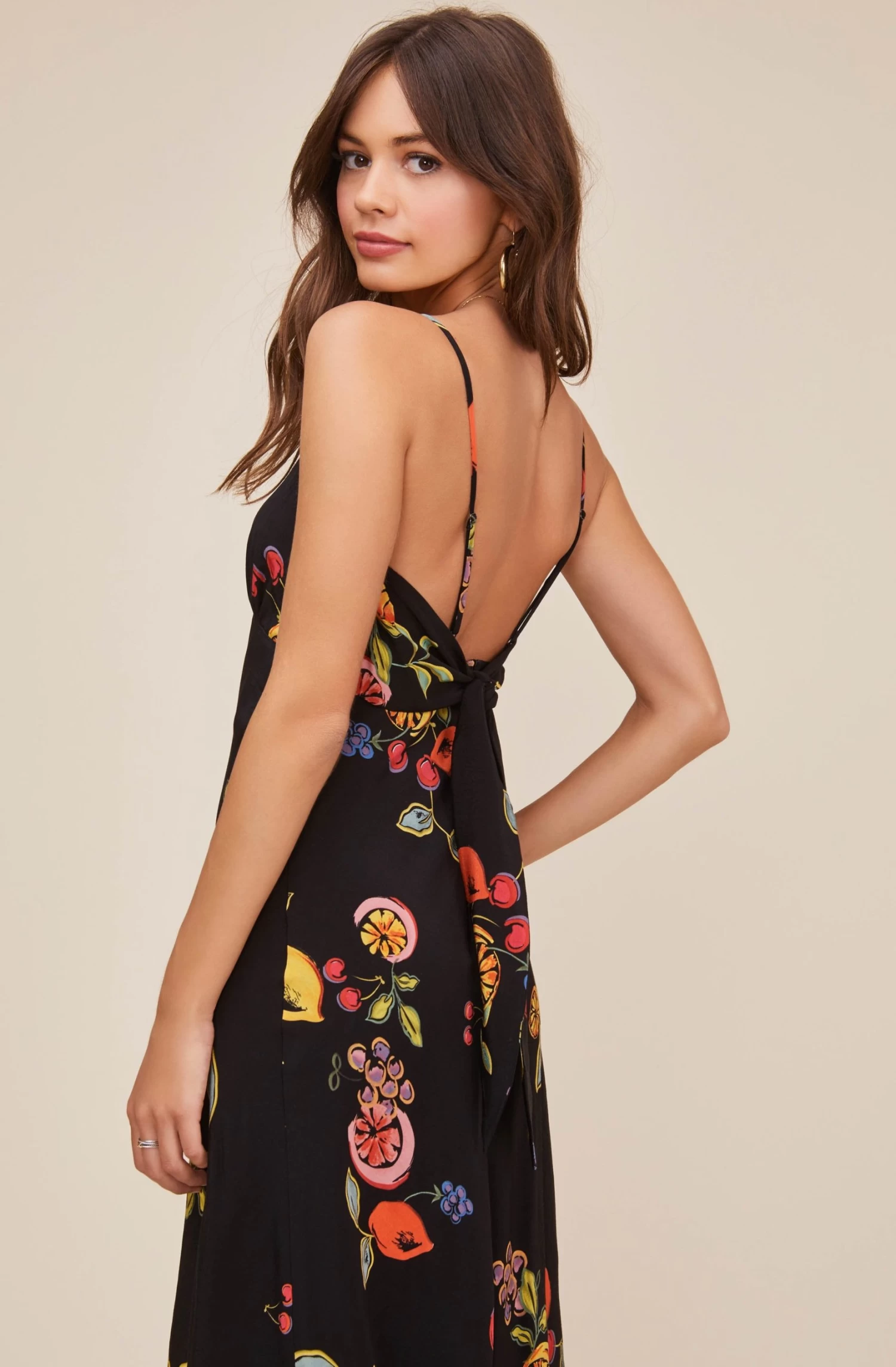 A dress that feels as tropical as you wish your summer would be! This statement style starts with a scoop neckline that’s supported by barely-there straps. Fitted bust and bodice descend to a flowy midi skirt. Fun and vibrant fruit print throughout. Low cut back and tie back sash detail.