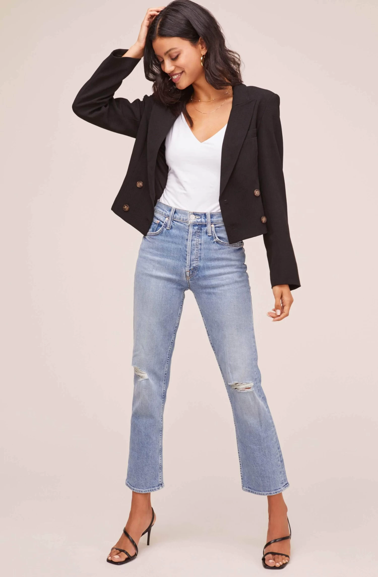 Workwear for on and off-duty looks! This cropped blazer features a notched lapel that leads down to a double-breasted front. Padded shoulders accentuates the silhouette.