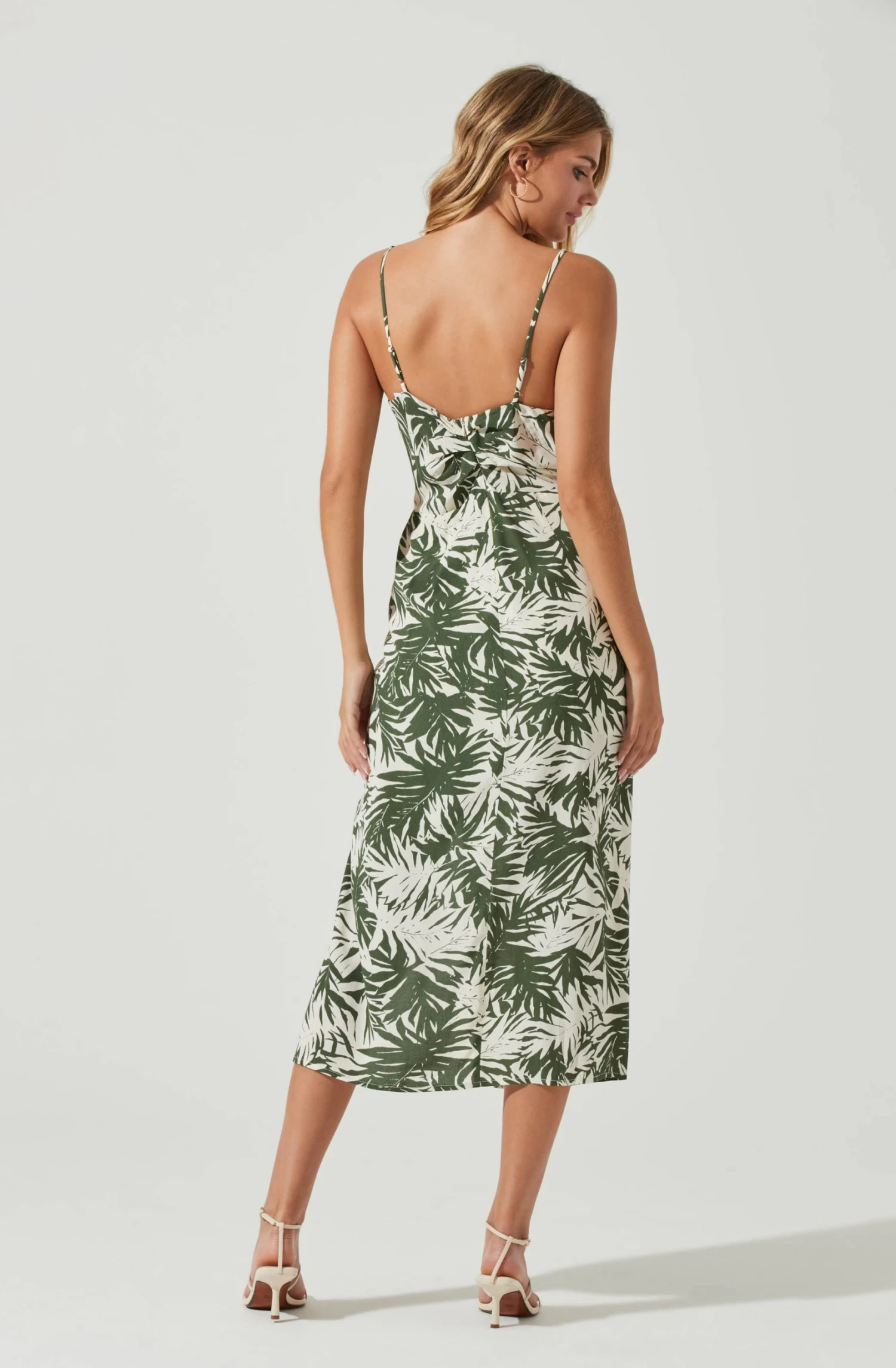 The Destination Dress is the tropical escape your wardrobe needs! It features a statement palm print throughout, plunge neckline and wrapped front. Side slit accent. Midi-length. Adjustable straps.
