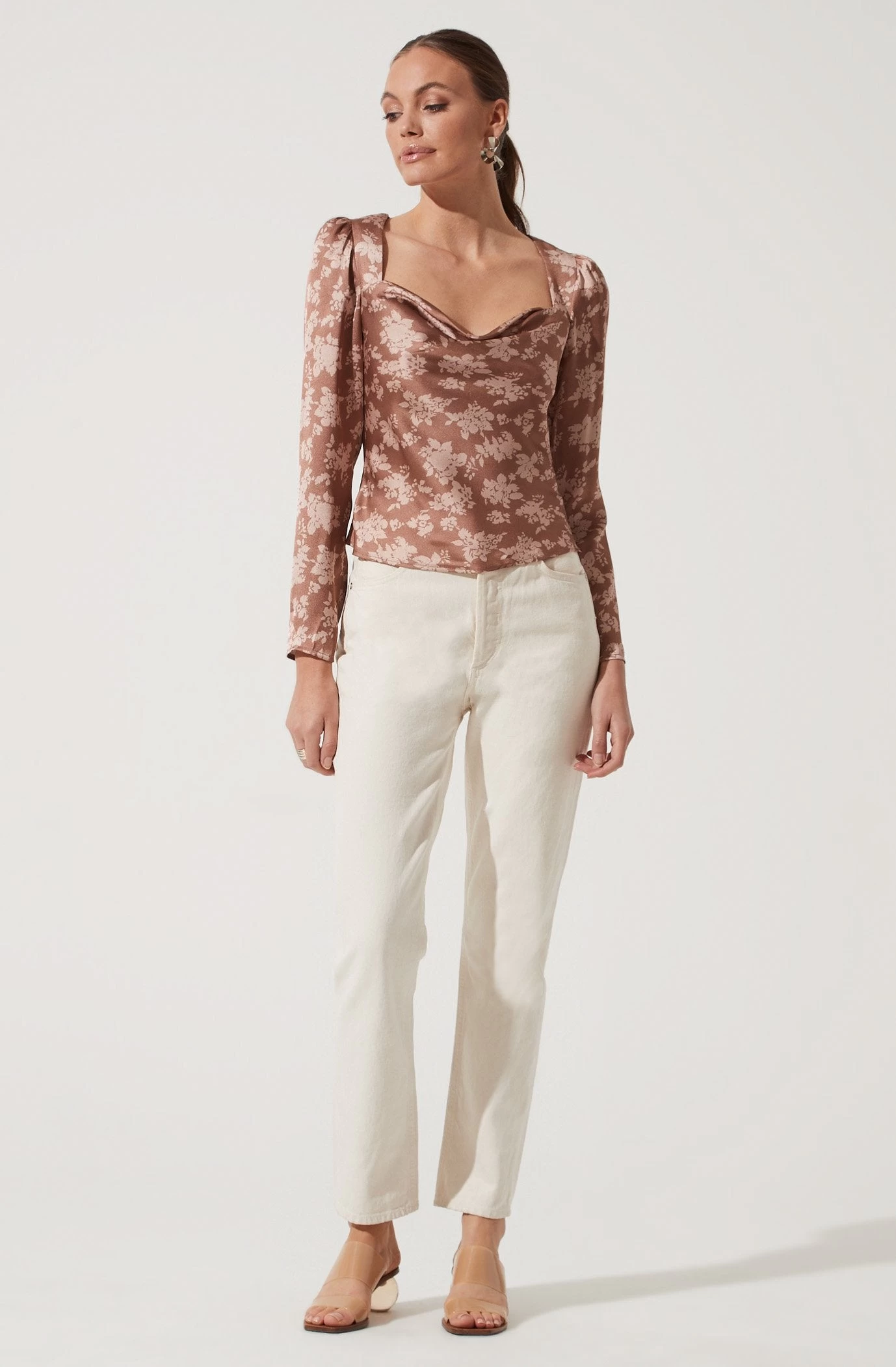 Stylish days ahead. This floral satin top features a cowl neckline that leads to a fitted bodice and is punctuated with a cutout back. Long sleeves.