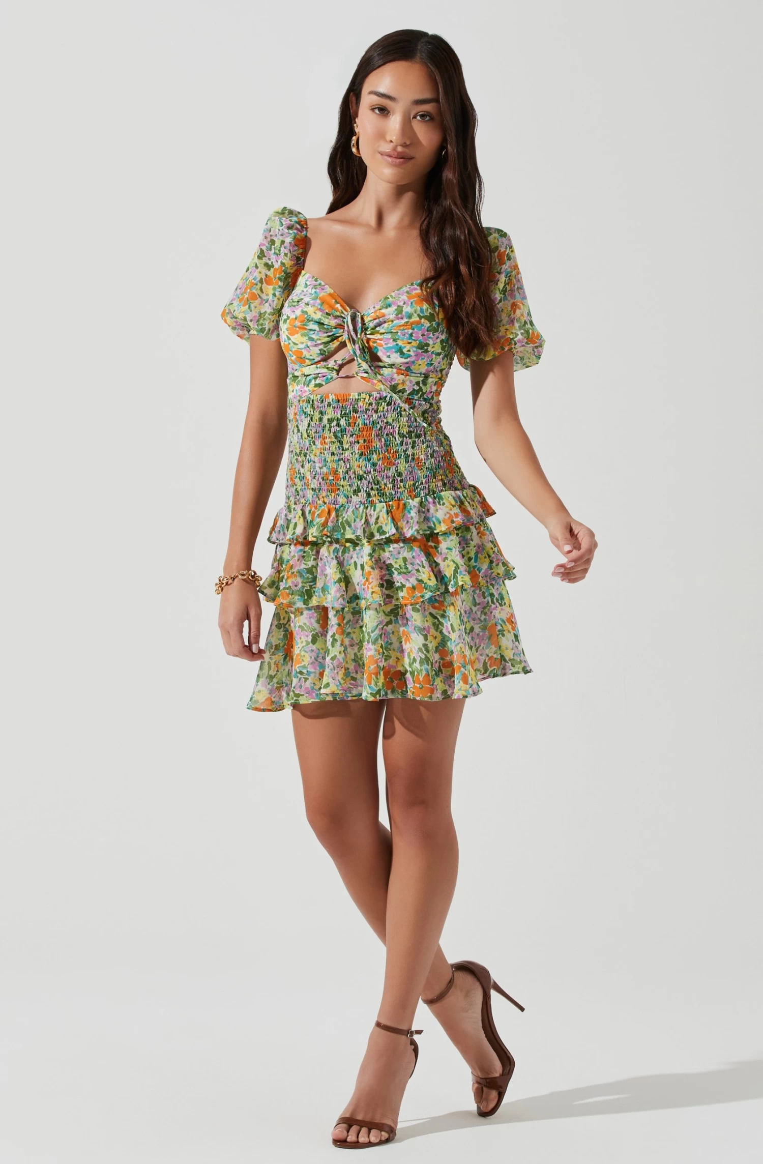 The Garland Dress features a cheerful painterly floral print throughout. Sweetheart neckline descends to a front cutout accent with a drawstring detail. Smocked bodice leads to a tiered ruffle mini skirt. Short puff sleeves accentuate this silhouette and elastic cuffs give them structure. Fully lined. Slight stretch.