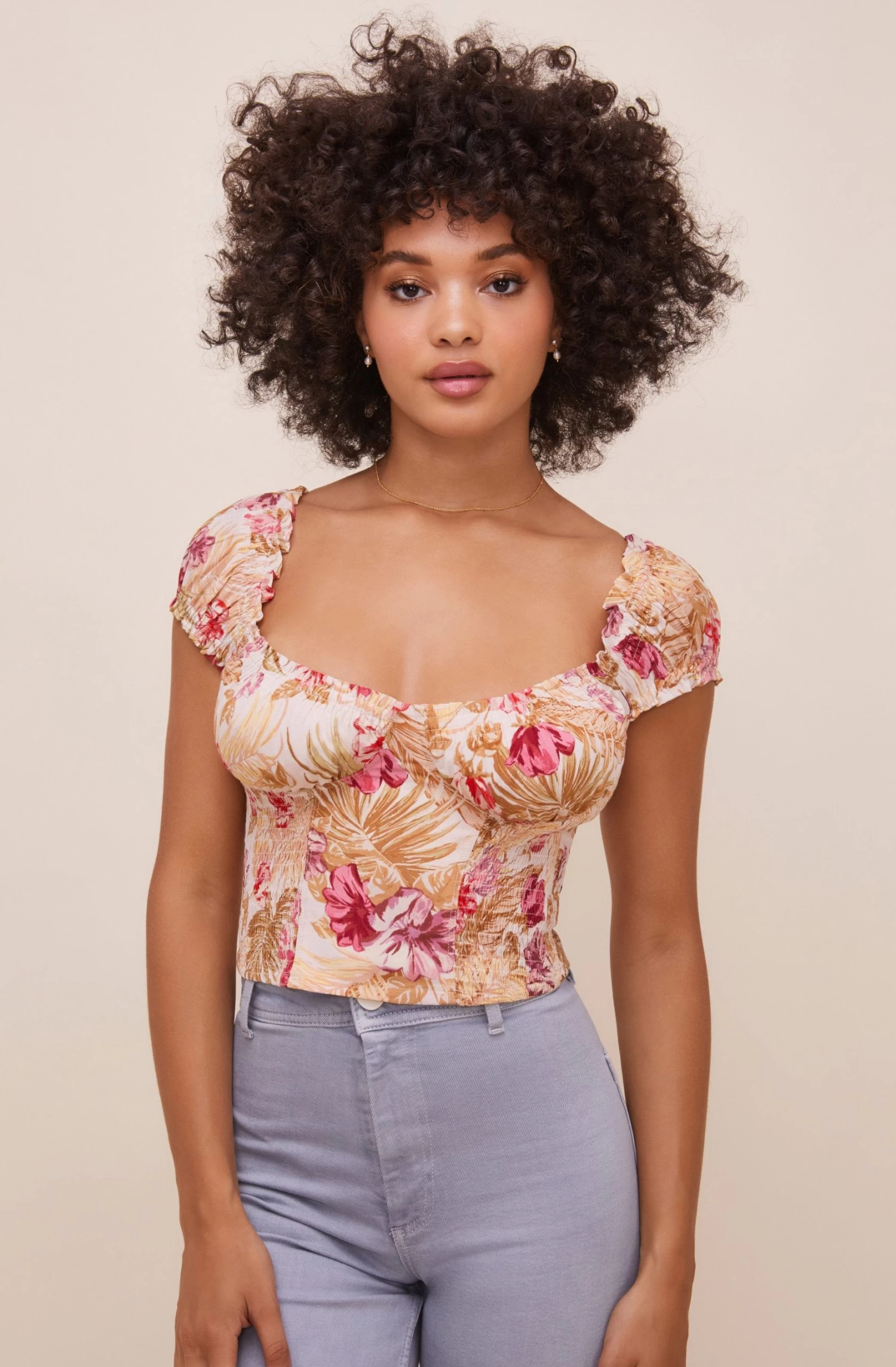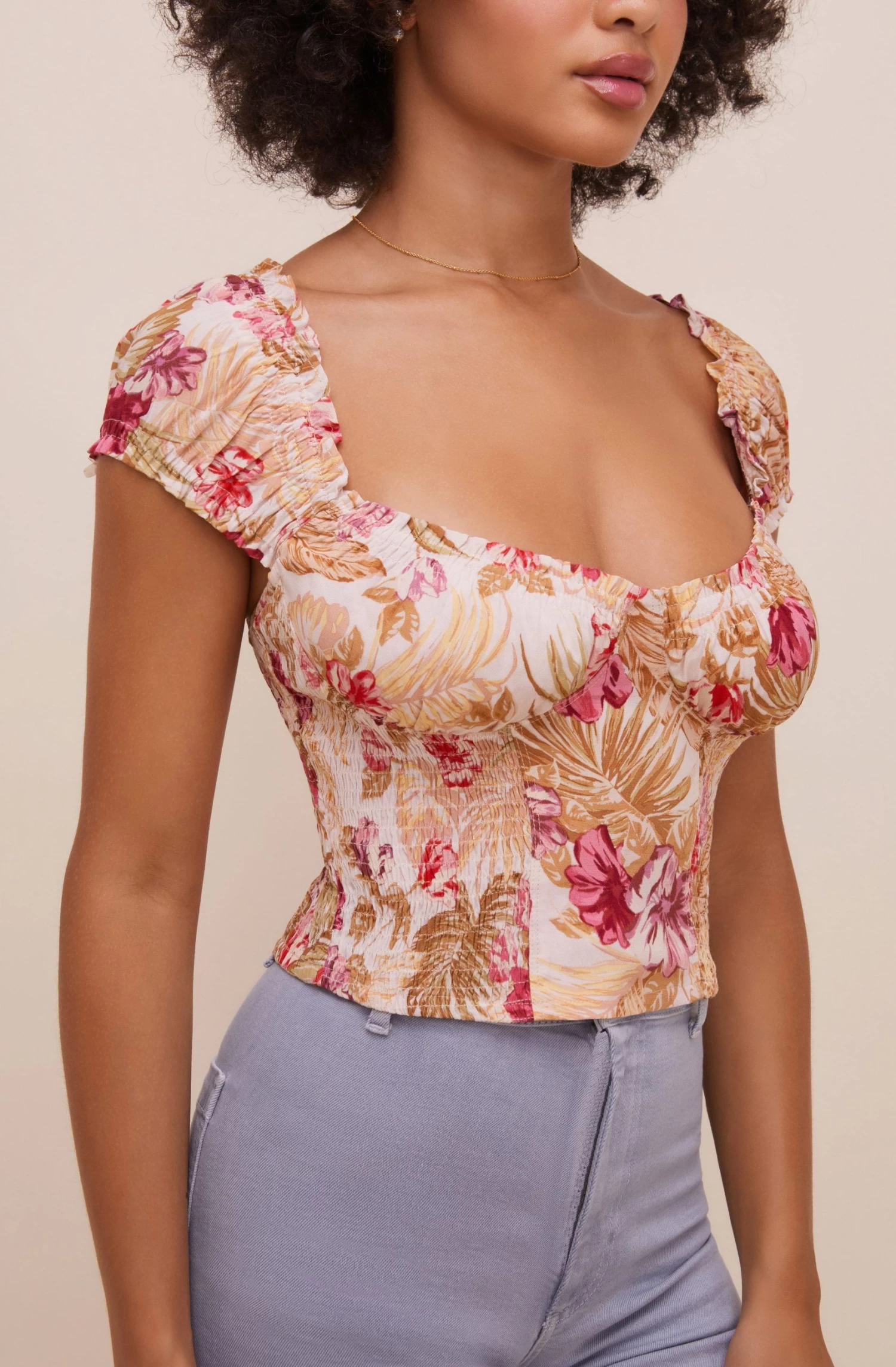 Tropical times ahead! This top features a square neckline with a soft ruffle trim. Bustier front leads to a fitted bodice and smocked accents for an ideal fit. Short cap sleeves.