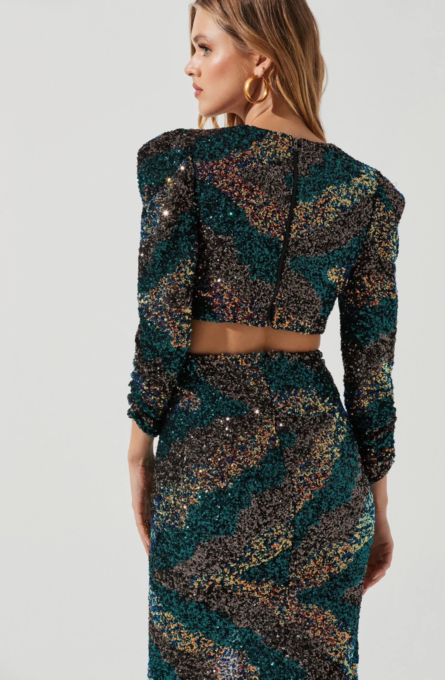 Sequin stunners make the season bright! The Jayla Dress features a statement multi-colored sequin fabrication with a deep V neckline, midi-length skirt with a front slit accent and sexy cutout back detail. Long ruched sleeves with voluminous shoulders.