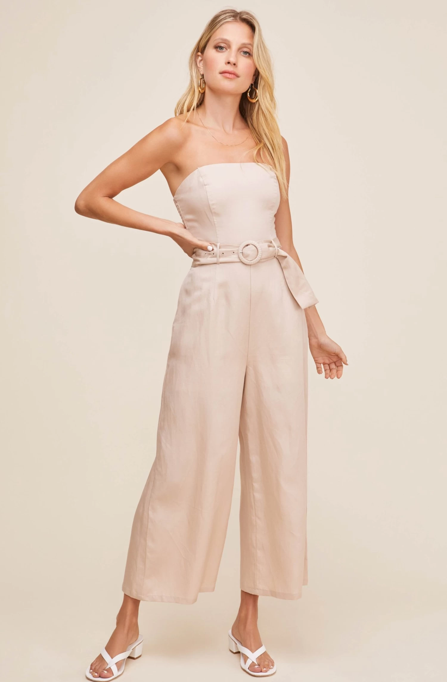 Good to go in one step. This stylish jumpsuit features a strapless neckline that descends to a fitted and darted bodice. Matching belt with circular belt buckle and wide leg bottoms. Smocked back.