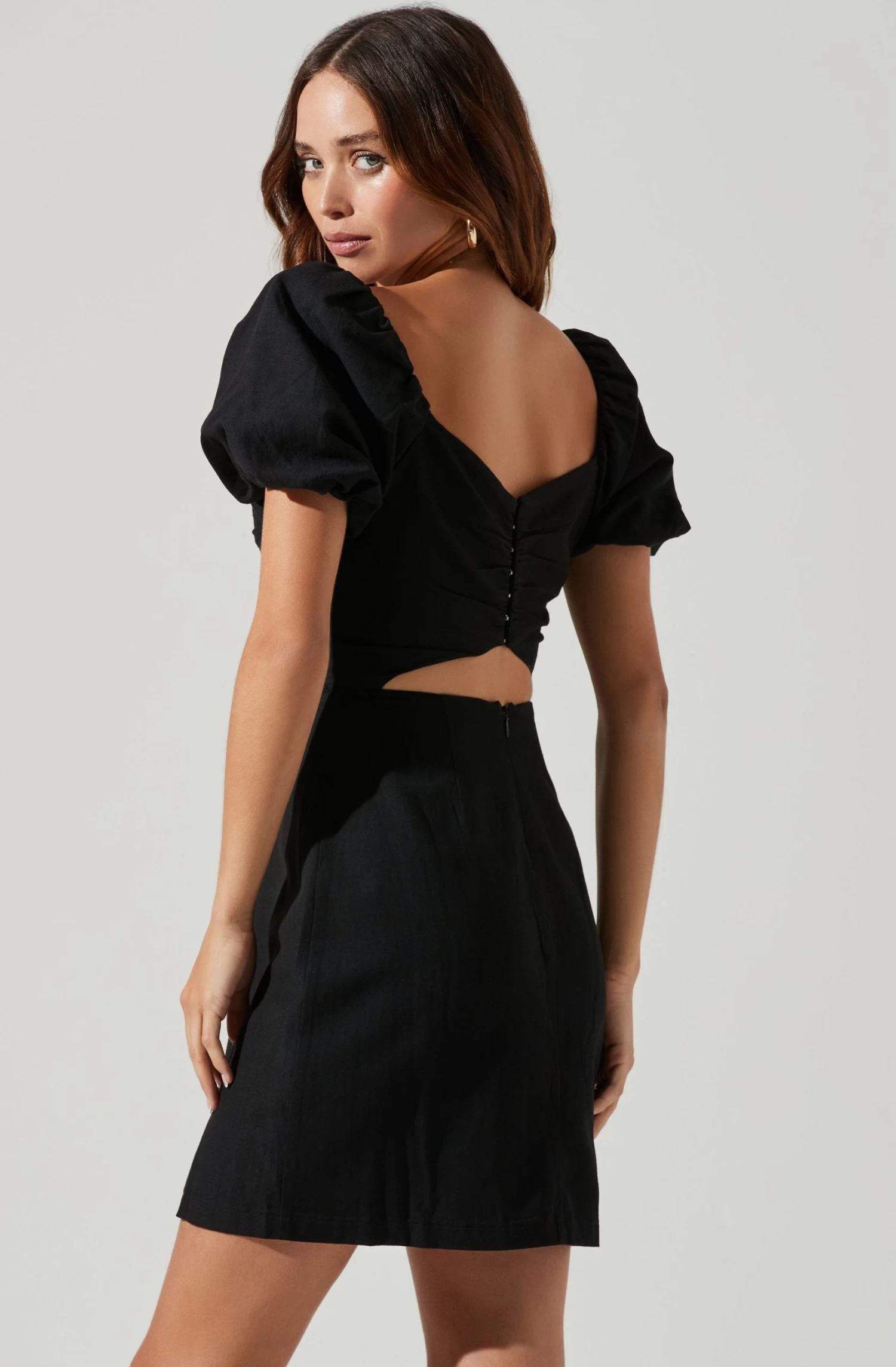 Sweet as can be in this ensemble. It features a subtle sweetheart neckline that leads to a pleated bust and accentuated waist. Back cutout accent. Short bubble sleeves.