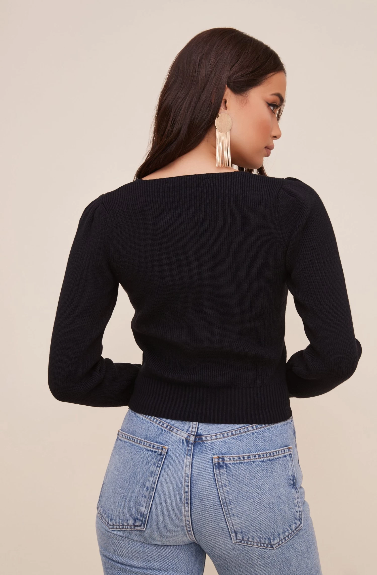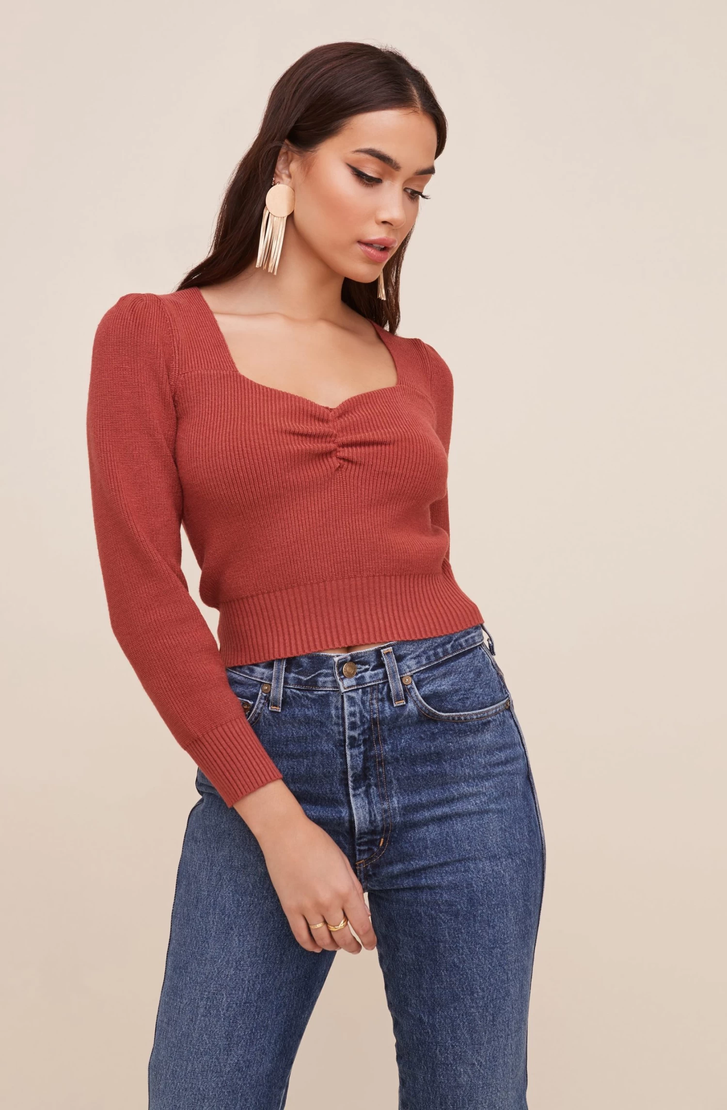 A gorgeous knit sweater that features a sweetheart neckline. Cropped hem and long sleeves.