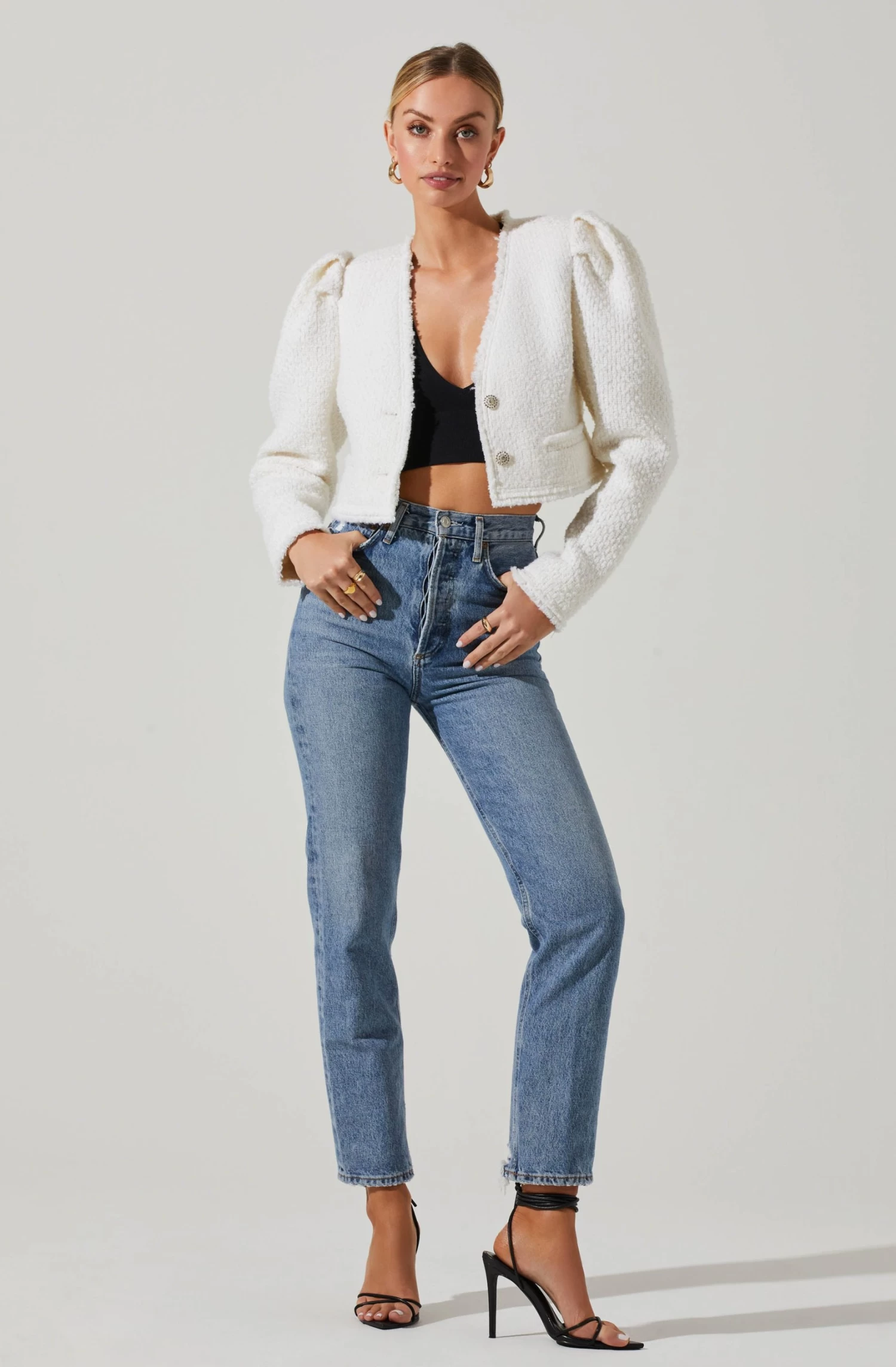 The Madrigal Jacket features a textured tweed finish that will surely elevate your wardrobe. Buttoned front leads to a cropped silhouette. Faux welt pockets. Long sleeves. Exaggerated shoulders.
