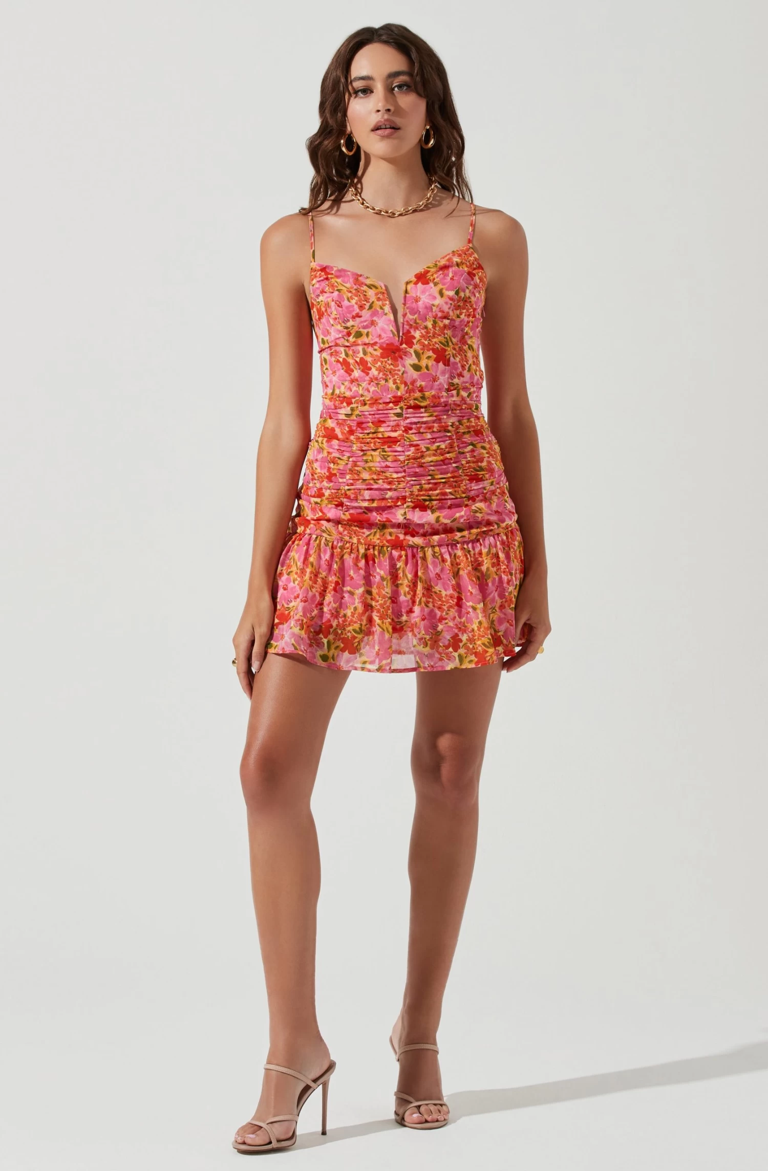 The Meg Dress features a ditzy floral print throughout. Sweetheart neckline leads to an underwired notch detail. Ruched bodice leads to a ruffle trim mini skirt. Fully lined. Concealed zip closure. Adjustable straps.