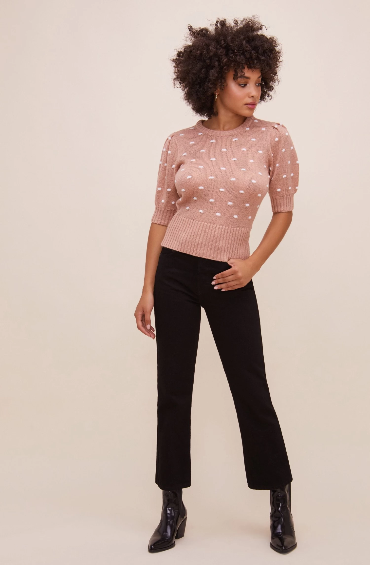 Why not sit pretty in the Melba Sweater? This knit features a crew neckline, polka dot pattern and short sleeves with ribbed detailing.