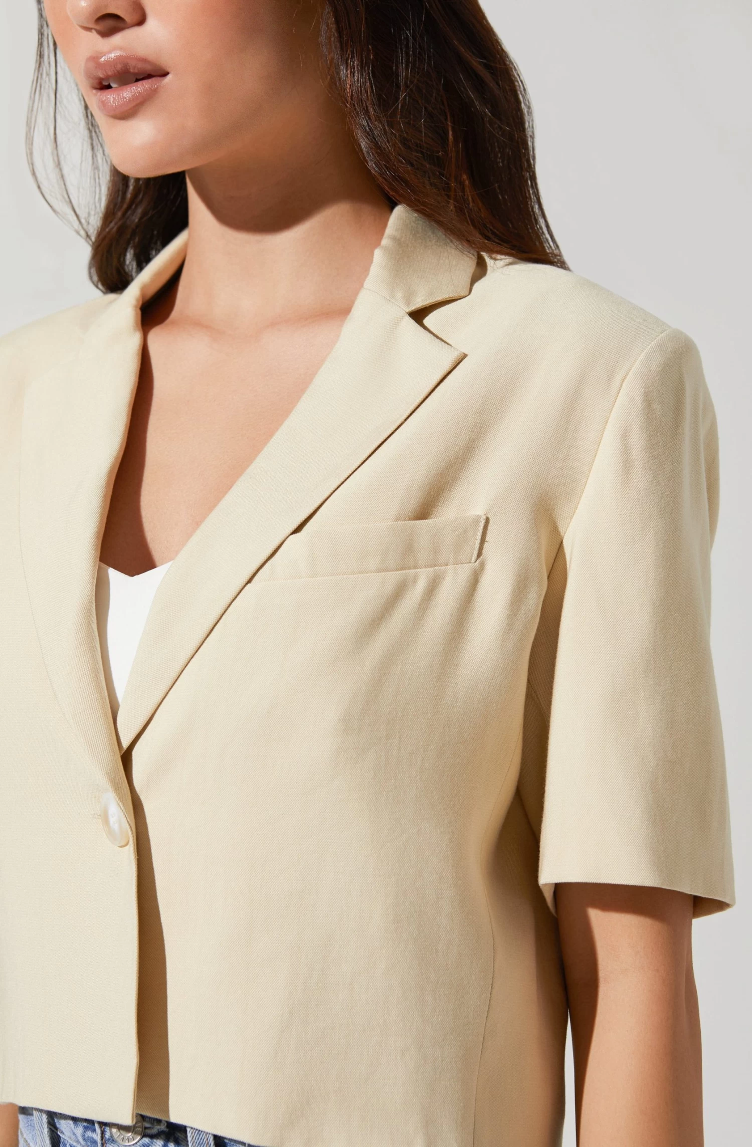 Effortlessly chic and modern. This jacket features a short sleeve construction with a notched collar and single-button accent. Flap pocket along the chest. Fully lined.