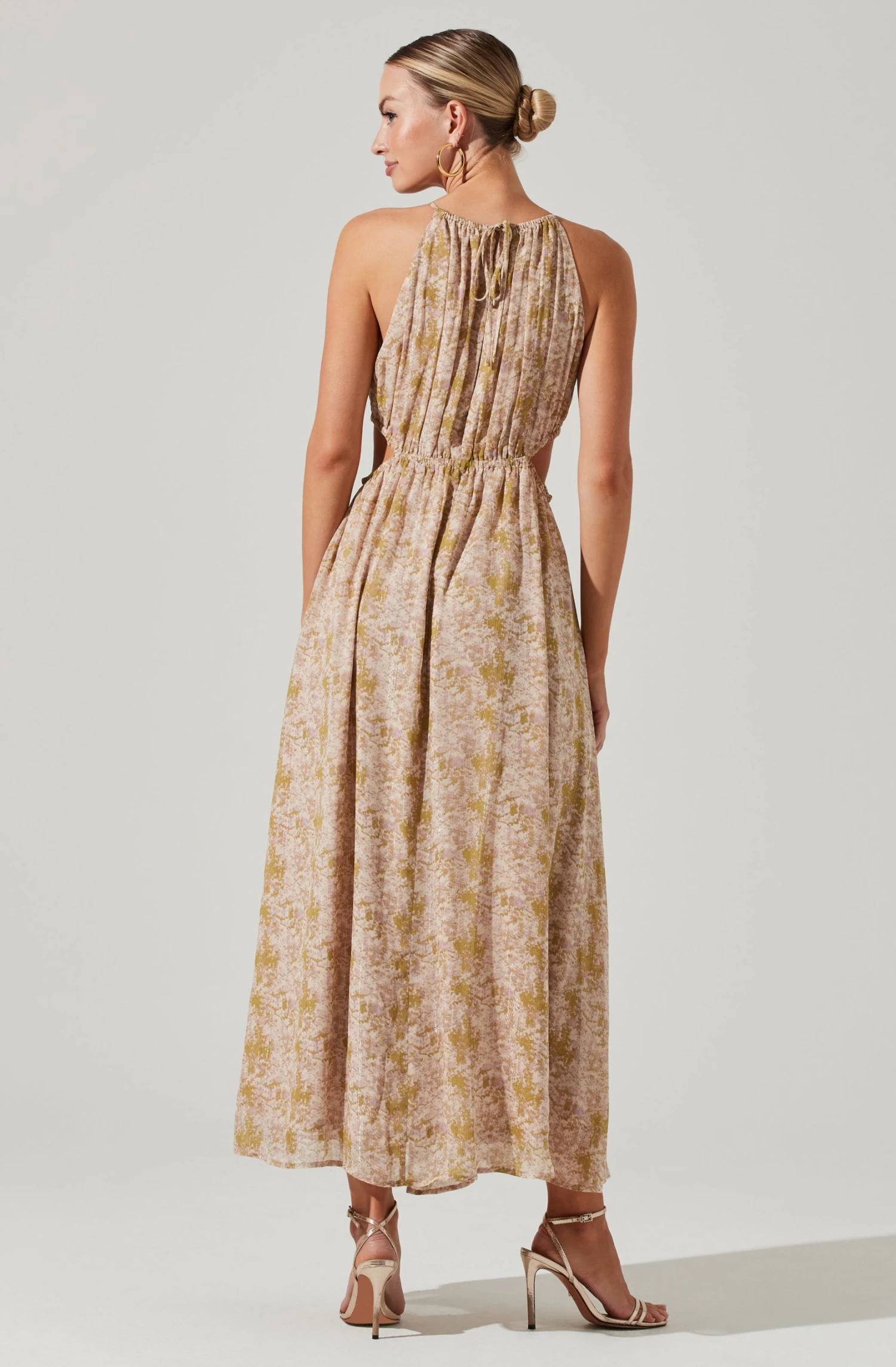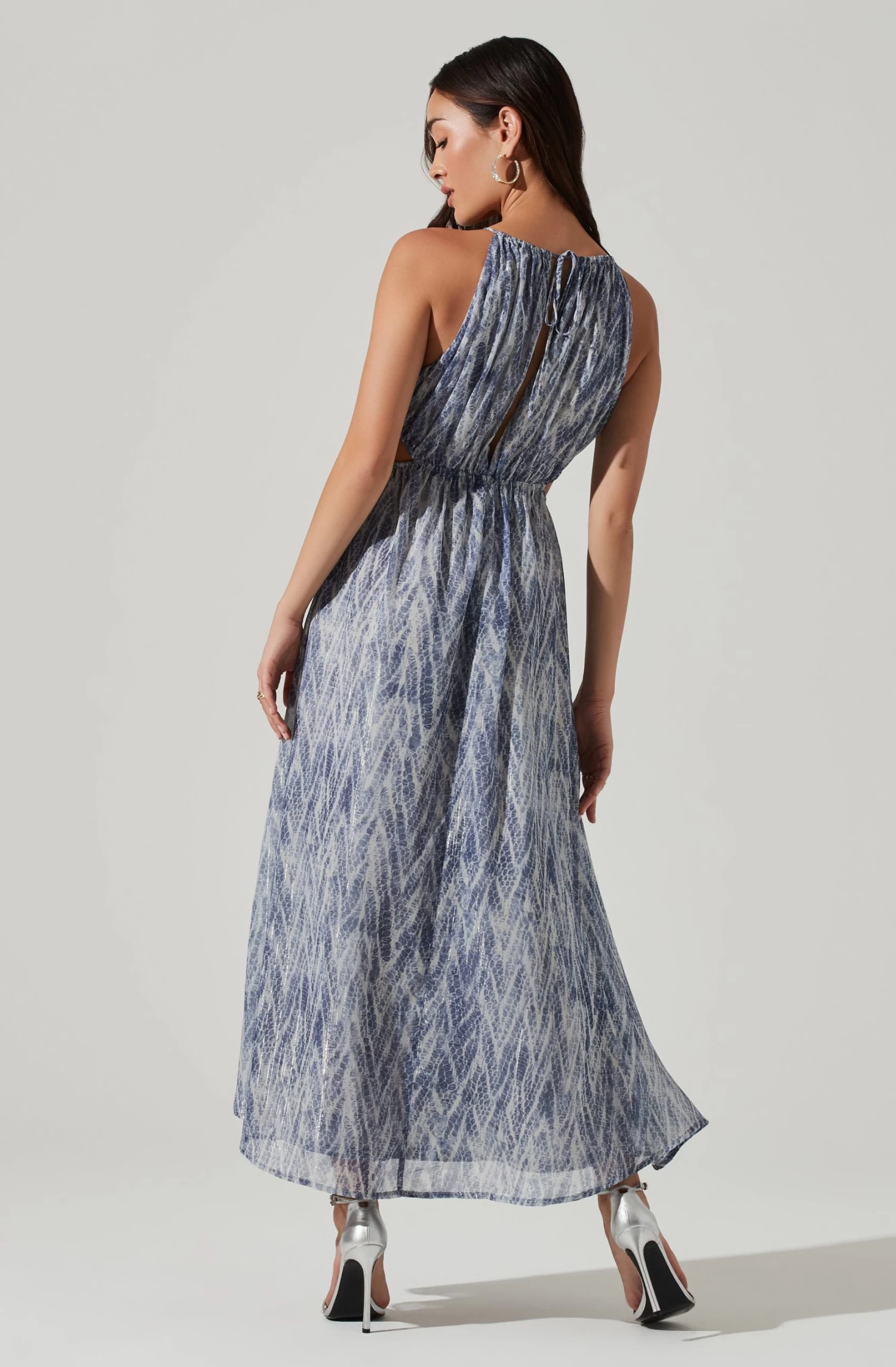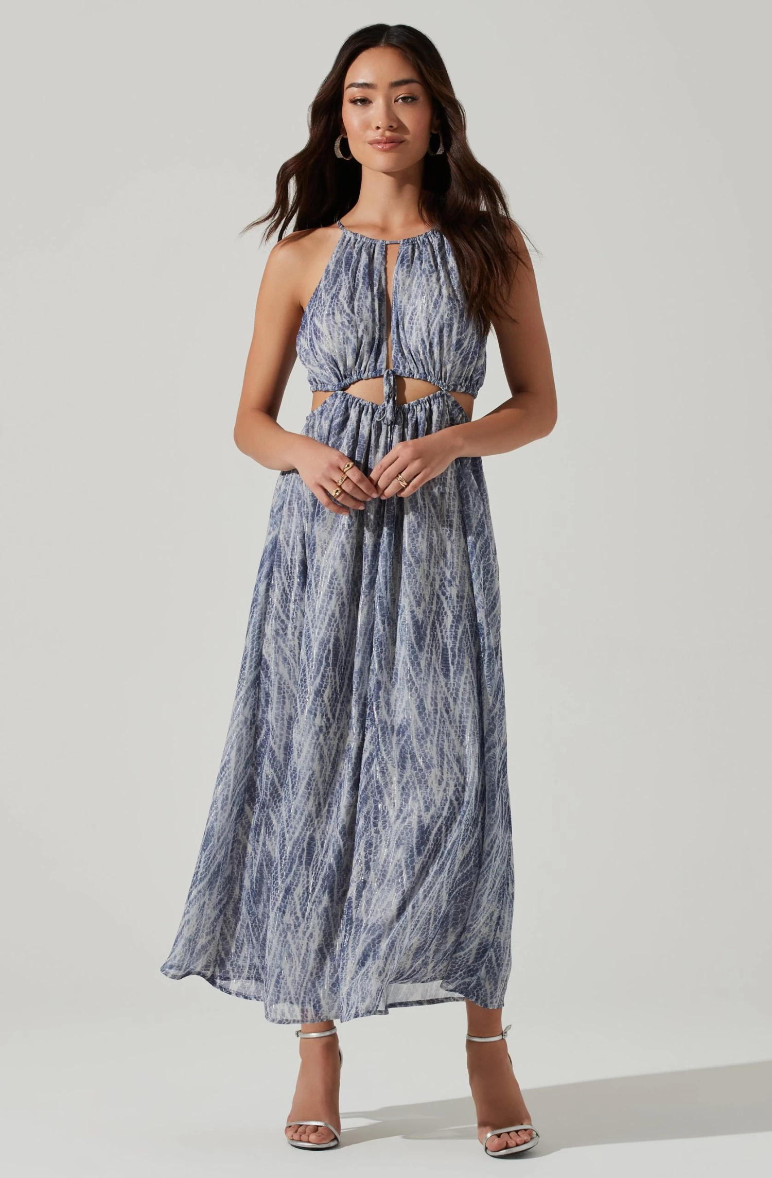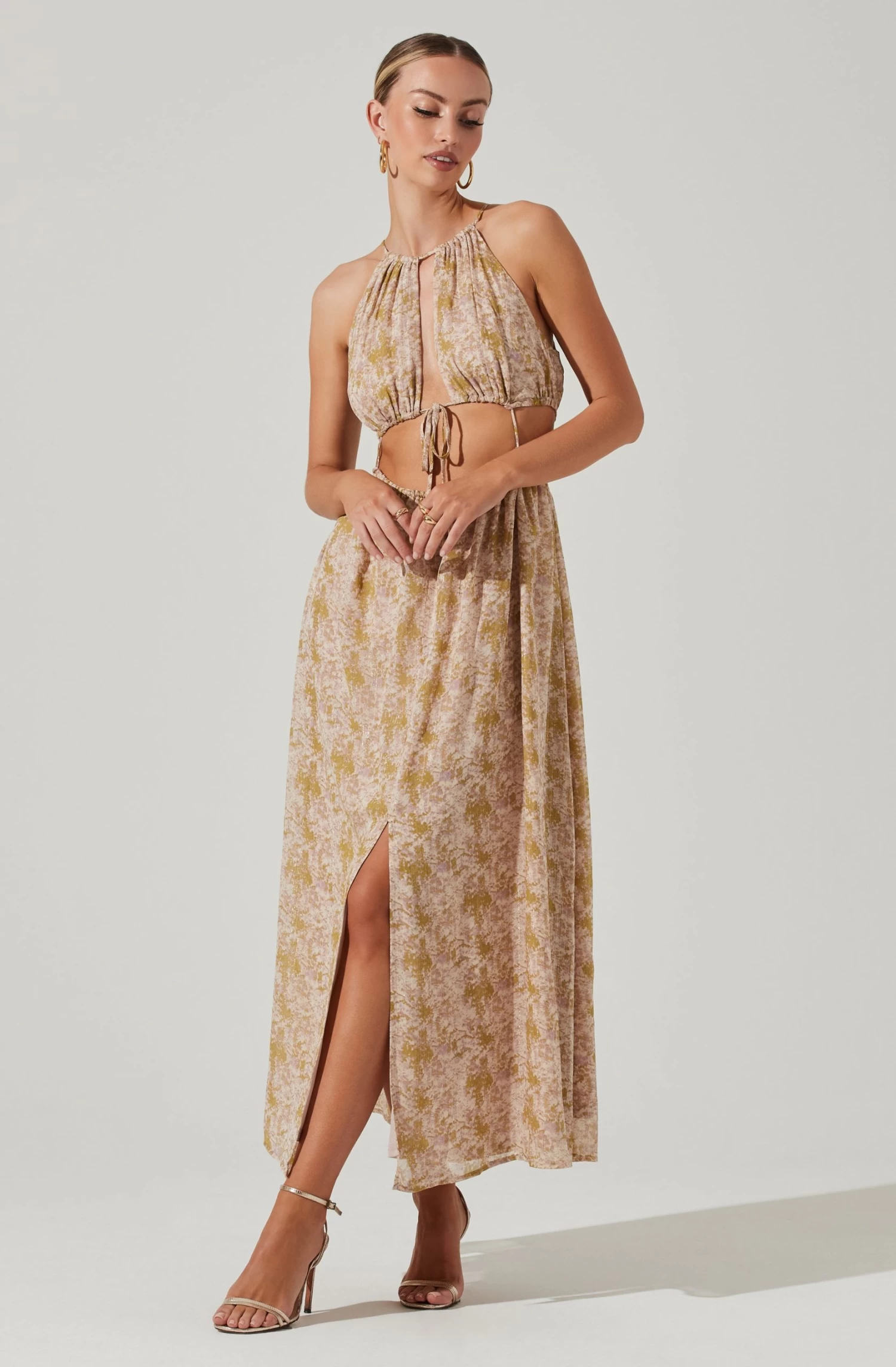 This maxi dress features a halter neckline that leads to a plunge neckline and cutout midriff with drawstring accents. Maxi skirt features a front slit accent. Keyhole back.