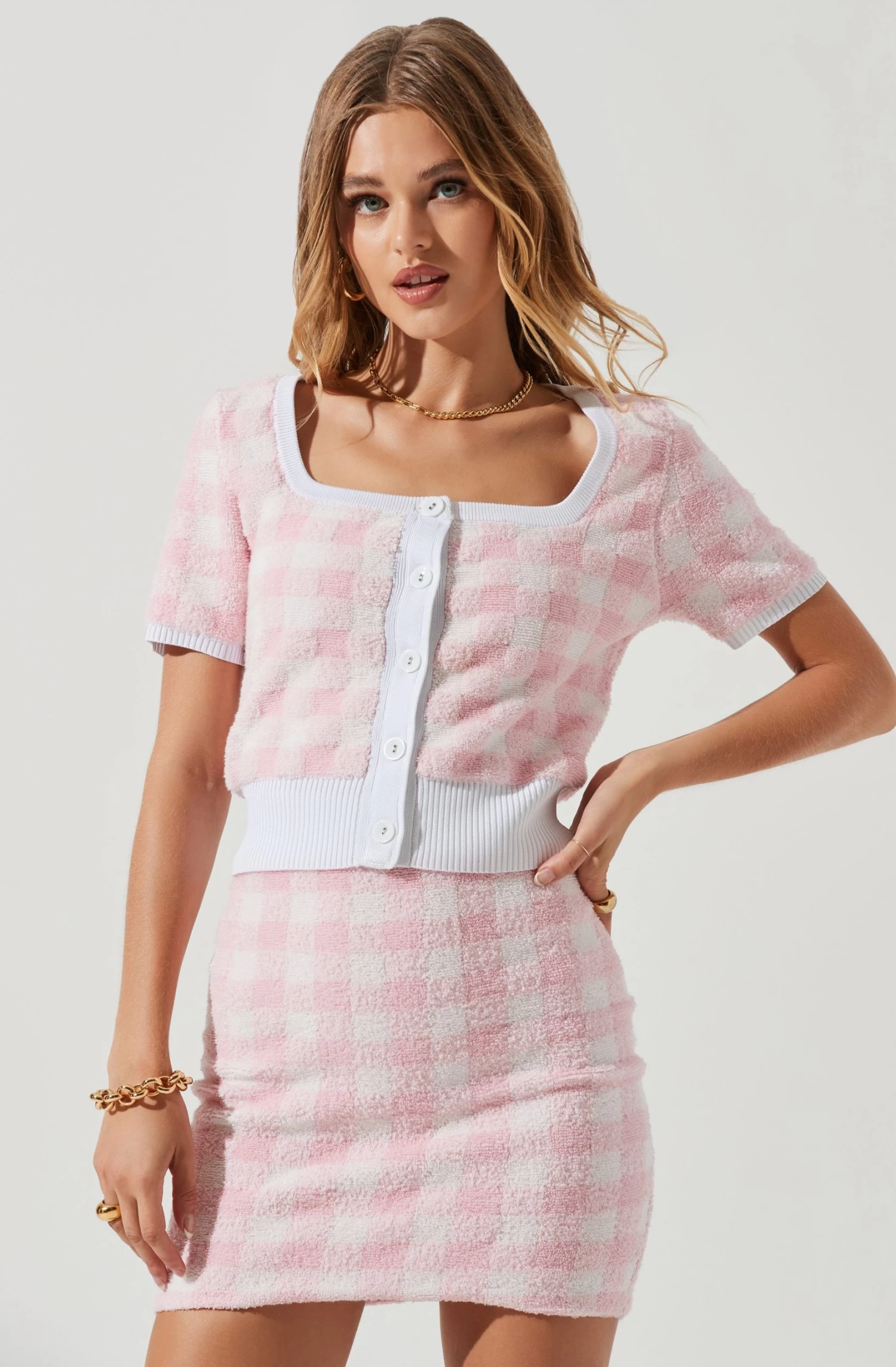 This short sleeve sweater features a soft, terry cloth construction. Square neckline leads to a front button placket. Checkered print.
