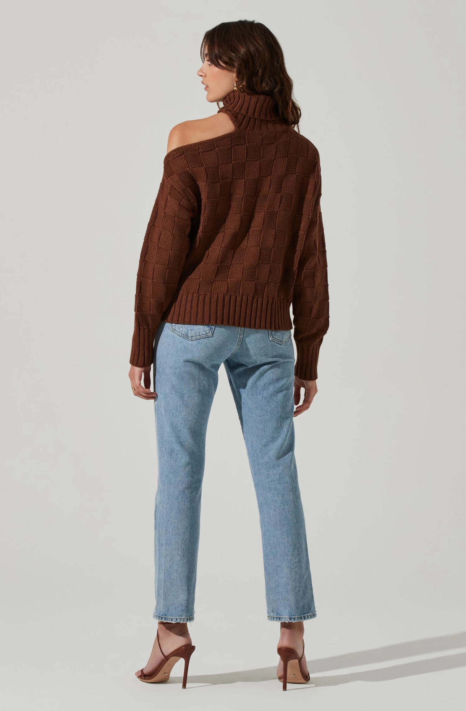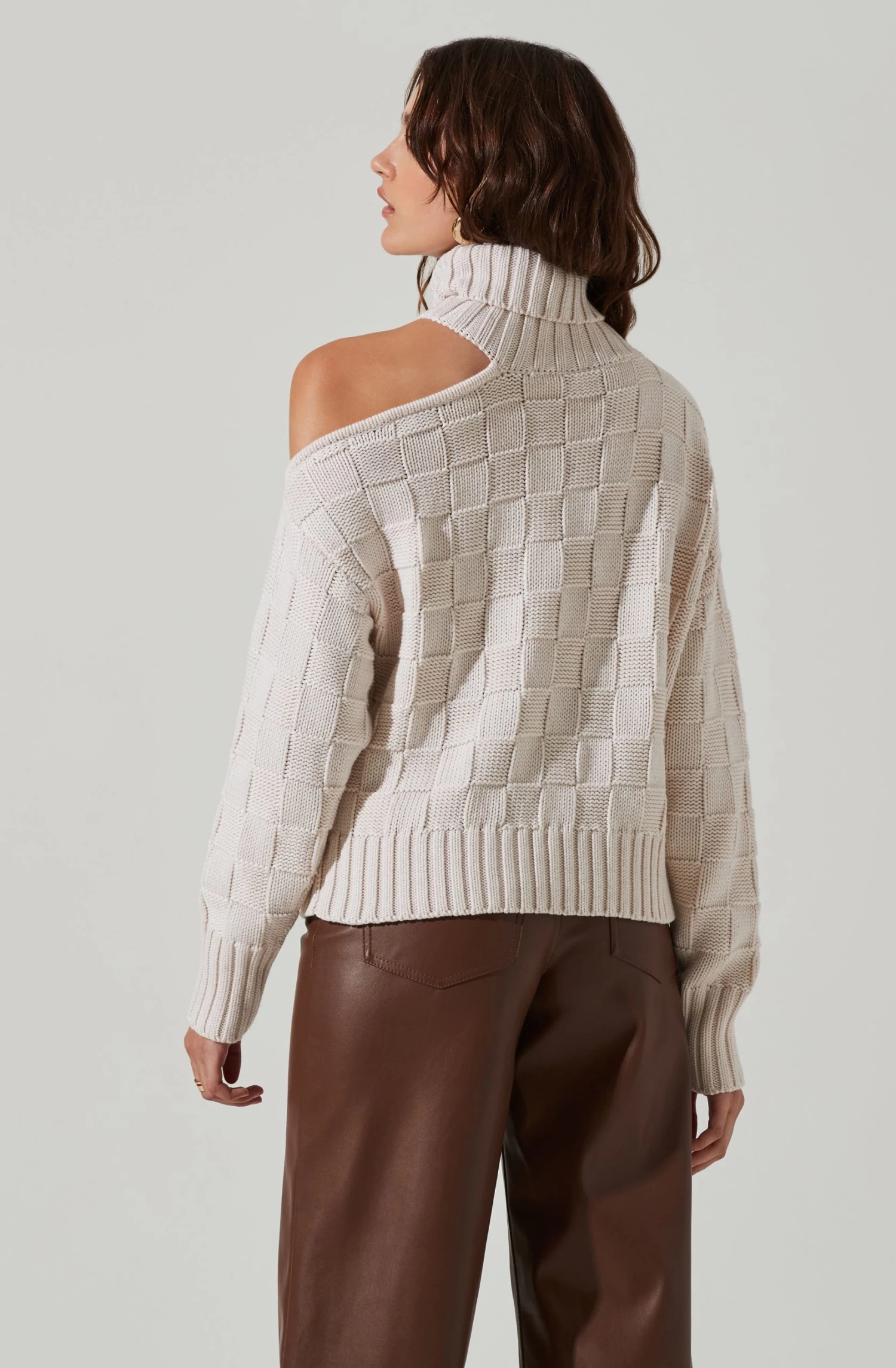 Get cozy in this cable knit sweater. It features a mock neck collar that leads to a single shoulder cutout accent. Long sleeves.