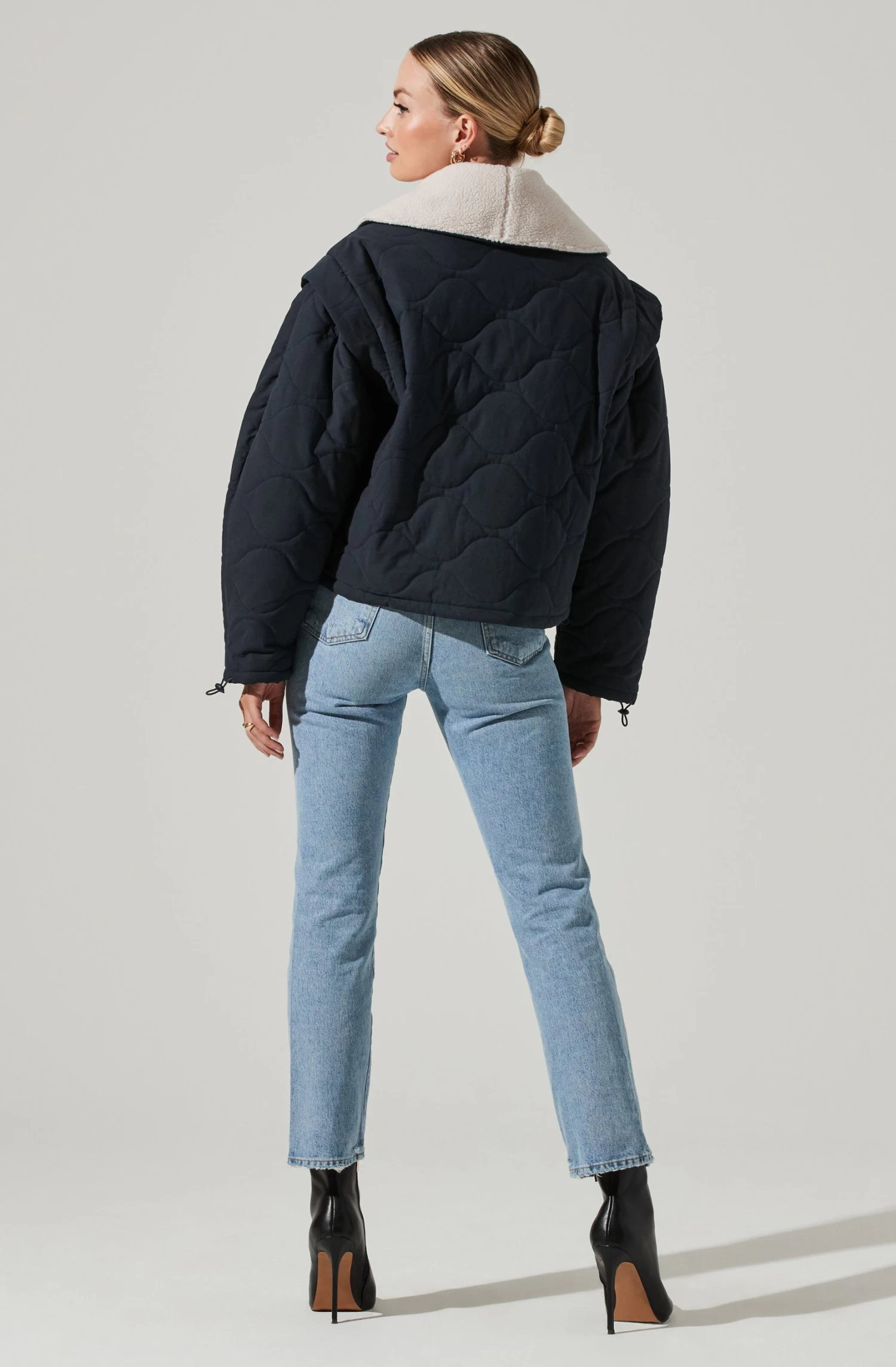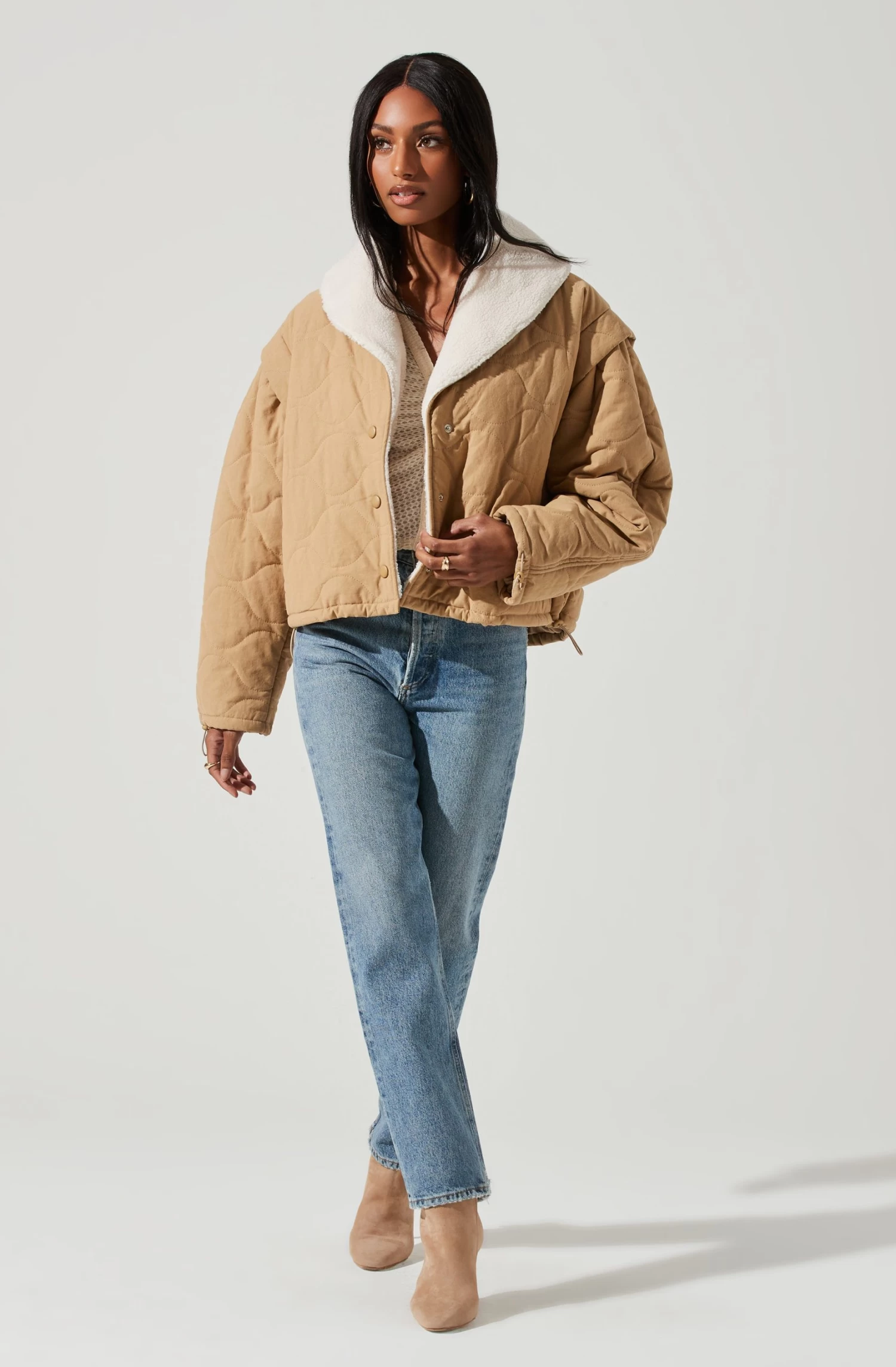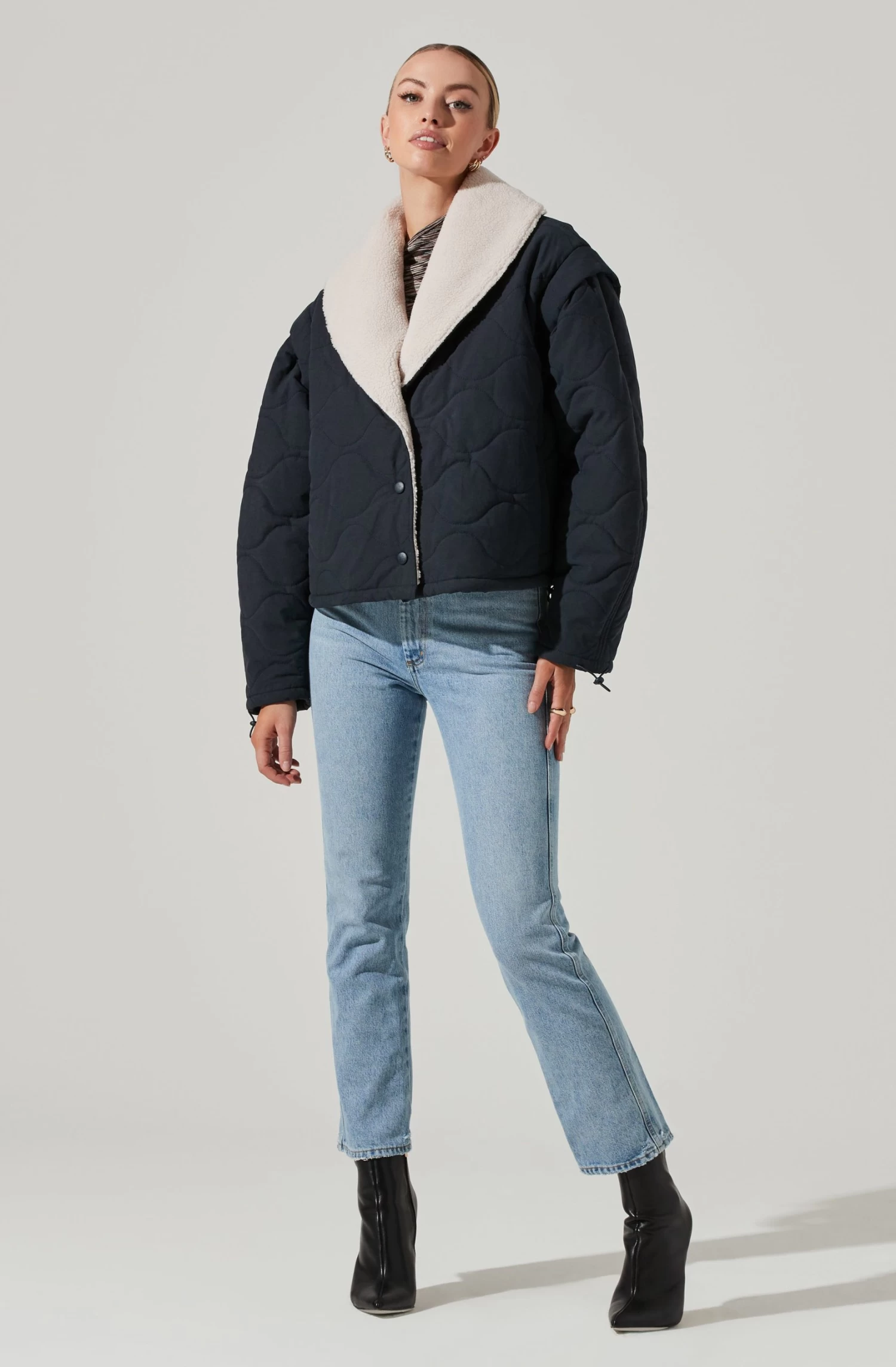 Warm up with the Nadine Jacket. It features a classic quilted design with snap button closures and faux shearling collar. Cinched detail features a drawstring accent along the waist and cuffs. Flap pockets along the sides. Long sleeves. Fully lined.