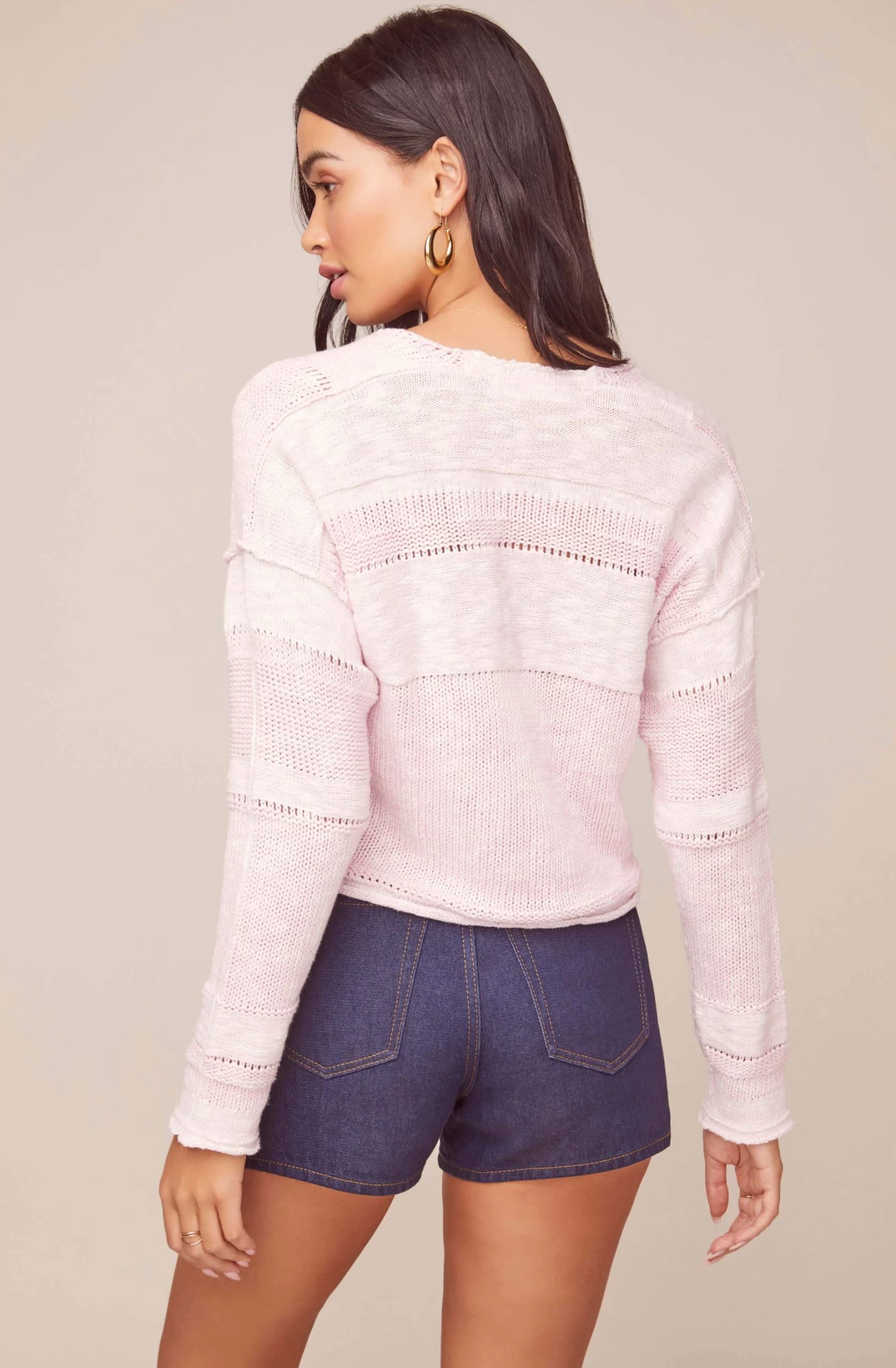 Featuring a cheerful strawberries and cream color combination, the Naomi Sweater gives you the best of spring! This knit starts with a V neckline along with a contrast trim along the front and sleeves. Cropped hemline. Long sleeves.