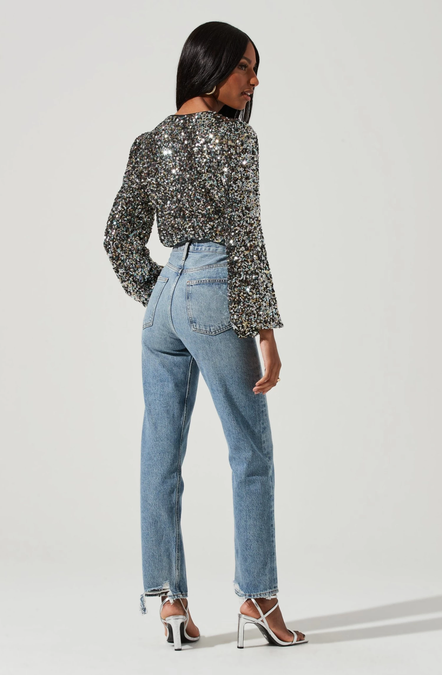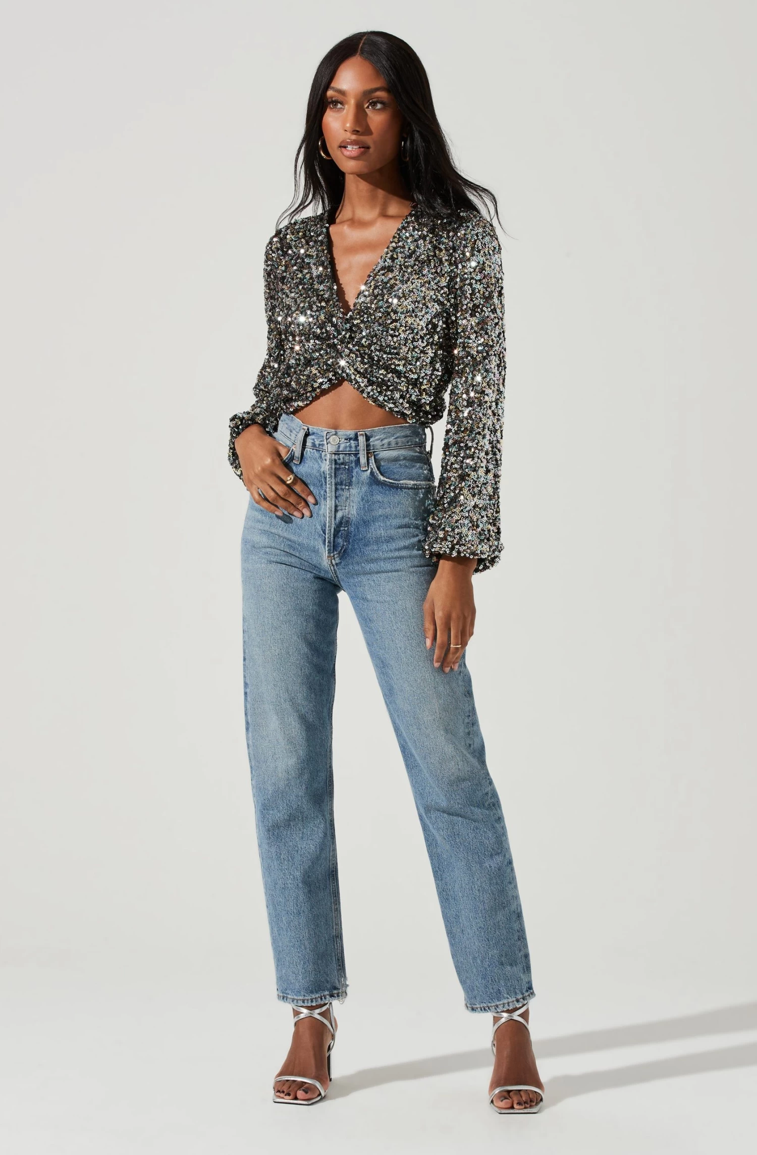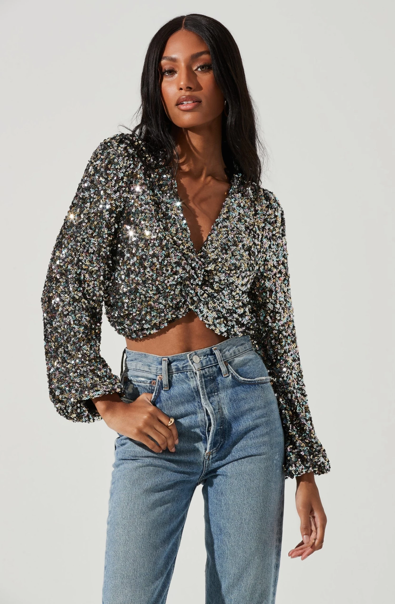 The Nix Top features a textured, high-shine sequin finish. Plunging neckline meets a wrapped front and cropped hem. Long sleeves.