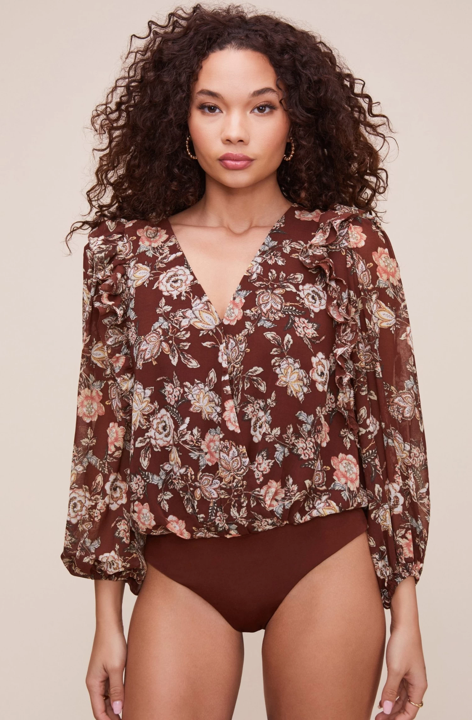 Meet your new favorite bodysuit! The Odette features a V neckline that leads to a surplice front. Ruffle shoulders descend to long sleeves.