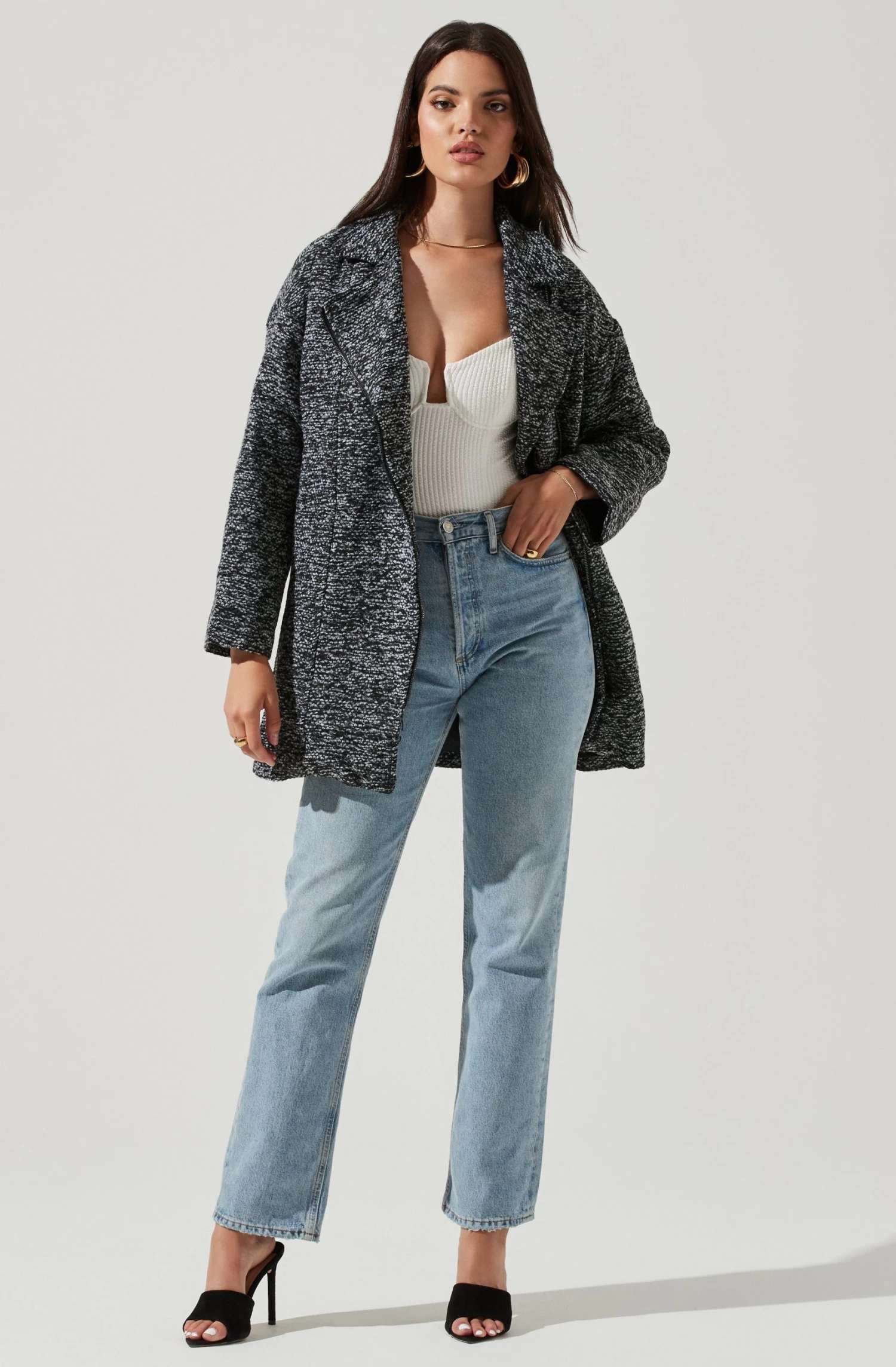 There’s nothing like a statement coat to tie an outfit together. This style features an oversized fit, notched collar and marled print. Long sleeves. Side pockets.