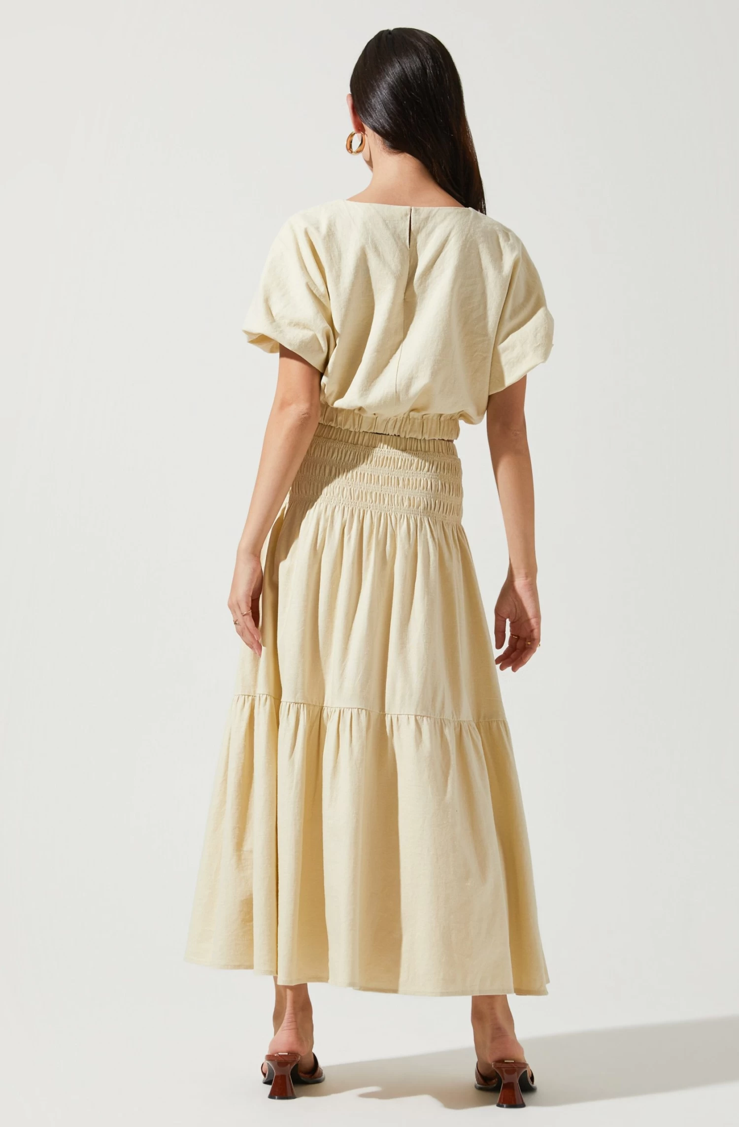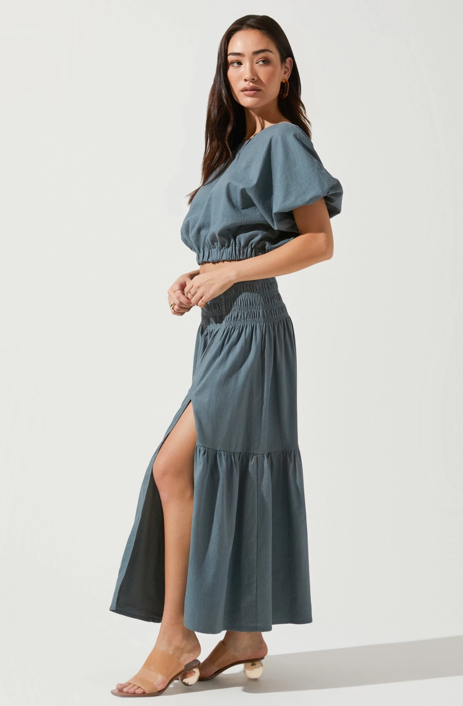Enter a dreamy oasis. This midi skirt features a smocked waist that leads to a tiered and loose midi skirt silhouette. Front slit accent.