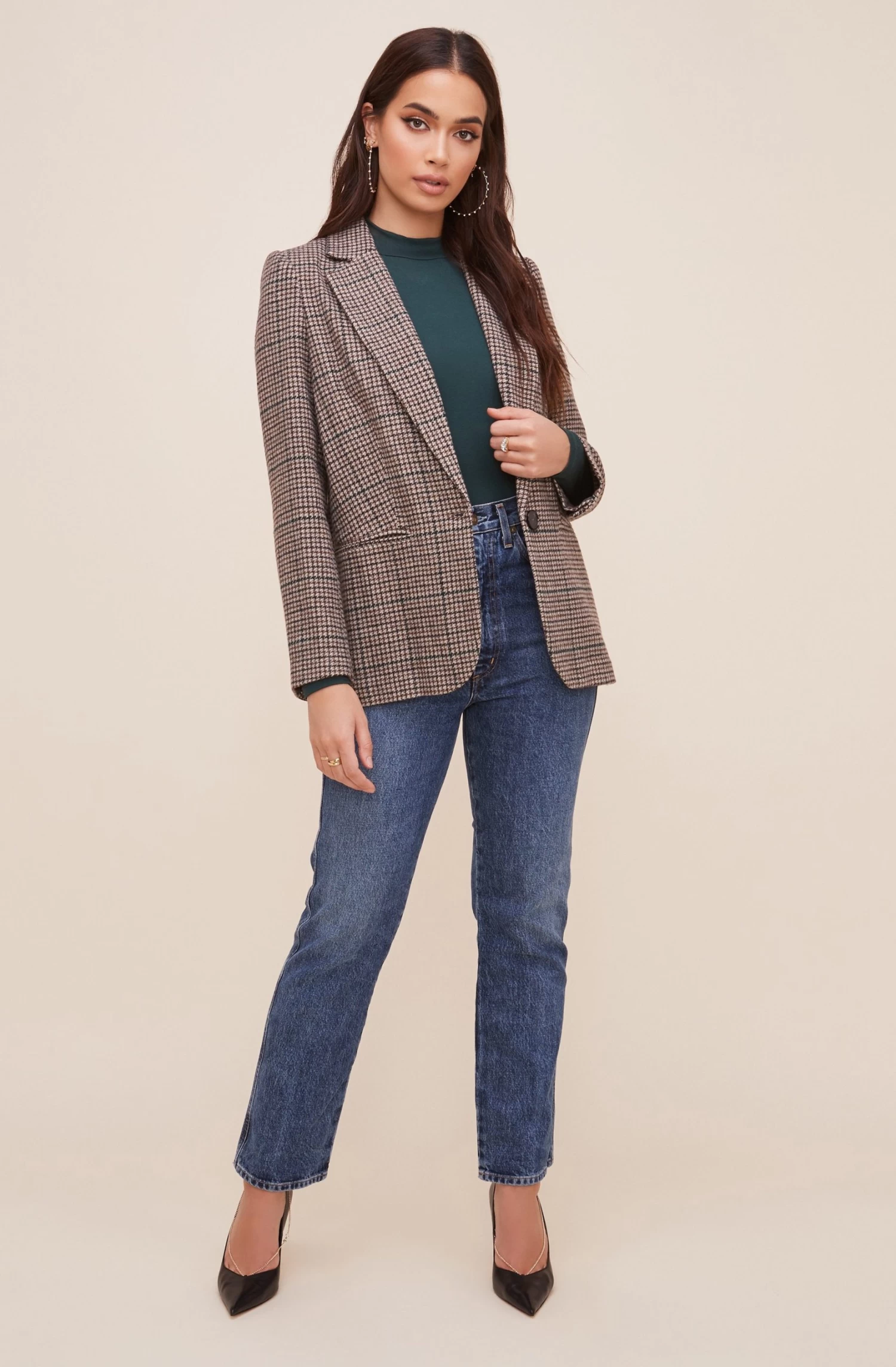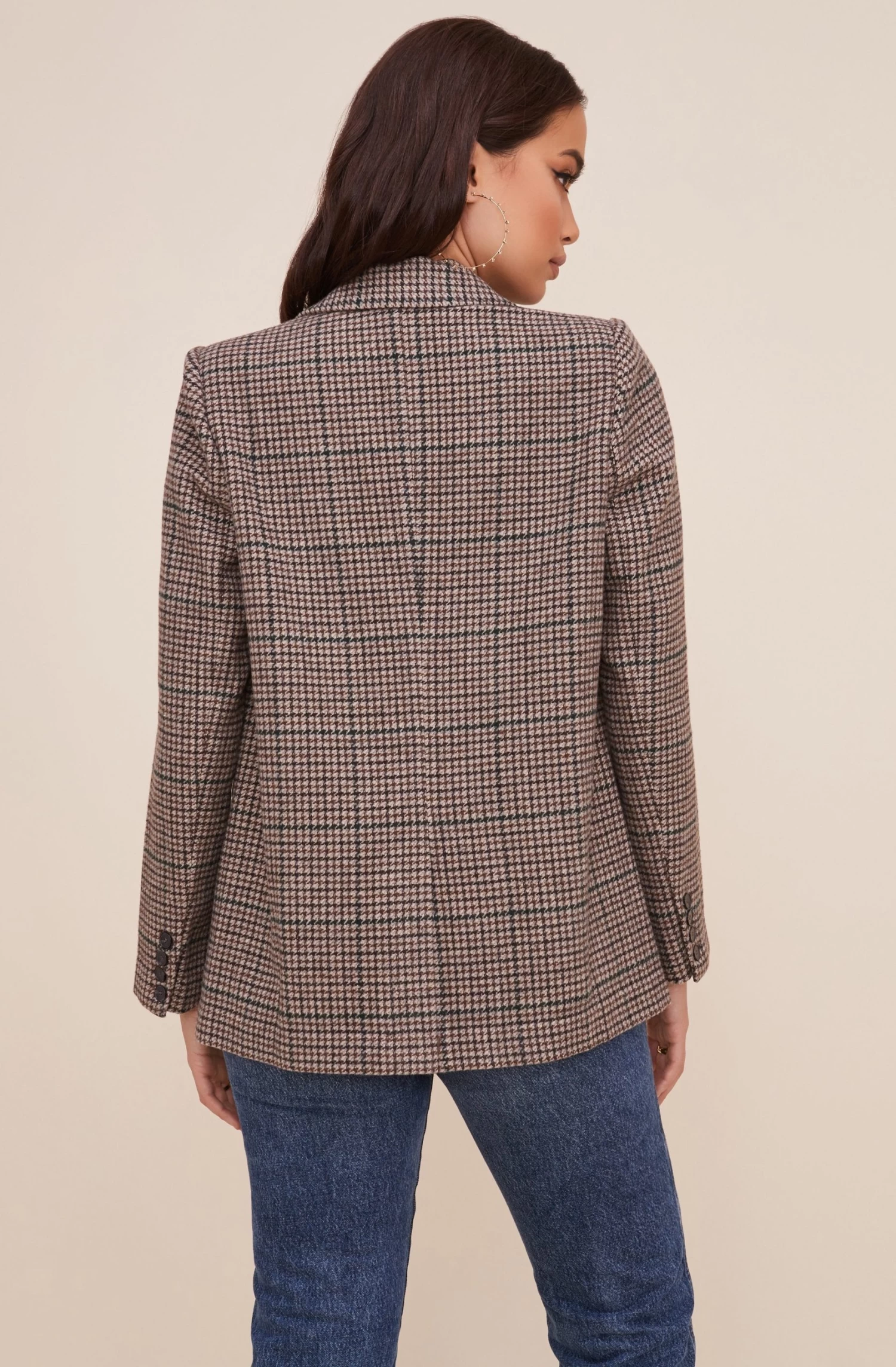 You can’t go wrong with plaid. This elevated blazer features a notched lapel, buttoned front and double flap pockets at the hips. Long sleeves.