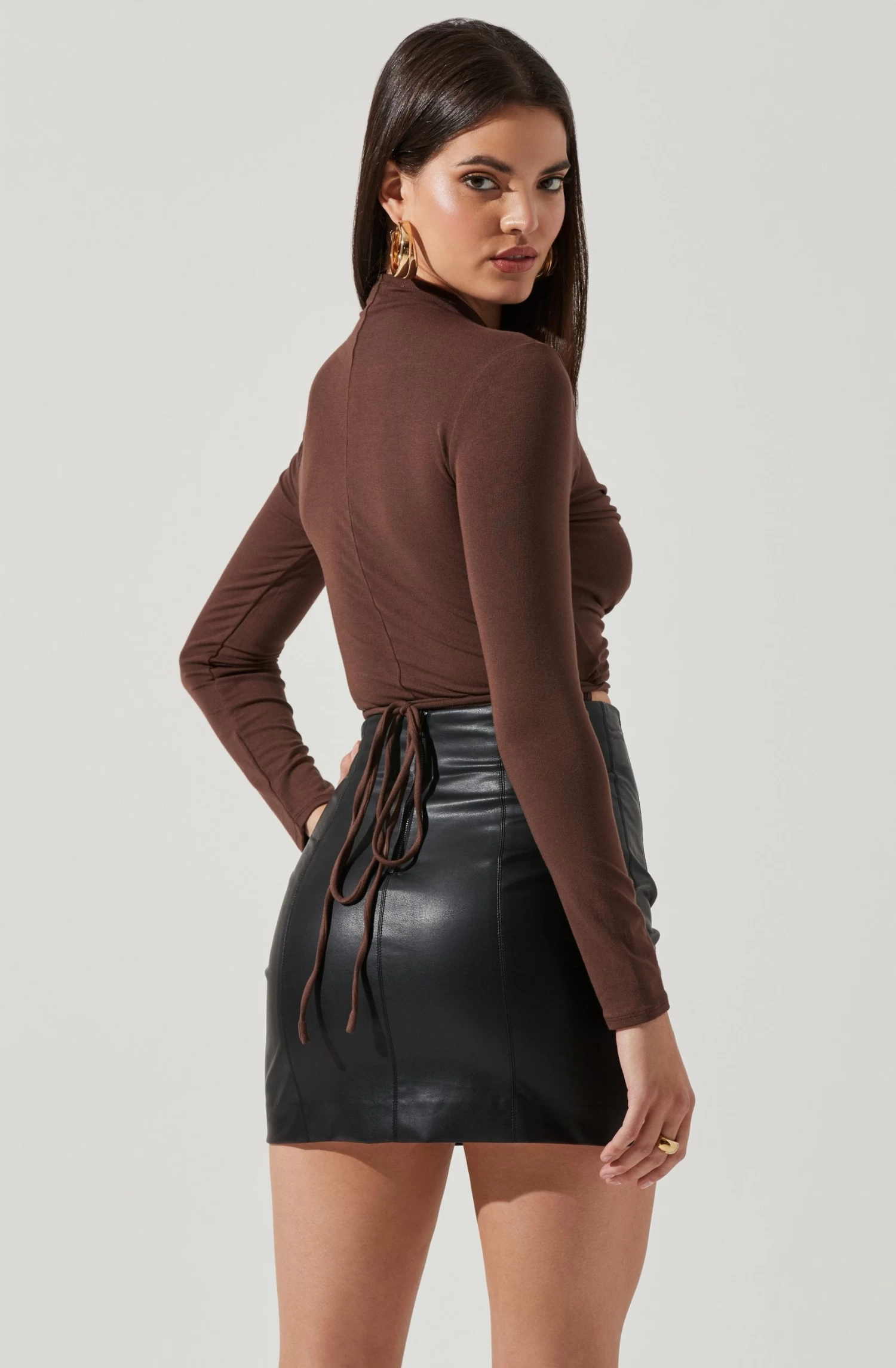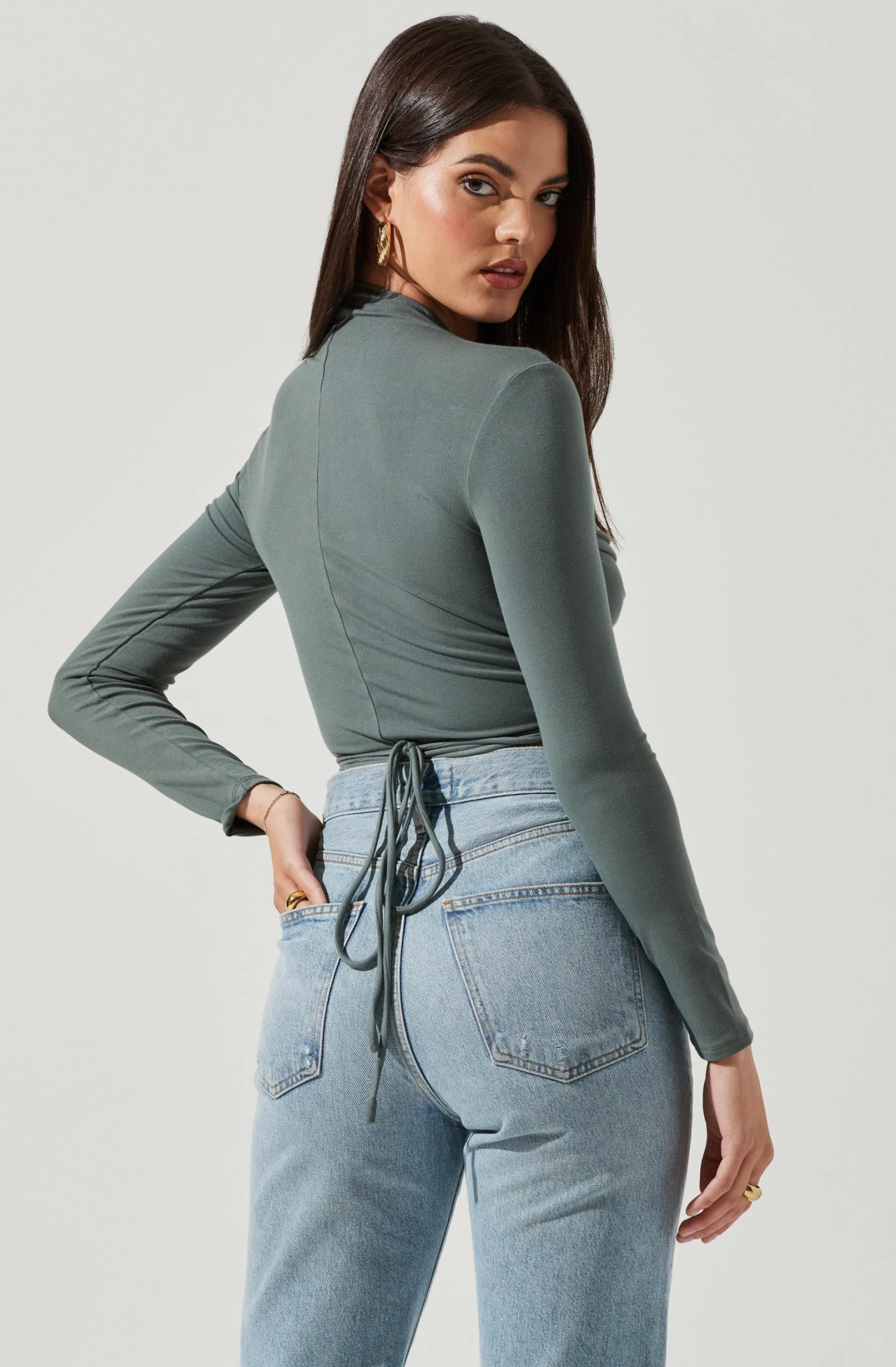 The Reseda Top features a funnel neckline that leads to a cutout front with a cinched bodice. Wrap around tie waist. Long sleeves. Cropped hem.
