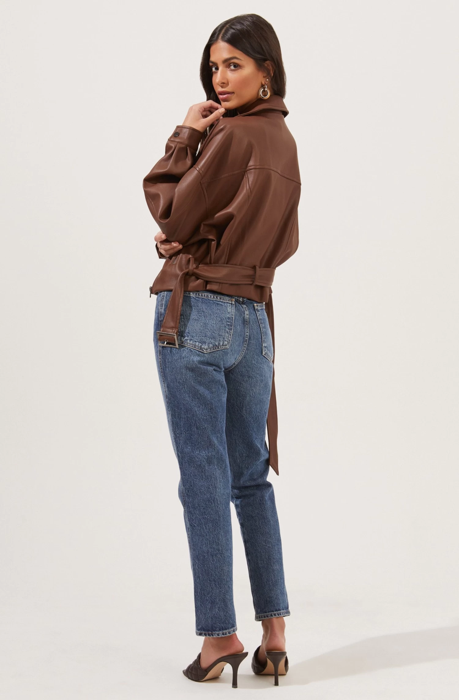 The Rubia Jacket features a faux leather construction with a notched lapel that descends to a zippered front. Long oversized sleeves with buttoned cuffs. Belted waist accent.