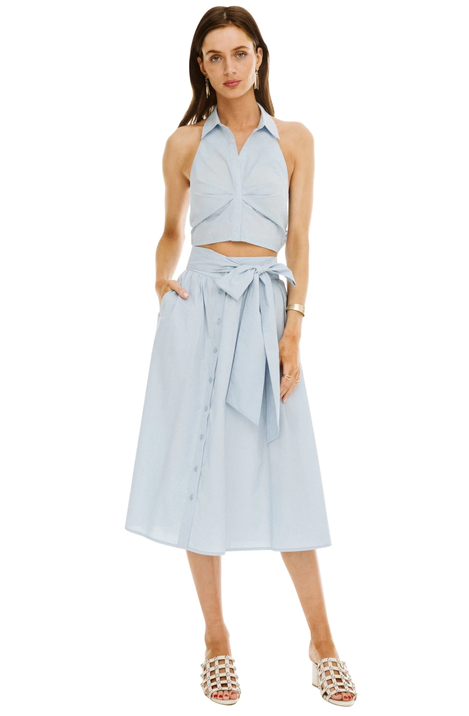 100% Cotton, Length: 27 3/4″ (Size M), Dry Clean Only, Midi Button Up Skirt, Tie Waist, Model is Wearing Size S, Model’s Measurements: Height 5’10” // Bust 31″ // Waist 24″ // Hips 33.5″, Fits True to Size, Style#ACS8079