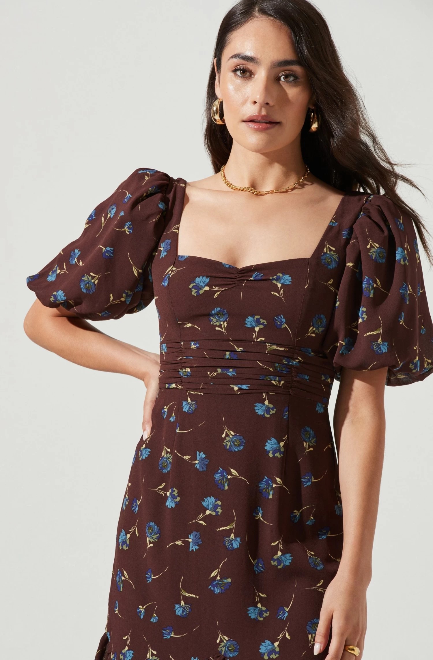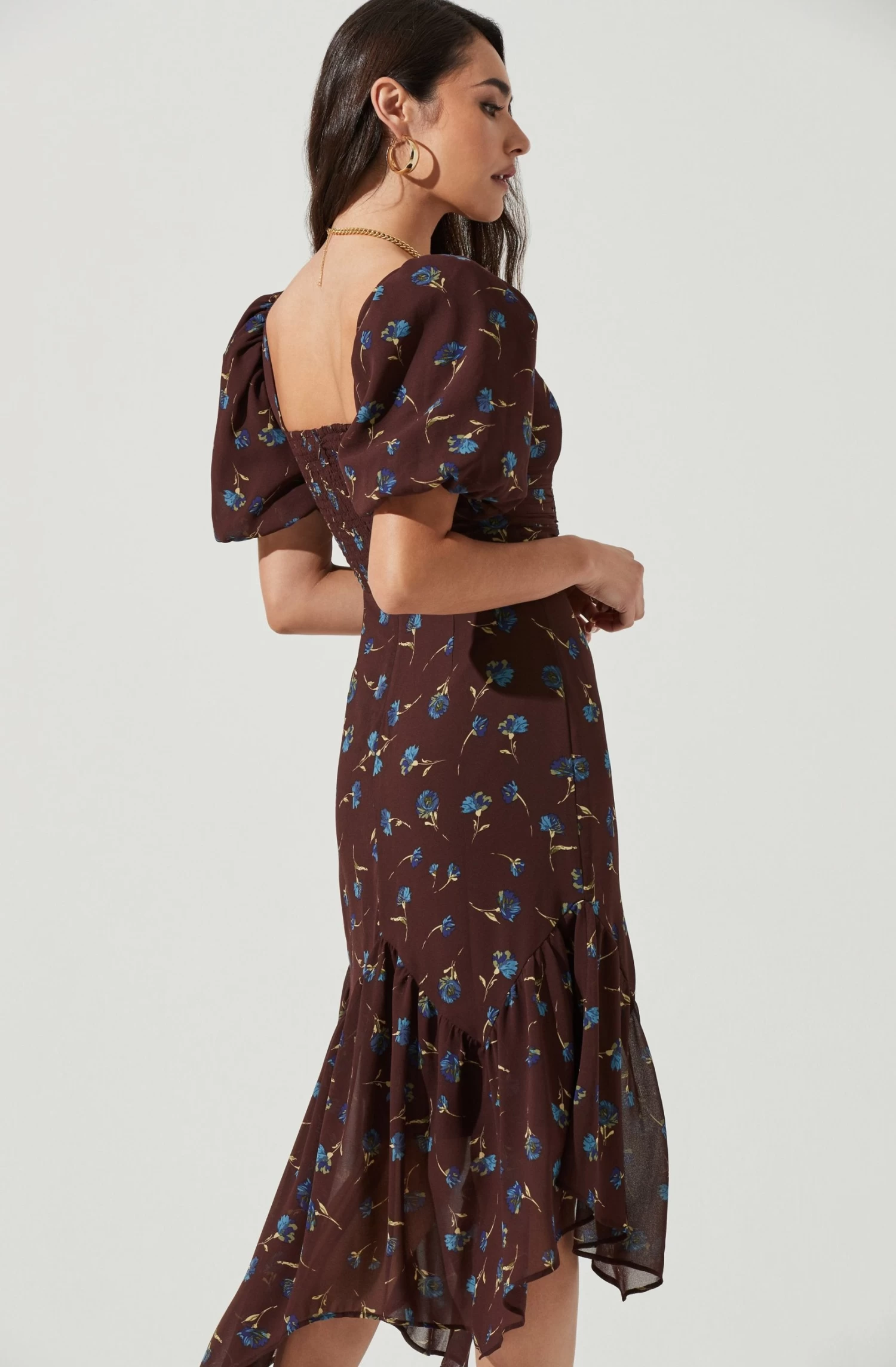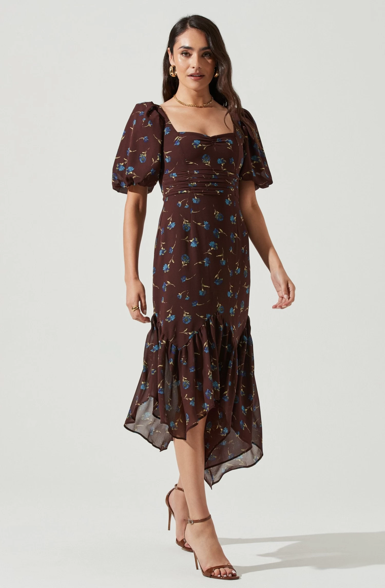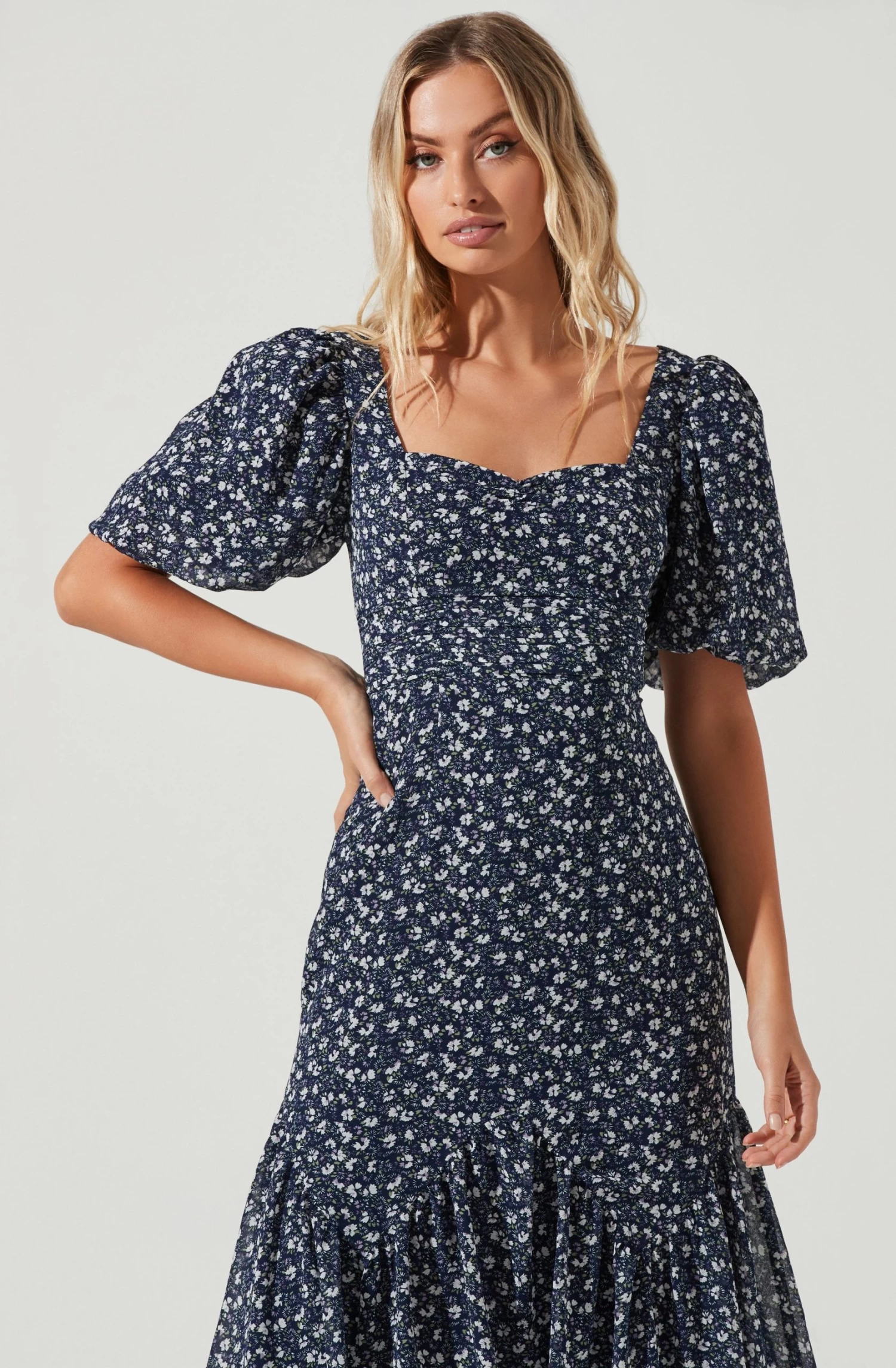 This swoon-worthy dress features a sweetheart neckline with a gathered bust. Ruched bodice leads to an asymmetrical midi skirt. Short puff sleeves. Ditsy floral print throughout.