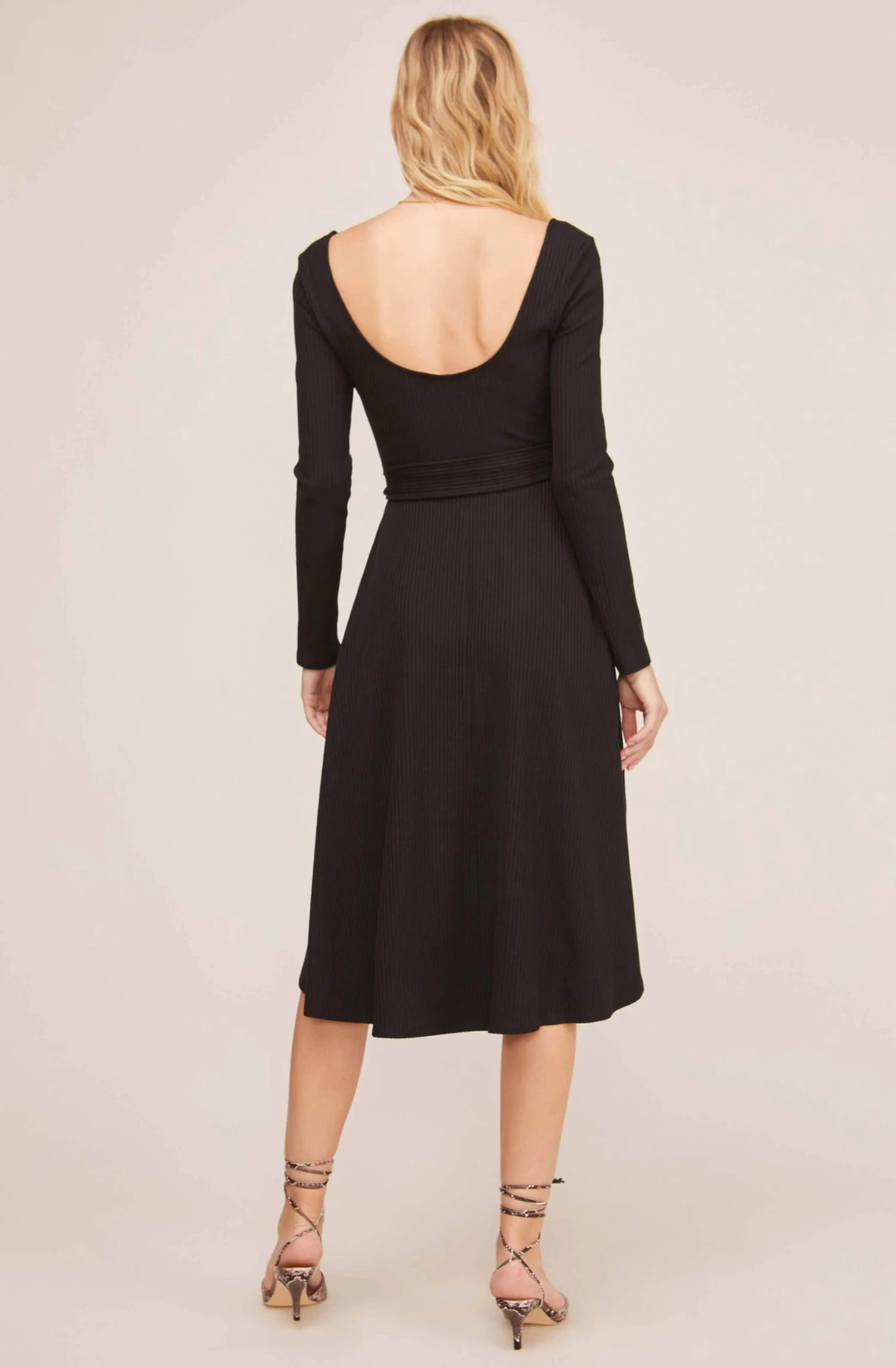 It’s the fall outfit you’ve been waiting for. This ribbed knit midi dress is perfect for staying warm while looking chic. Square neckline and darted bust frame the figure and descend to a knot waist. Flowy midi skirt and long sleeves. Scoop back.