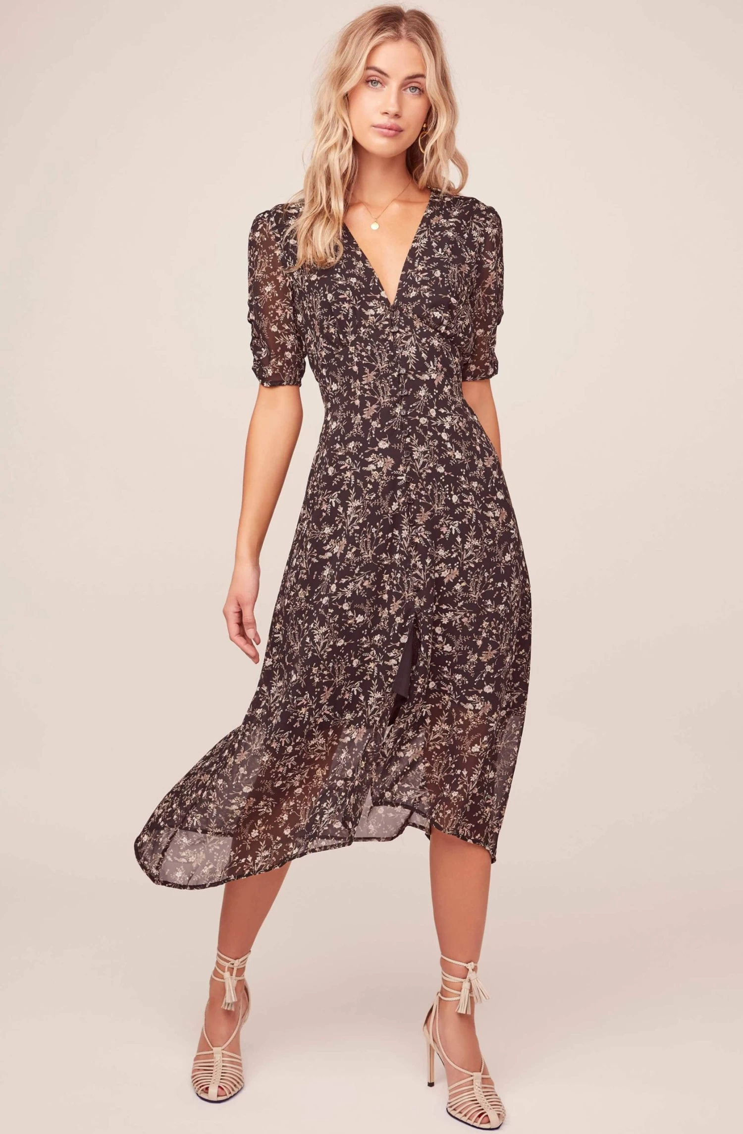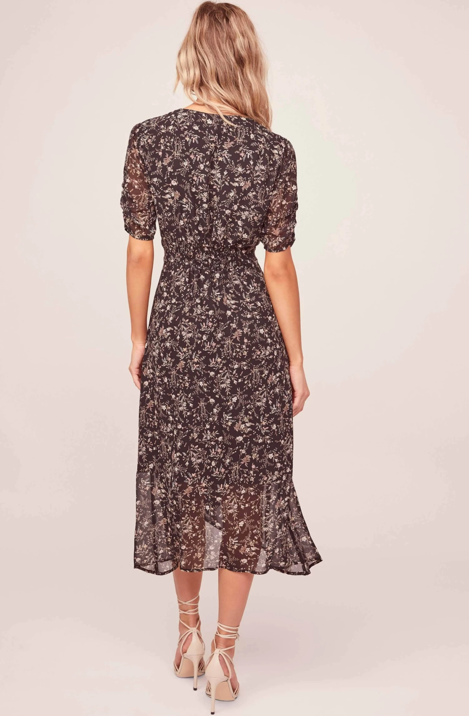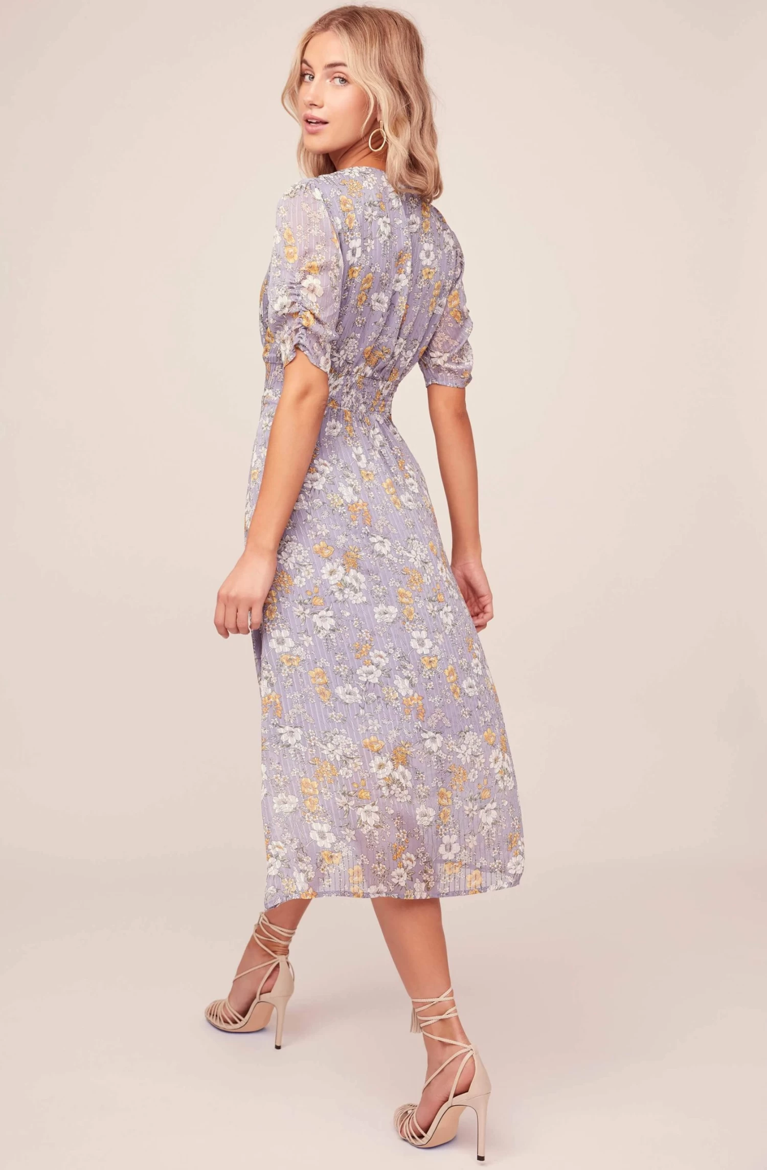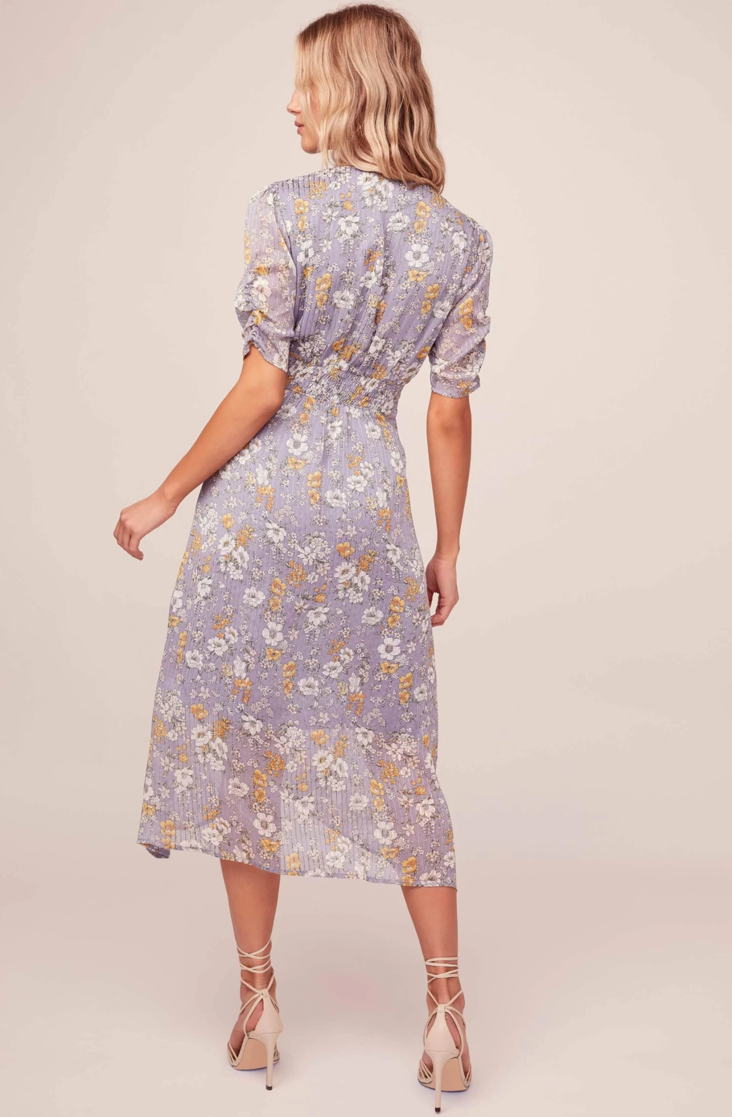 Picture this: a summer picnic in a darling midi! This dreamy floral print dress features a plunging neckline that highlights the decolletage and descends to a seamed bust. Front button placket adds delicate detailing and flows to fully lined midi skirt. Short ruched sleeves for a touch of whimsy. Smocked back.
