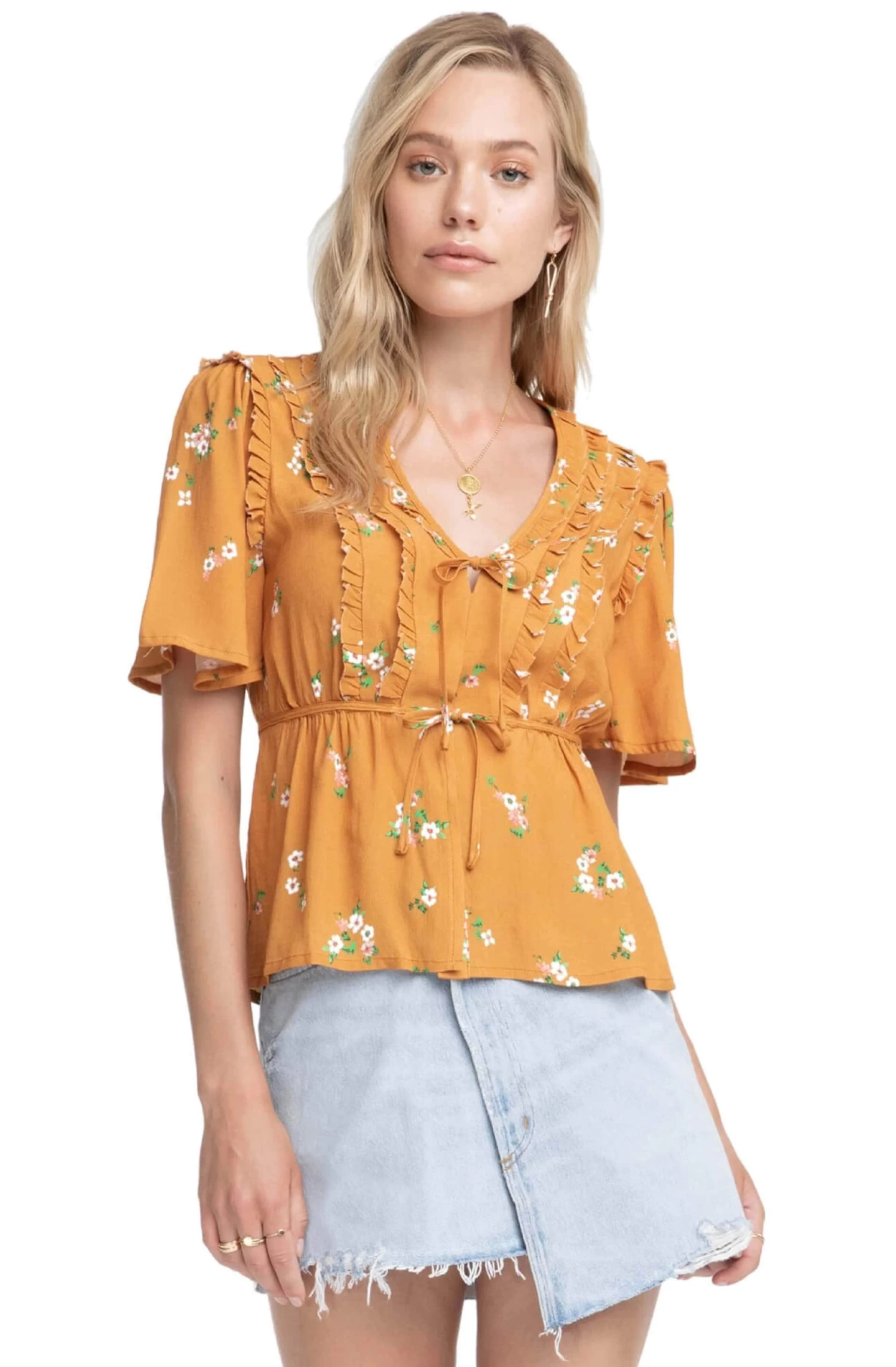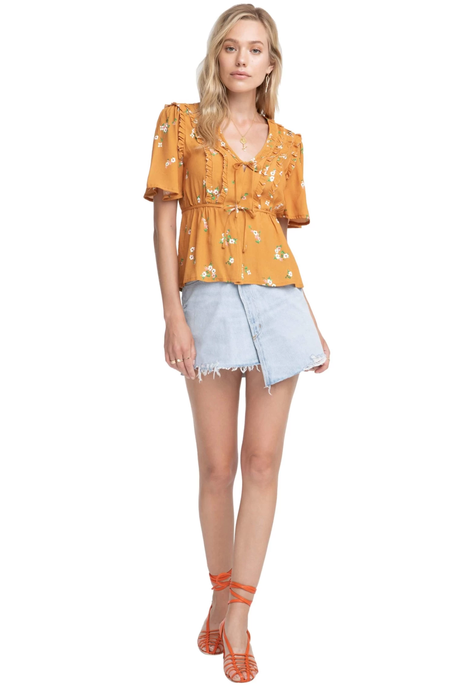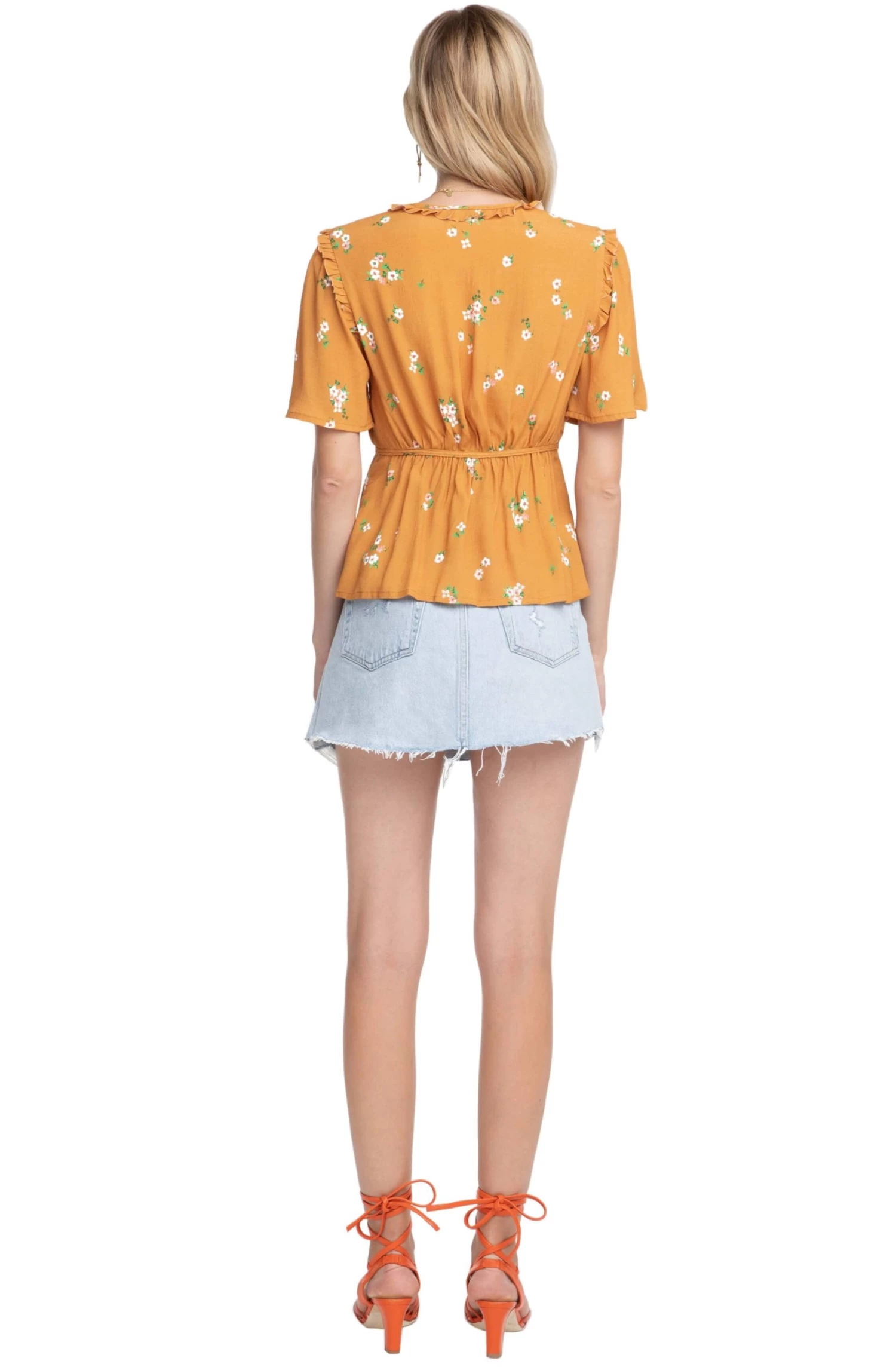 A cheerful short sleeve top has a subtle floral print design that emulates all things spring. V neckline accentuates a ruffled bodice and cinched waist frames a slightly flared hem.