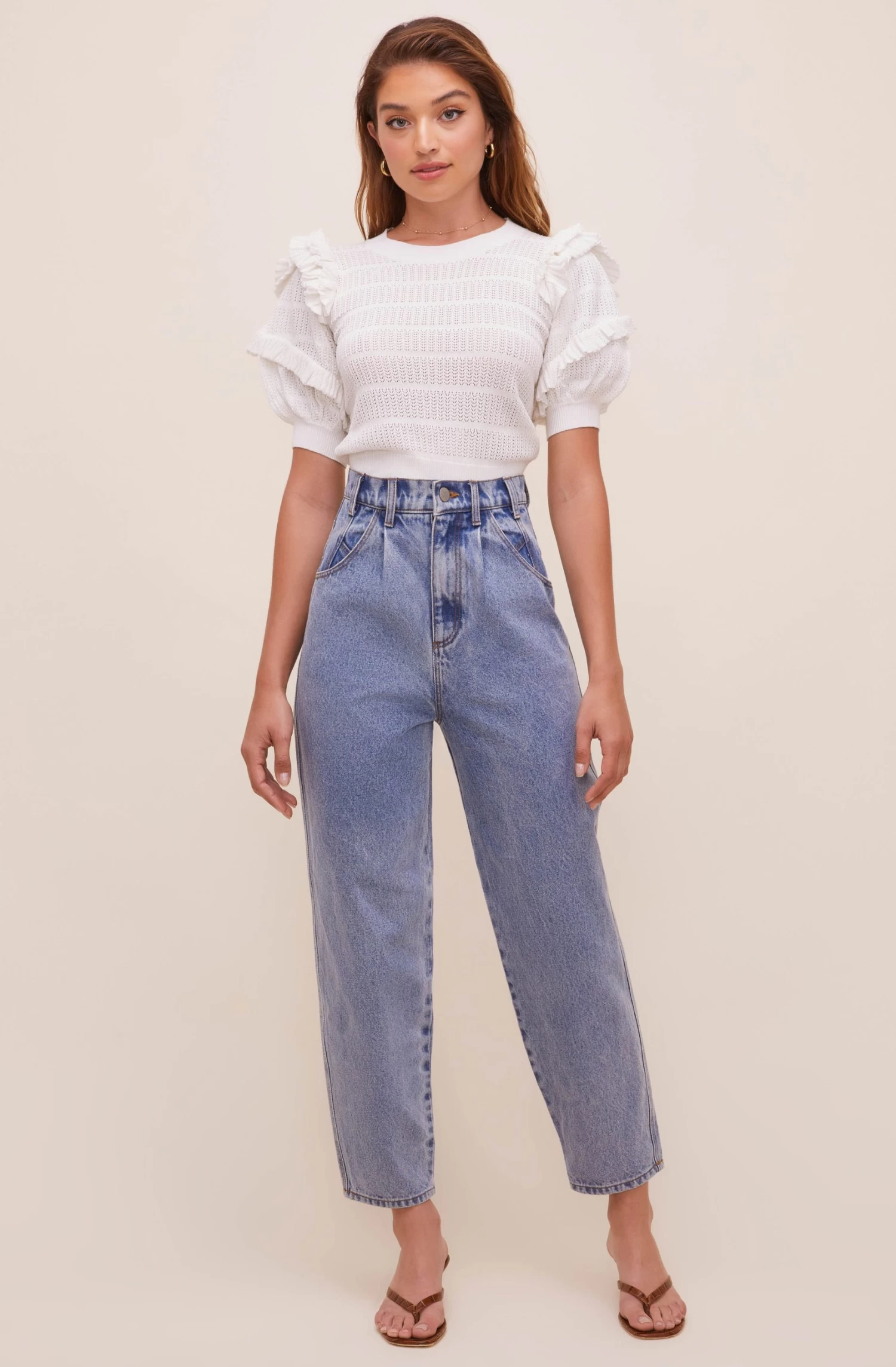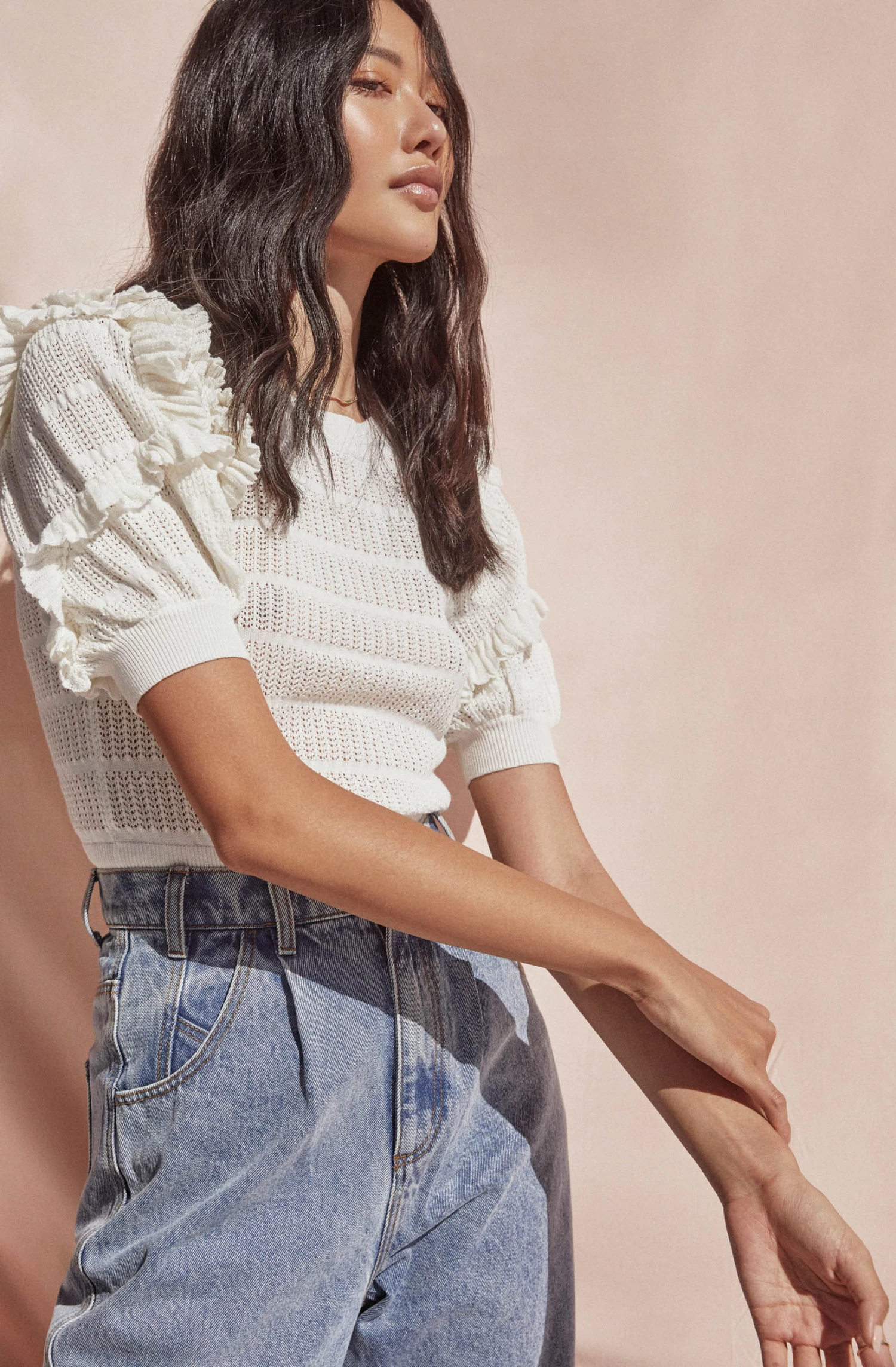 The Sonora Sweater features a pointelle knit design with a round collar. Short puff sleeves feature ruffle trim throughout.