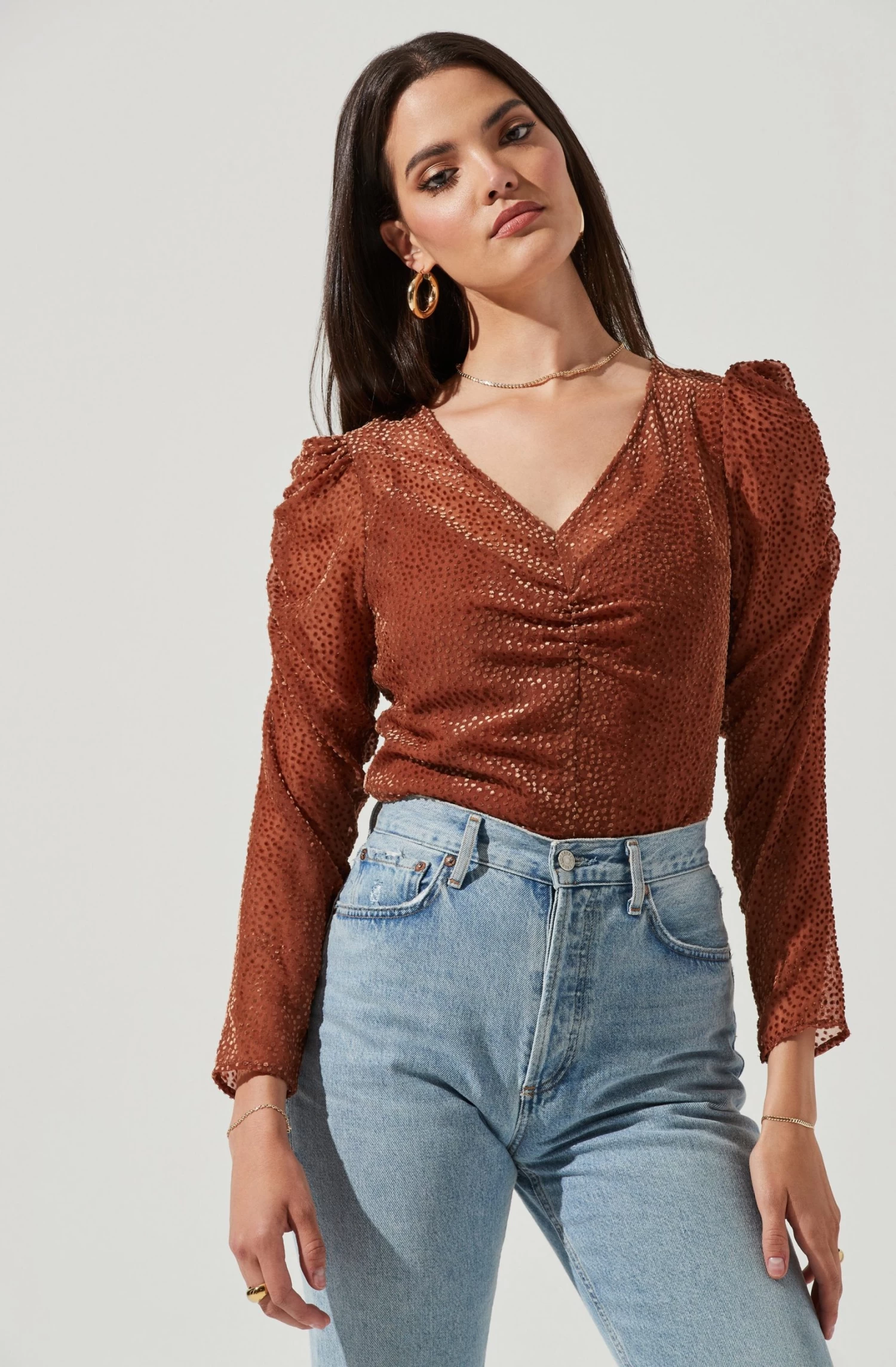 Spotted: your new favorite top! It features a semi-sheer V neckline that descends to a shirred front. Velvet burnout polka dot print throughout. Long sheer sleeves with statement shoulders.