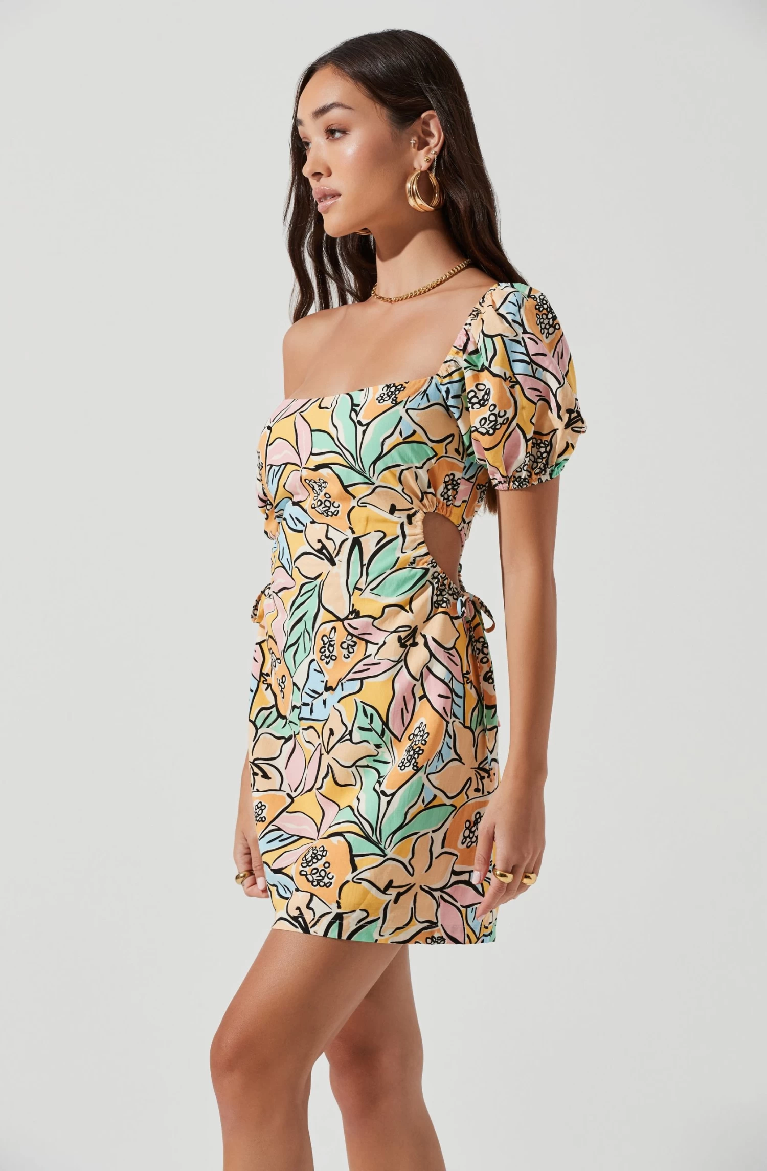 The Talula Dress features a tropical papaya print and starts with a square neckline that descends to a fitted bodice with cinched side cutout accents. Short puff sleeves.