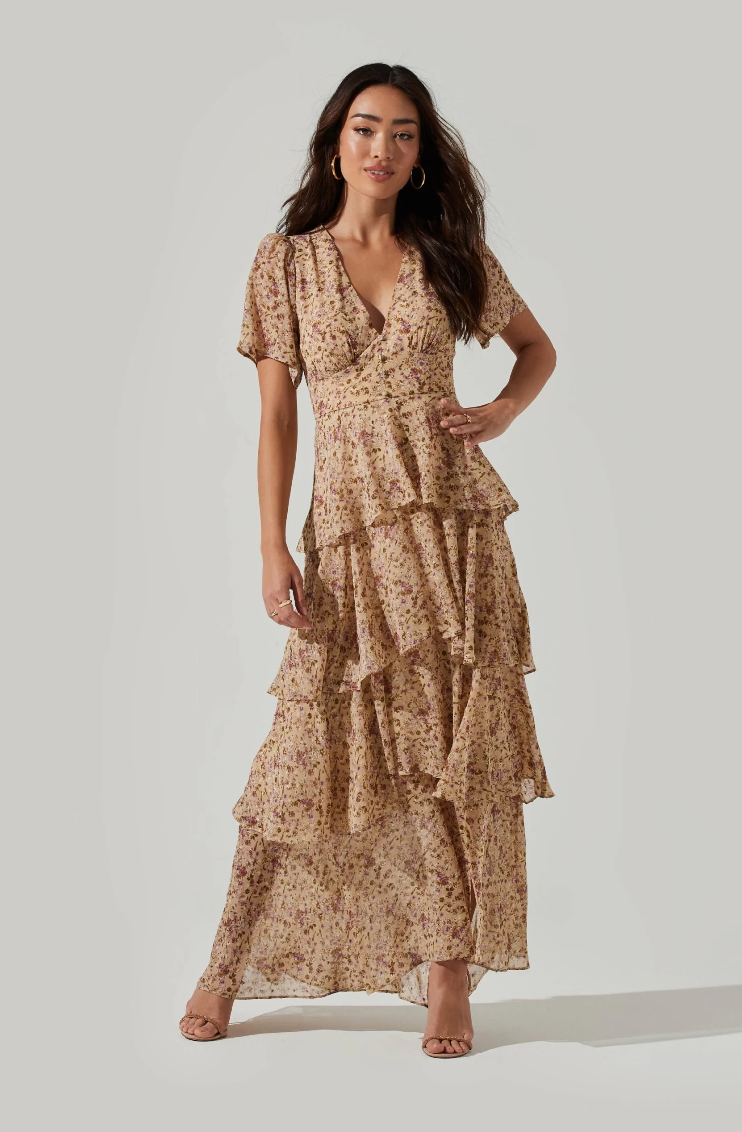 This romantic dress features a plunging neckline that leads to a gathered bust and defined waist. Front button placket adds detail. Tiered ruffle maxi dress. Short flutter sleeves.