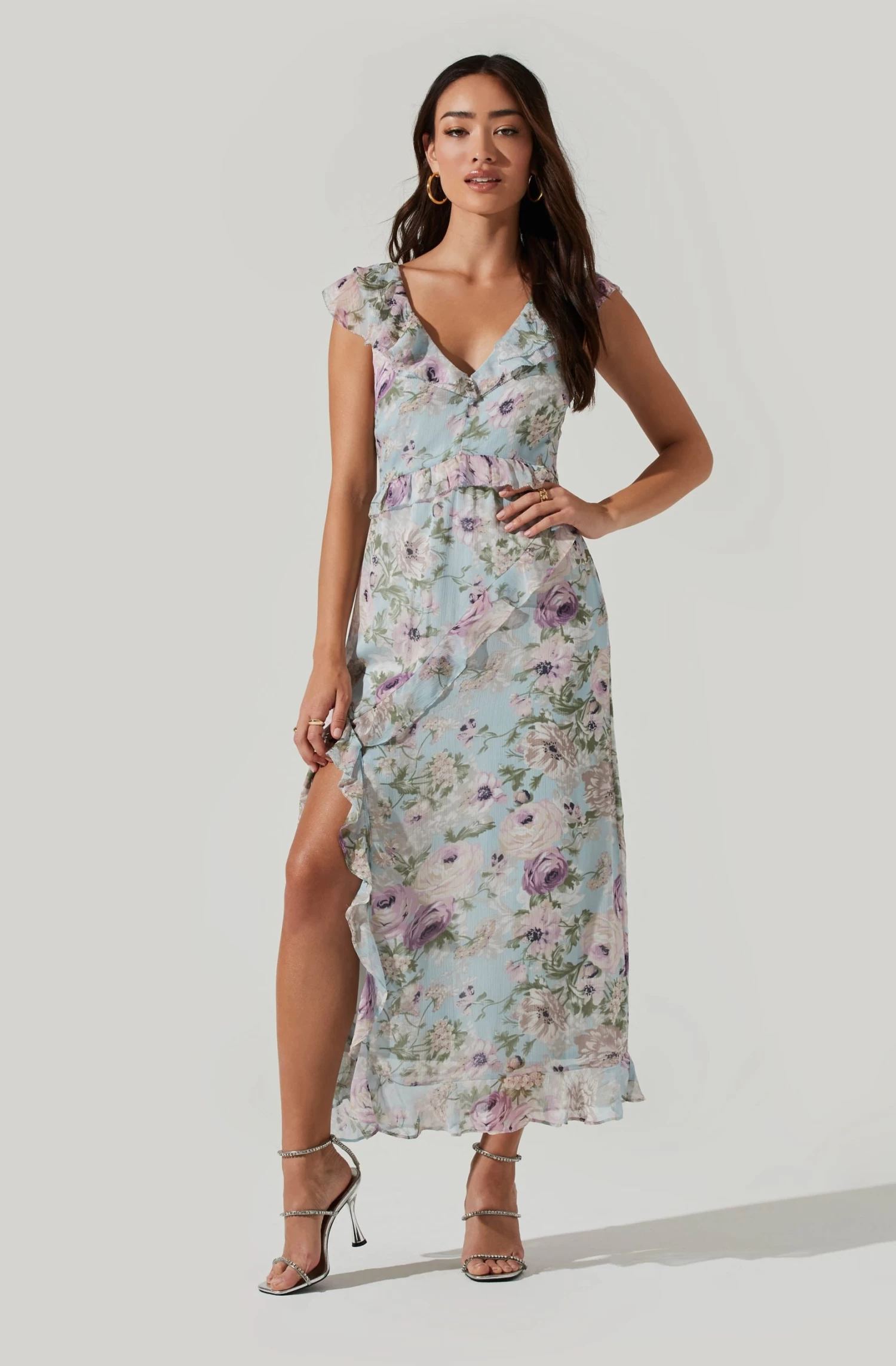It’s all about making a statement. This midi dress features a V neckline with a delicate ruffle trim alone the neck and back. Fitted bodice features a ruffle trim accent along the waist. Midi skirt features a front slit accent with ruffle trim throughout. V cut back.