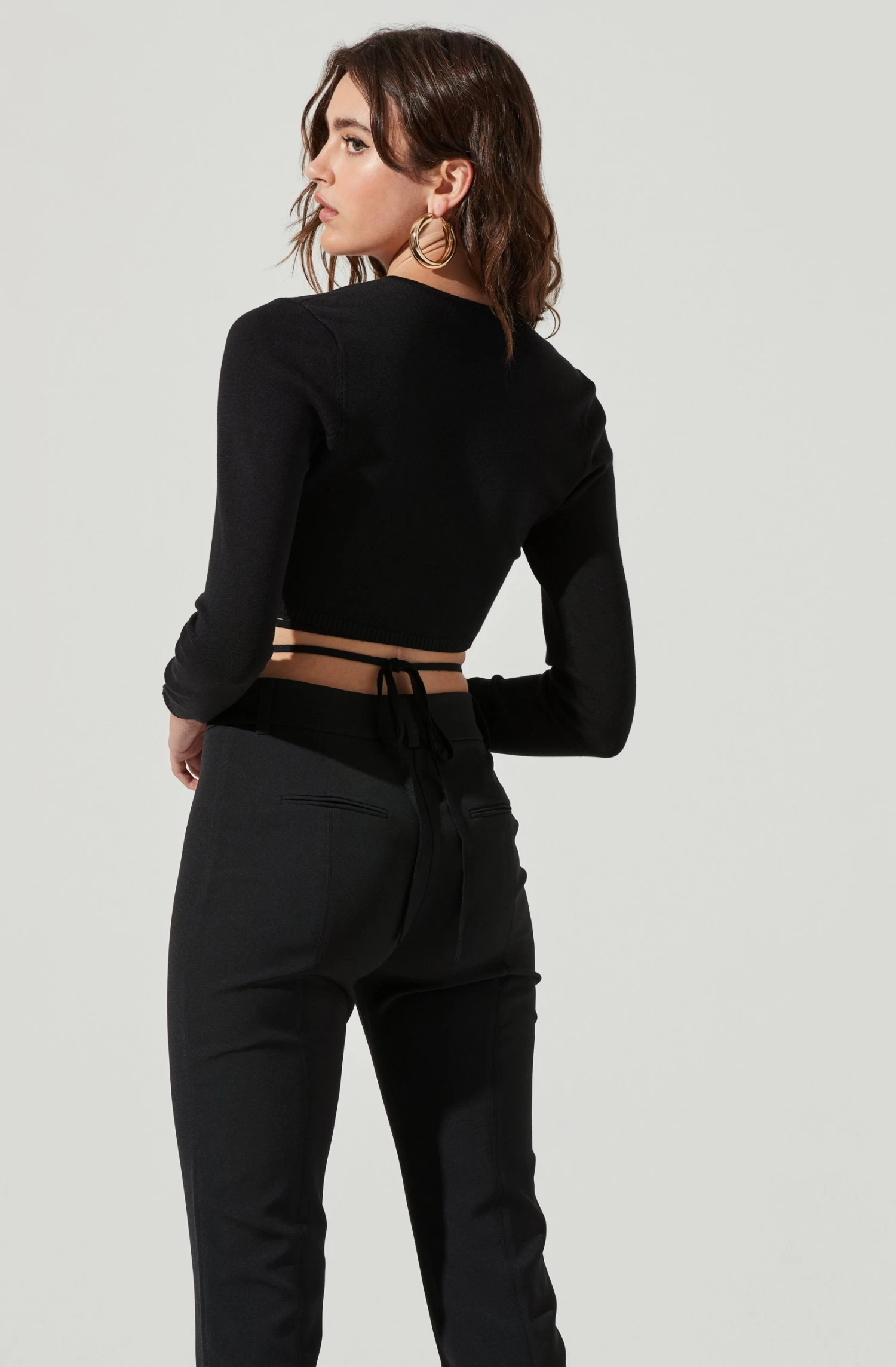 A modern take on the crop sweater. It features a V neckline that leads to a cropped hem with a tie waist detail. Long sleeves.