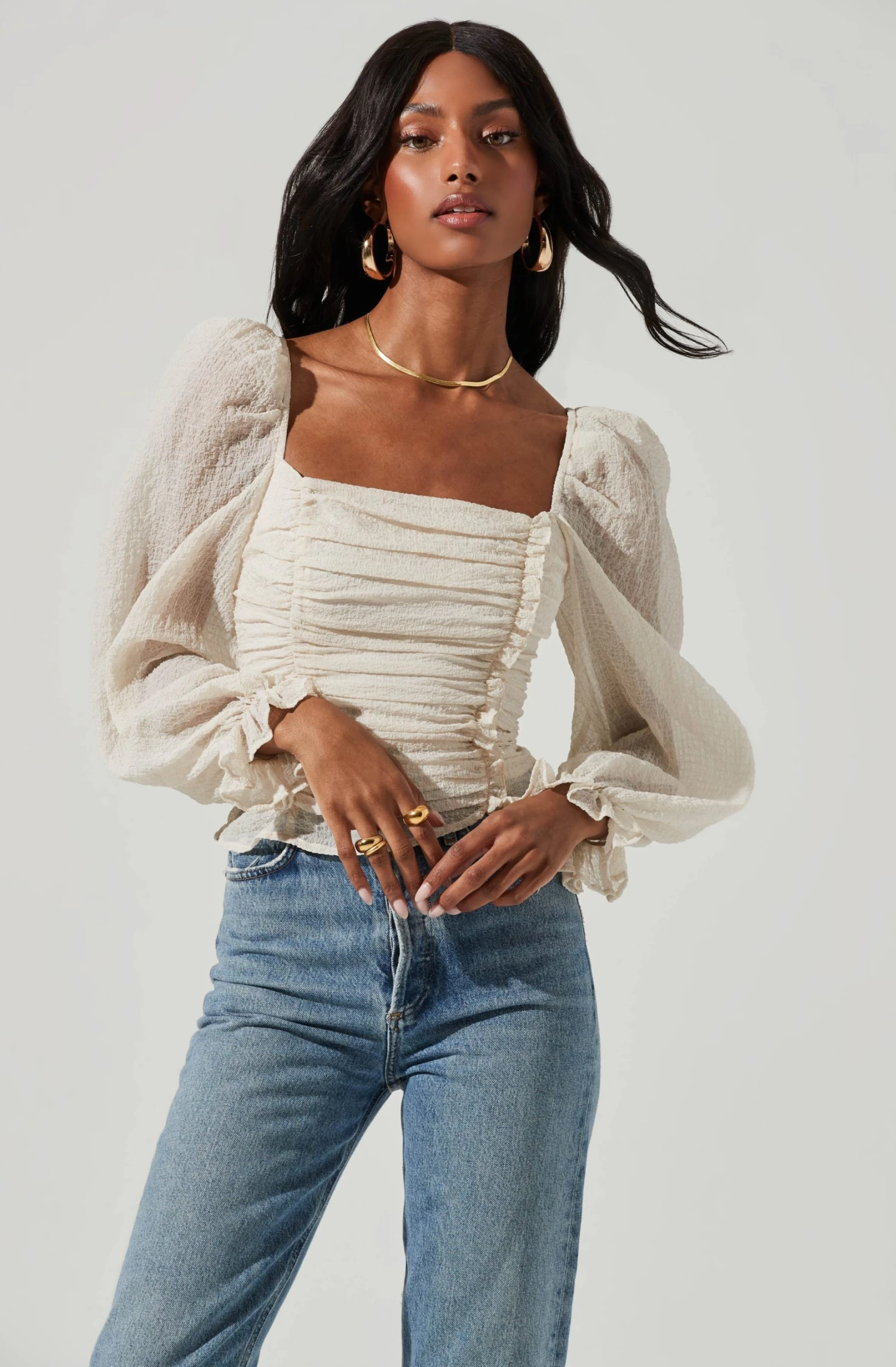 The Tonina Top features a square neckline that leads to a shirred front and slightly scalloped hem. Long puff sleeves with elasticized cuffs. Square cut back with smocking for an ideal fit.